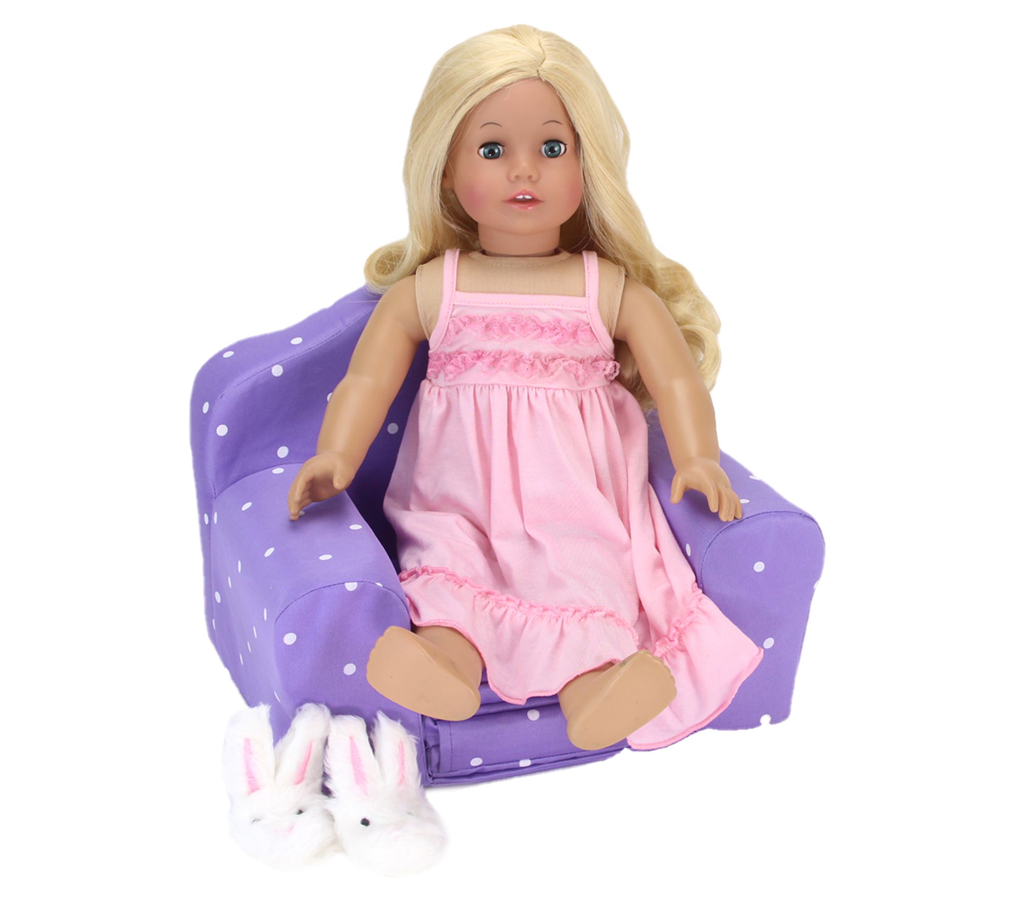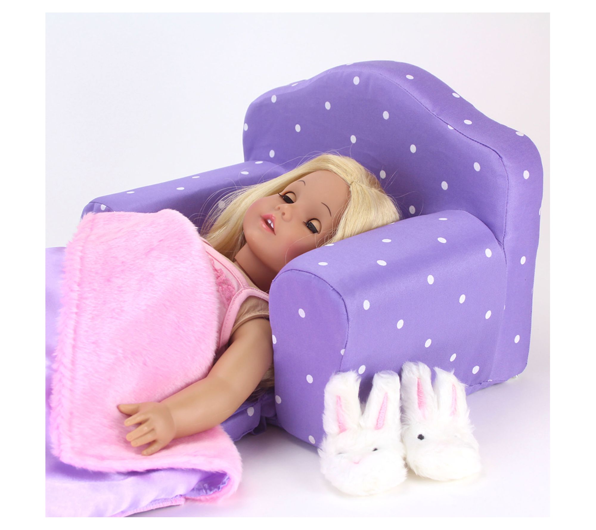 Sweet, chic, and oh-so-comfy, this versatile pull-out chair bed gives your special friends a cozy place to sit or sleep and is perfectly sized for your 18" dolls. From Sophia's.