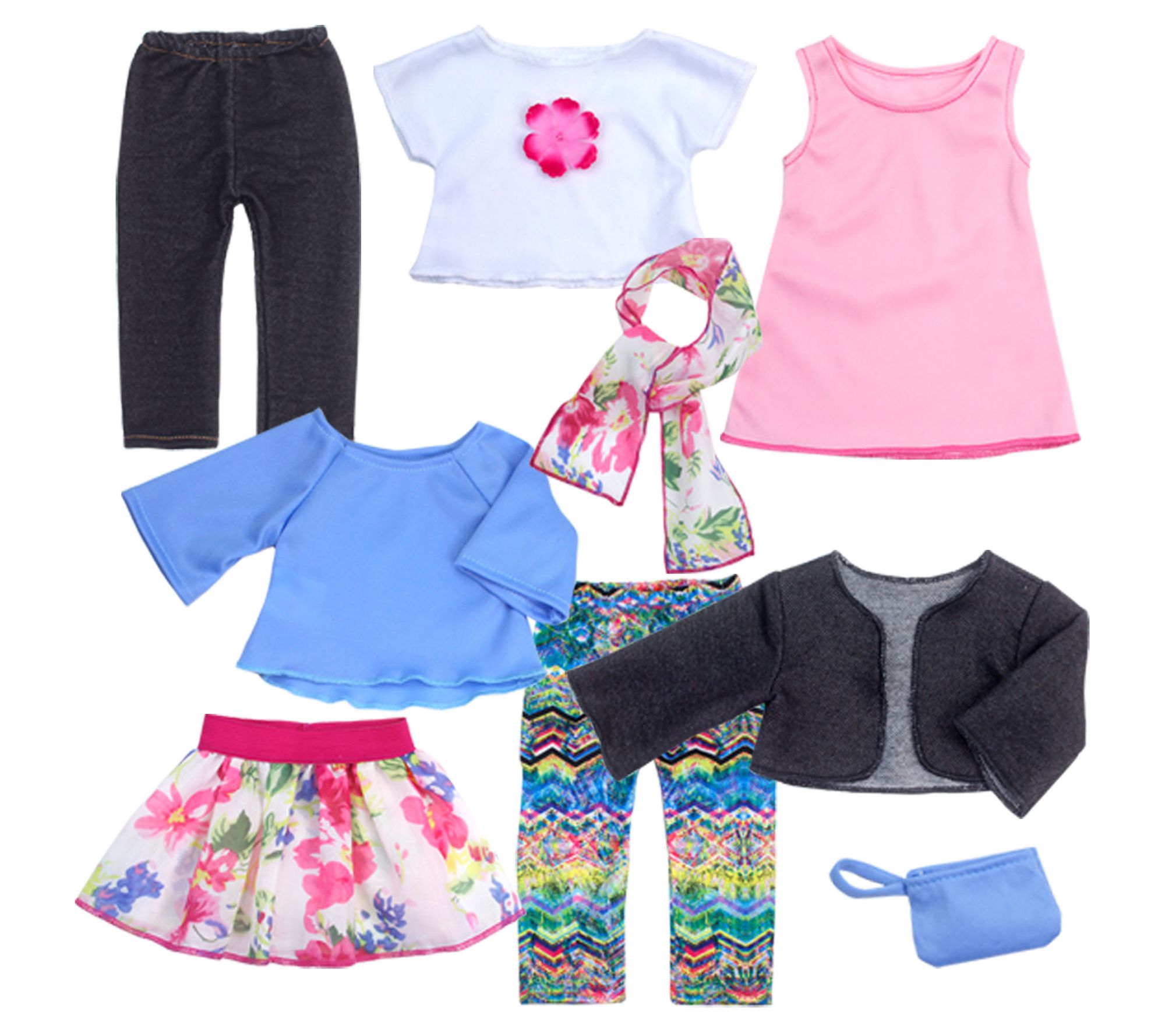 Sophia's by Teamson Kids brings the magic of spring to your child's 18" doll wardrobe with this delightful nine-piece set. Your little one can mix and match pants, skirts, and tops to create endless outfits, perfect for any occasion. From casual jeggings and a 3/4-sleeve shirt to a fancy floral skirt and embellished top, this set has it all. From Sophia's.
