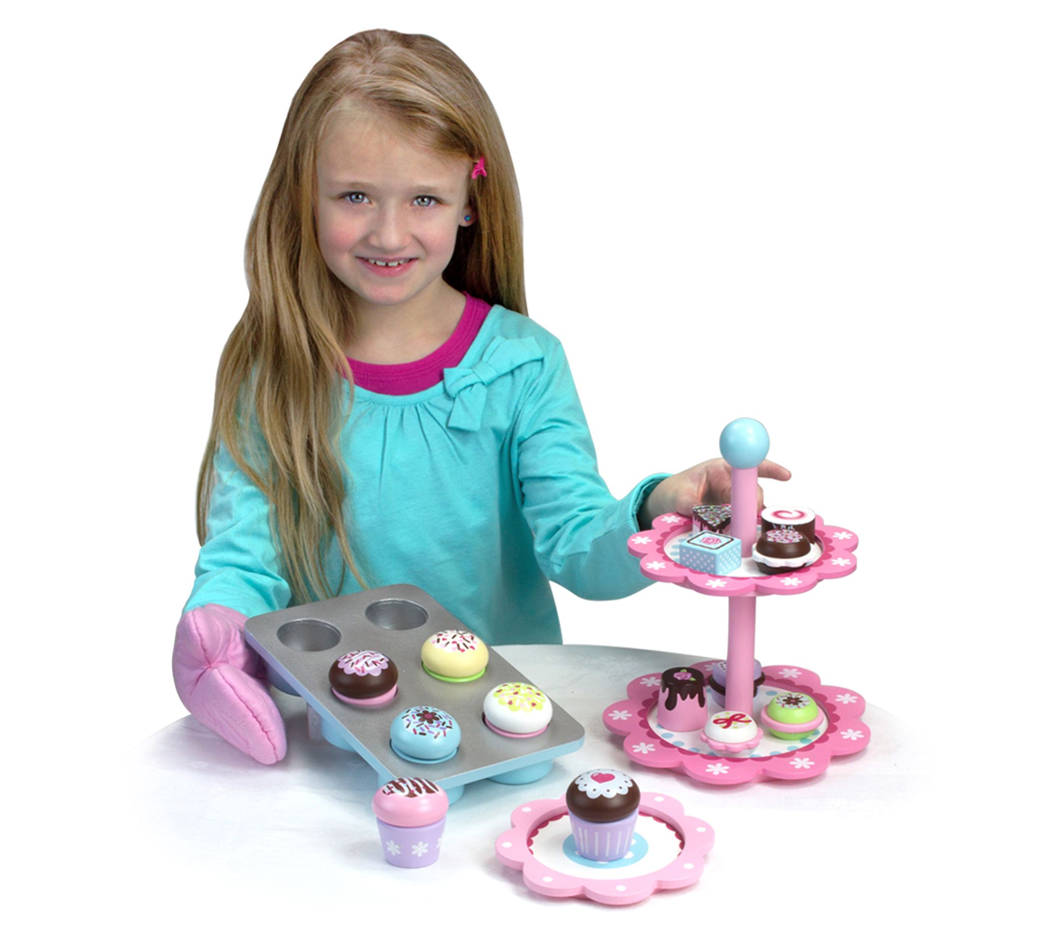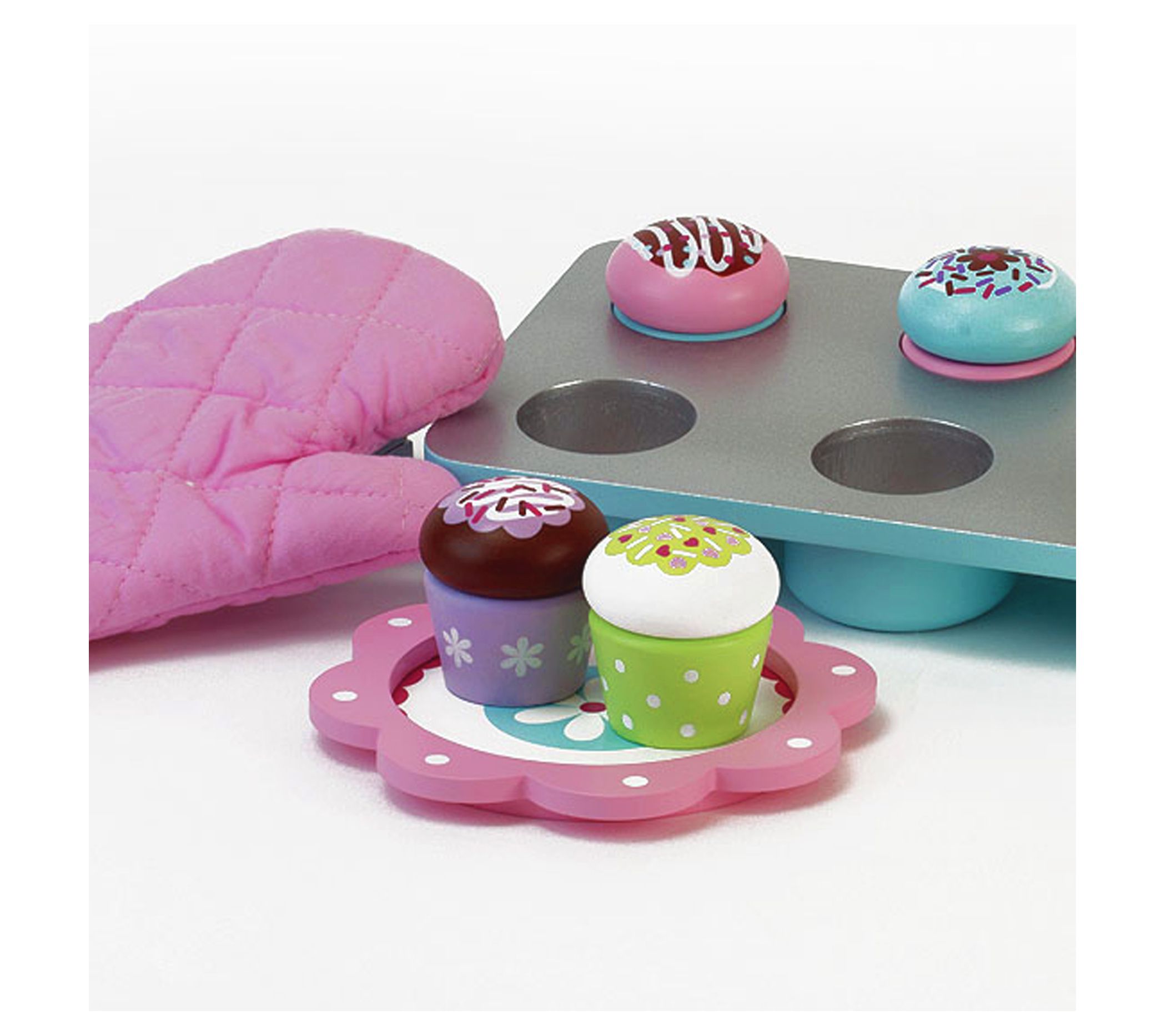 • Includes six cupcake tops, six cupcake bottoms, tray, plate, and oven mitt