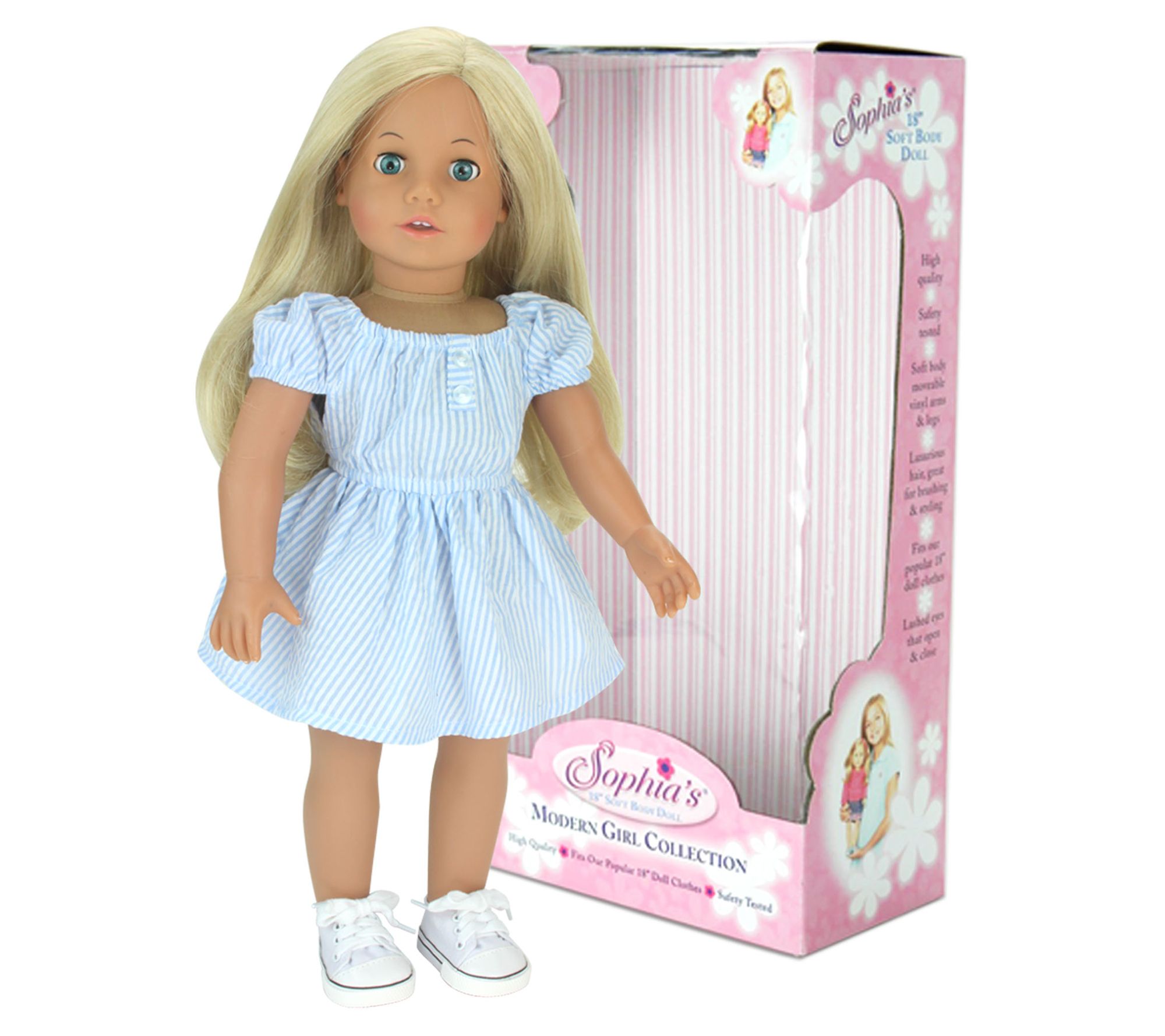 Sophia's by Teamson Kids brings you the posable 18" soft-bodied vinyl doll, perfect for endless imaginative play. With beautiful blinking eyes, wavy hair, and French-tipped nails, this doll is sure to become your child's next best friend. Compatible with most 18" doll outfits and shoes, Sophia is dressed in a casual dress, underwear, and shoes. From Sophia's.