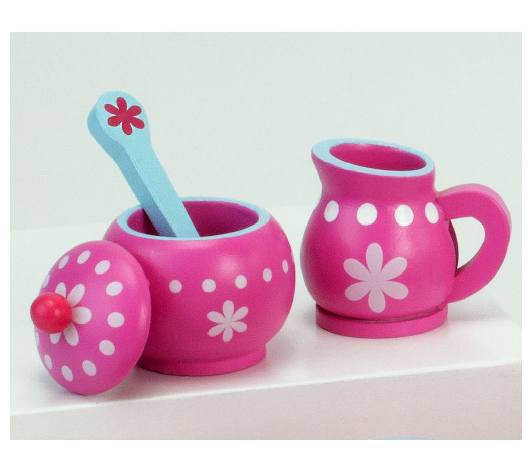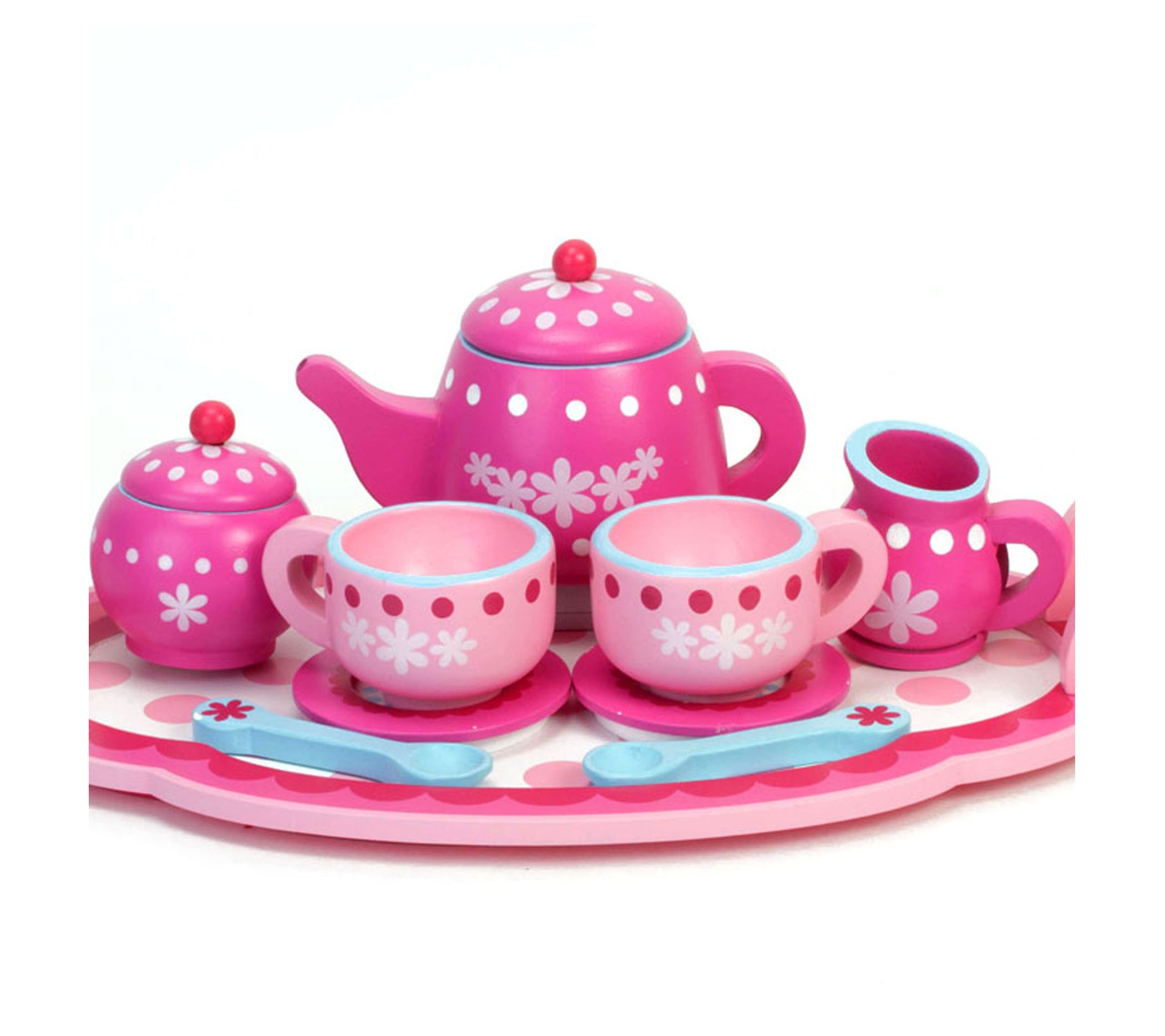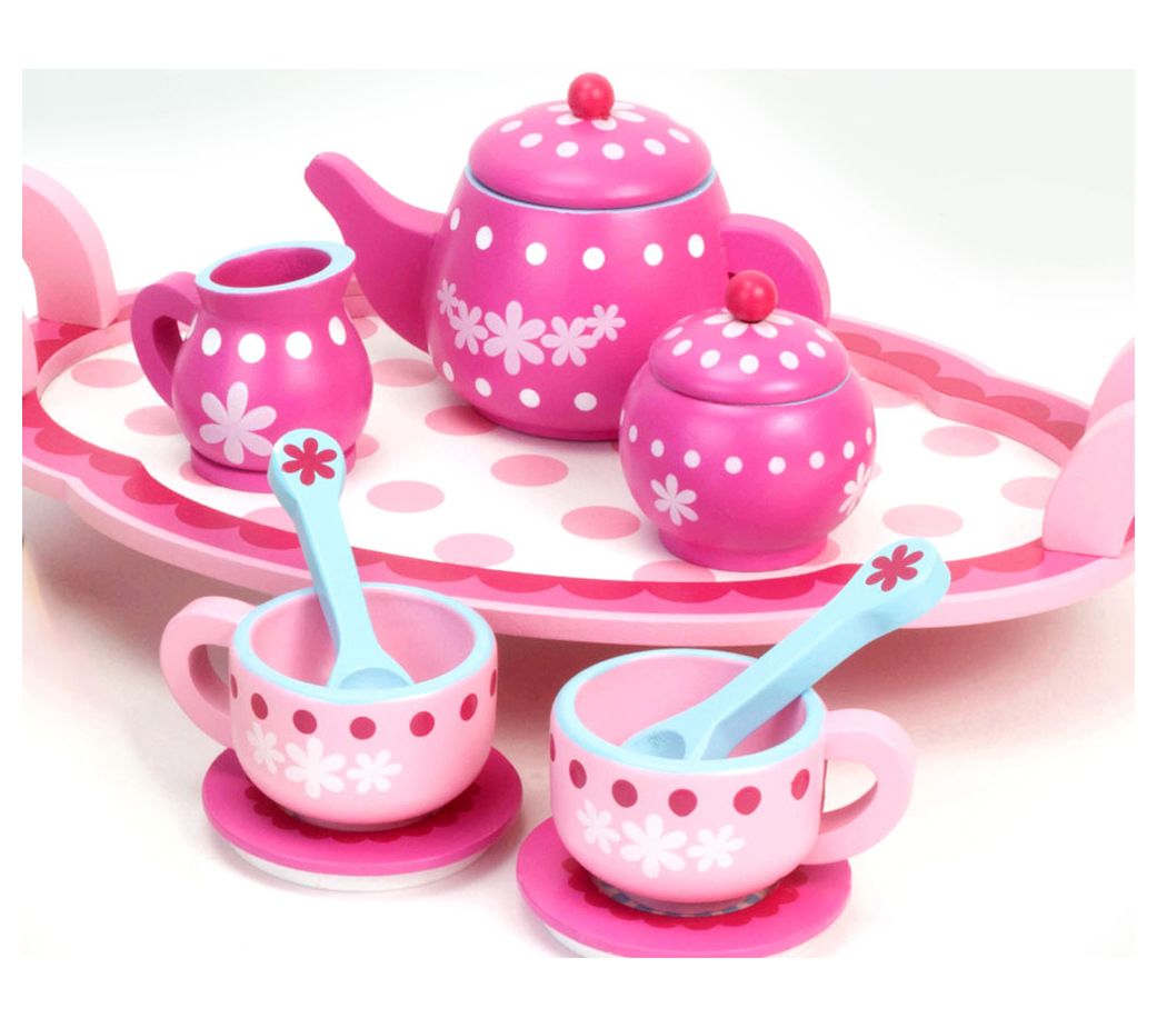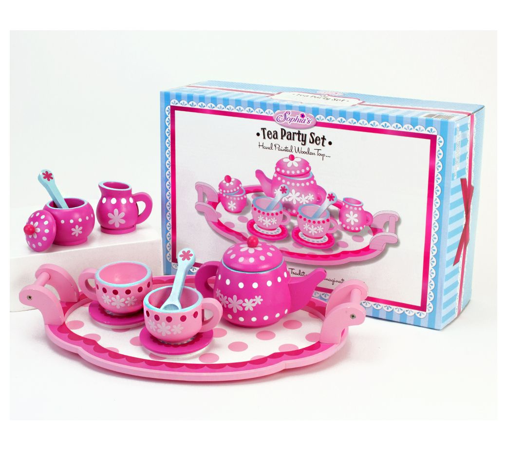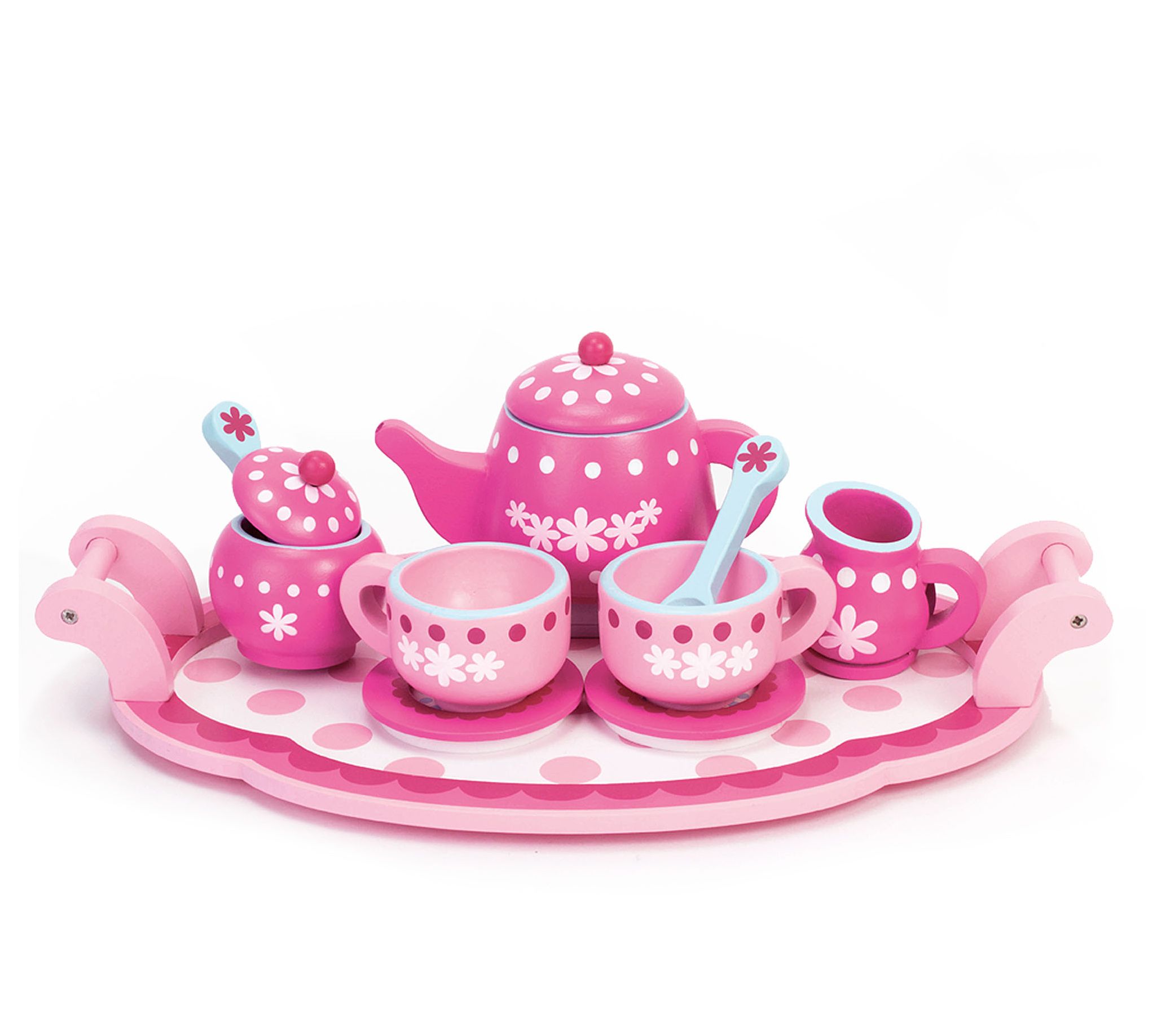 Invite a favorite stuffed animal or doll to a lovely afternoon party with this beautiful wooden tea set, featuring everything needed for a great make-believe teatime including a tray for stylish delivery. From Sophia's.