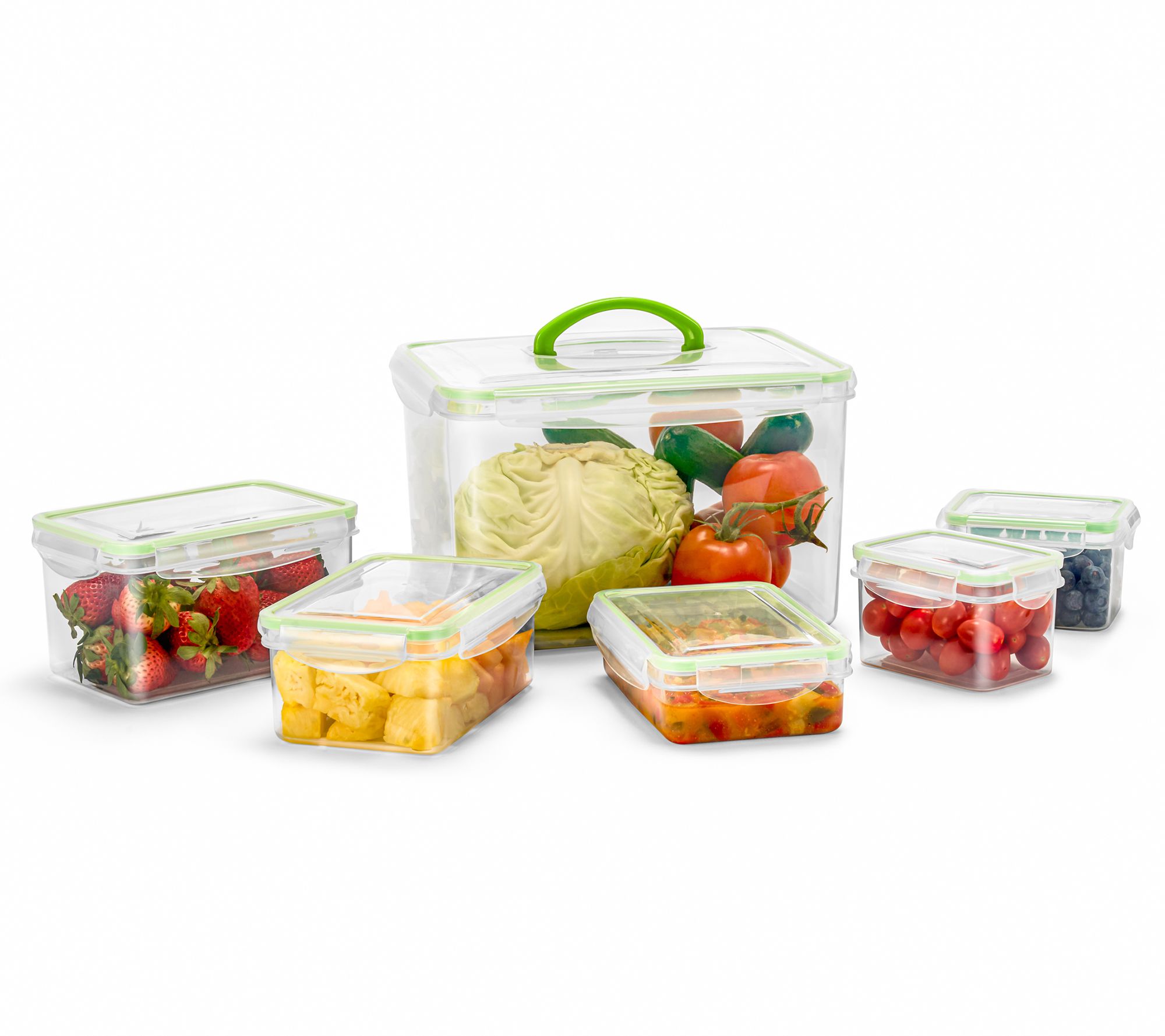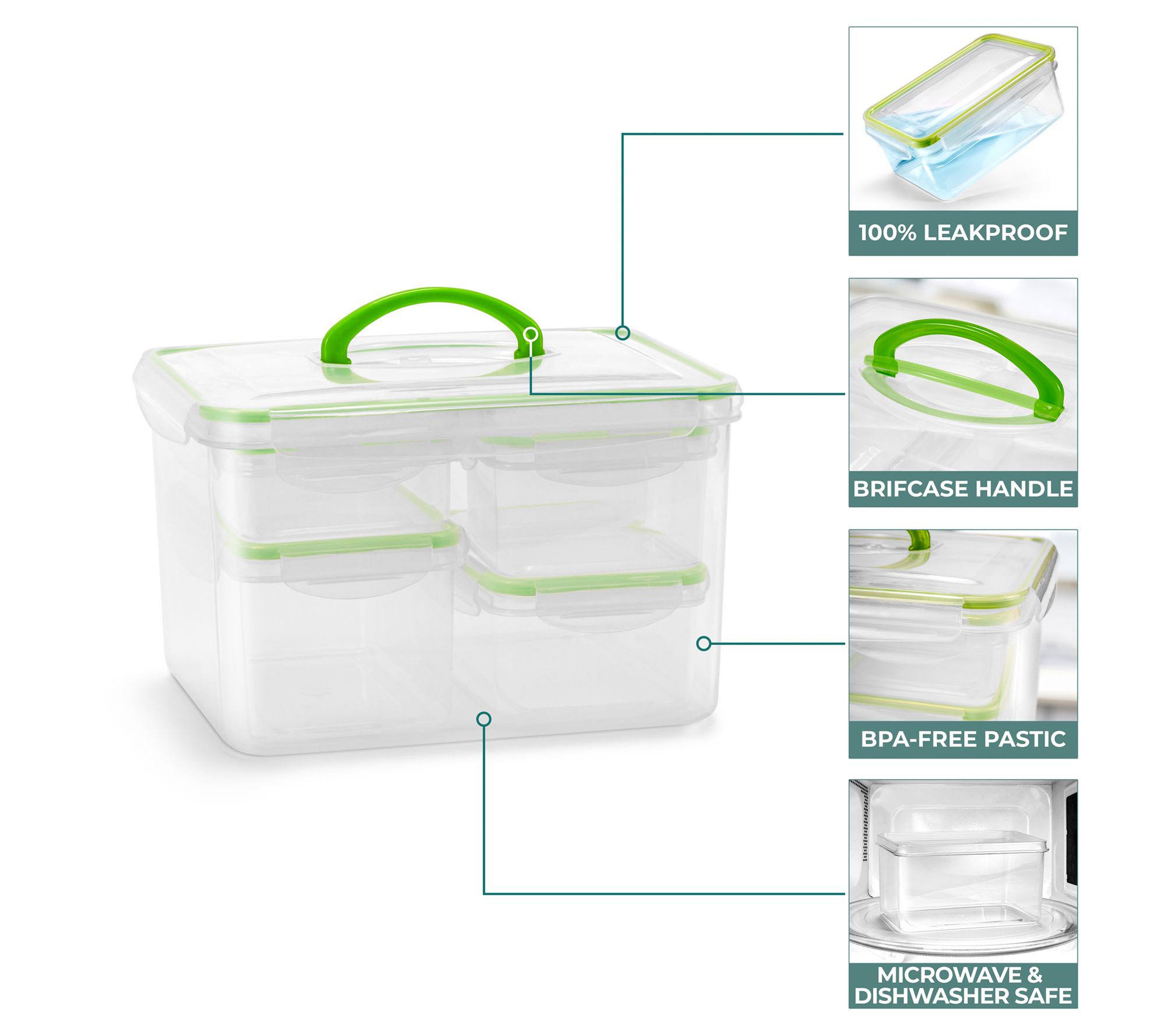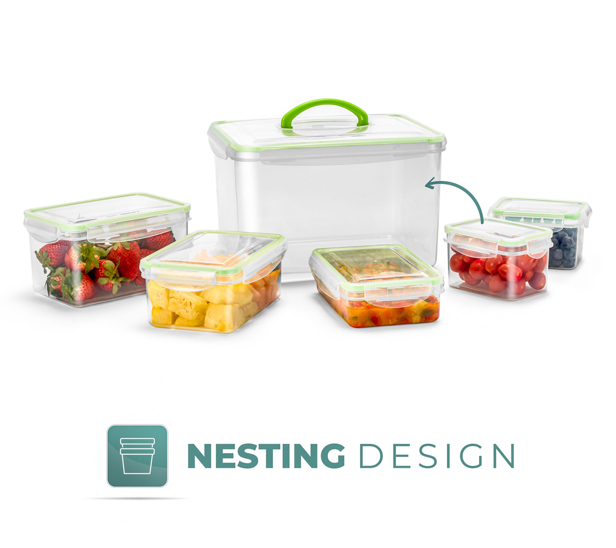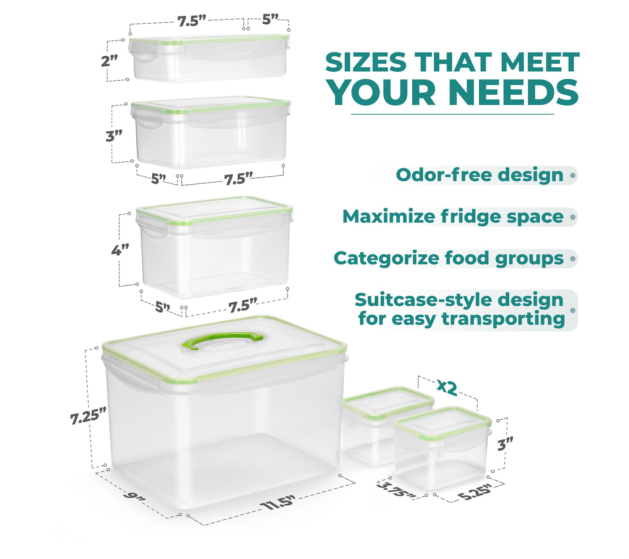 • Includes two small storage containers with lids, one medium storage container with lid, one large storage container with lid, one flat storage container with lid, and one extra-large storage container with lid