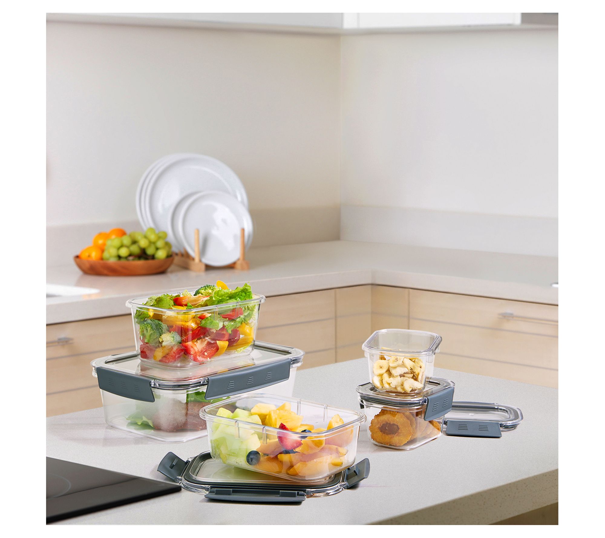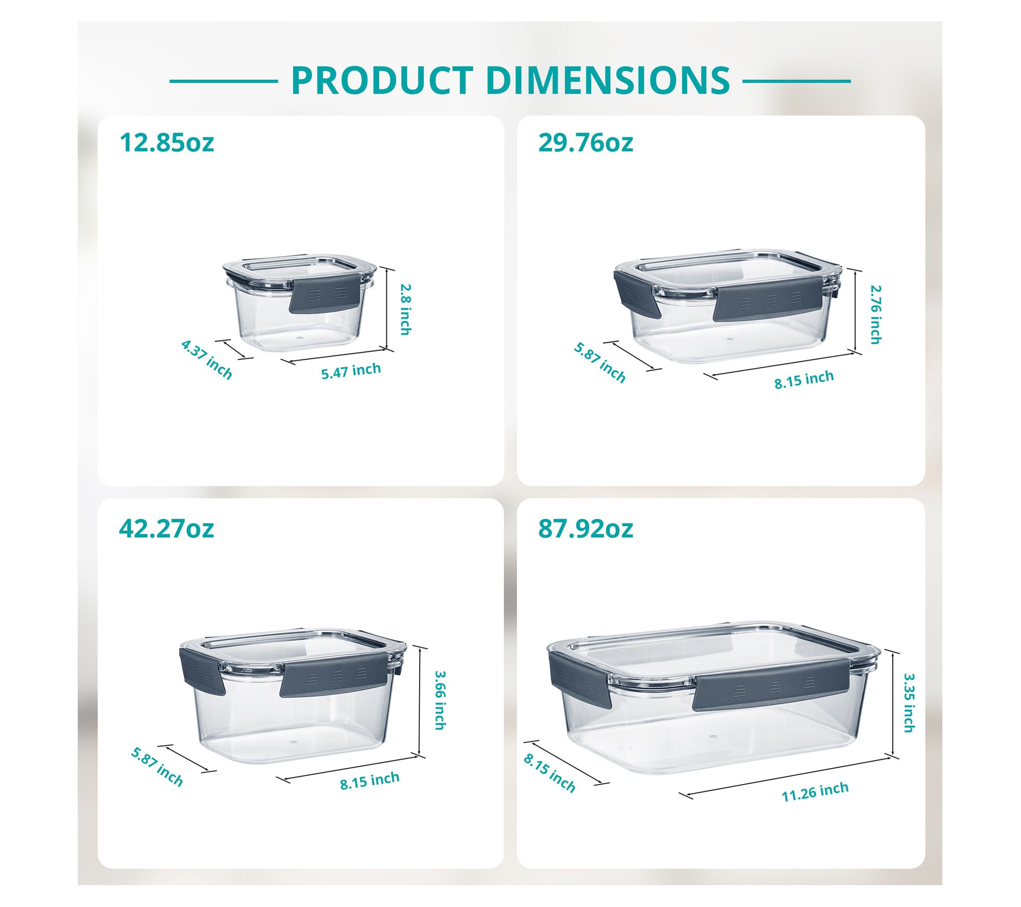 • Measurements: Small container 5.47" x 4.37" x 2.8"; Medium container 8.15" x 5.8" x 2.76"; Large container 8.15" x 5.87" x 3.66"; Extra-large container 11.26" x 8.15" x 3.35"