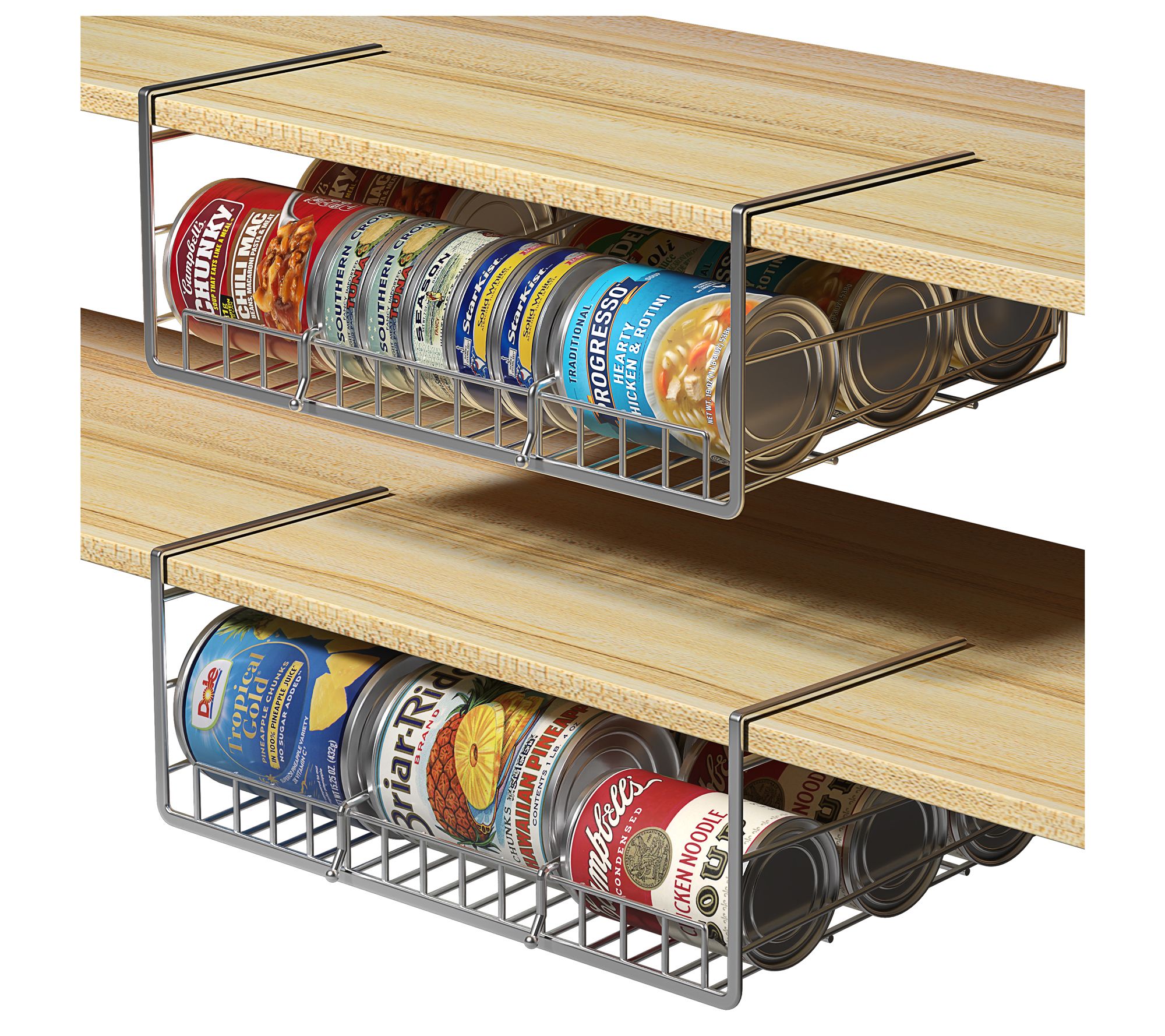 Transform your kitchen storage with this set of two versatile under-cabinet can organizers. Perfect for maximizing space in your kitchen, pantry, or even your RV, these compact shelves are built to keep your canned goods neatly arranged. The angled design ensures cans roll forward for easy access, while sturdy adhesive or screw installation options provide a secure fit. Made of durable metal, these shelves cater to a variety of storage needs, making tidying up a breeze. From Sorbus.
