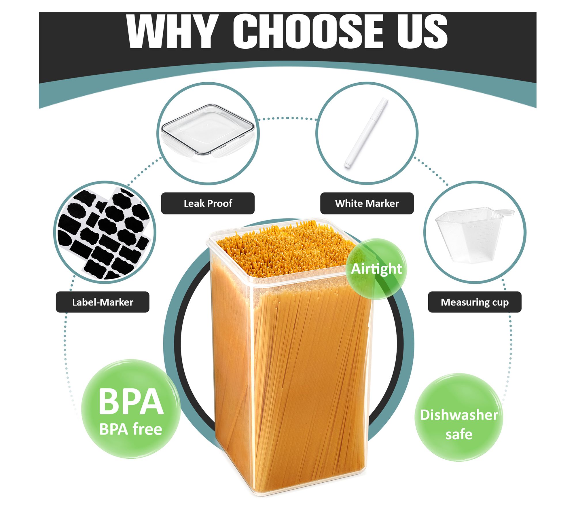• Includes four food storage dispensers with lids, one measuring spoon, two sheets of labels, and one chalkboard marker