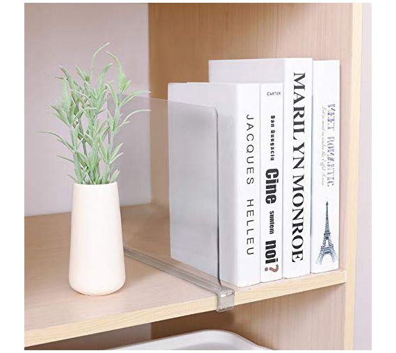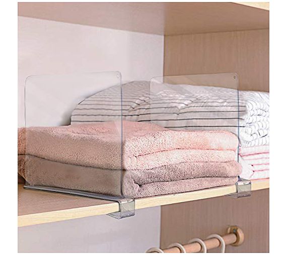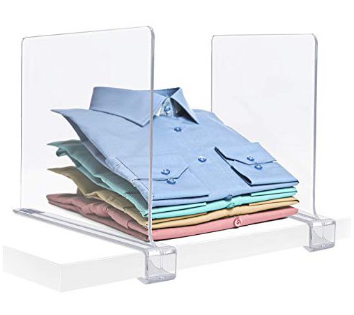Say goodbye to cluttered closets and maximize your storage space with this set of two shelf dividers. Allows you divide one shelf into different functional areas. Neatly stack clothing, handbags, books, linens, and more into a tidy pile. No tools needed, simply slip onto your shelf and start organizing. From Sorbus.