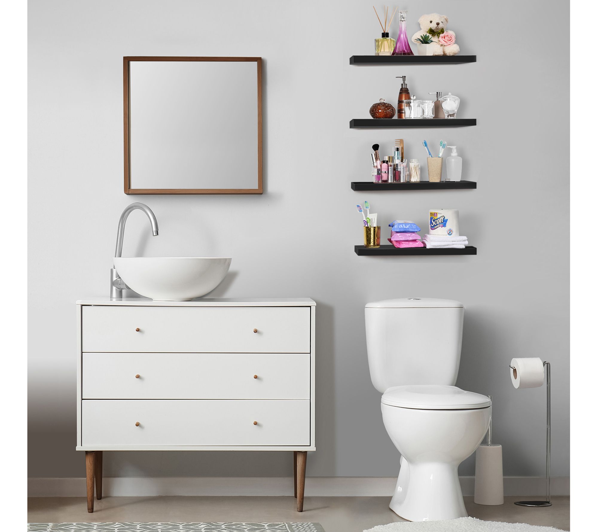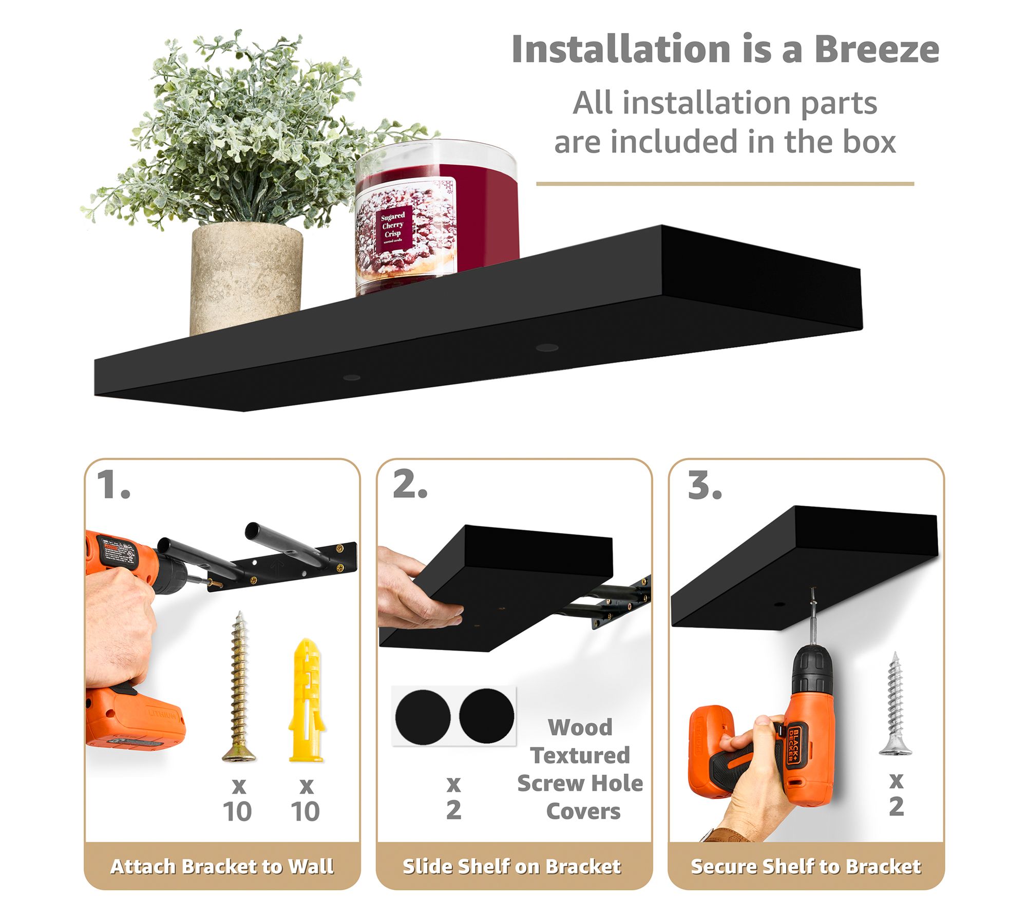 • Includes four wooden shelves, mounting hardware, and assembly instructions