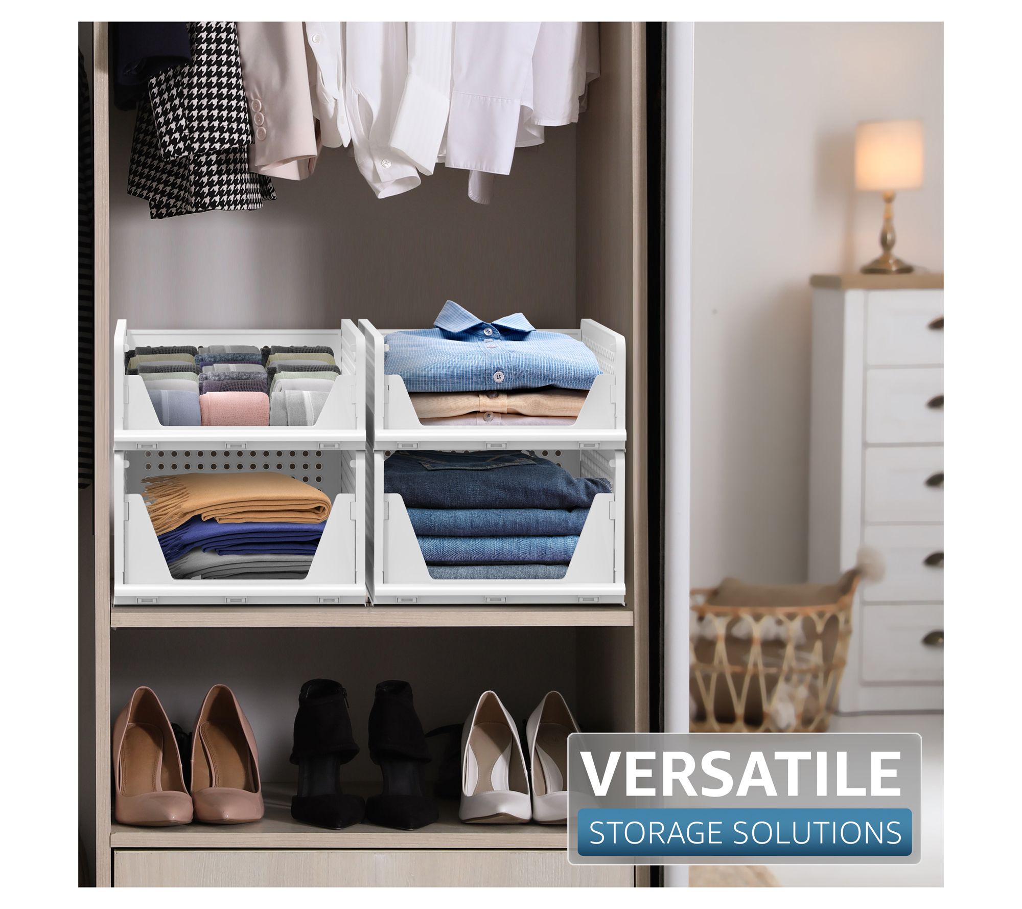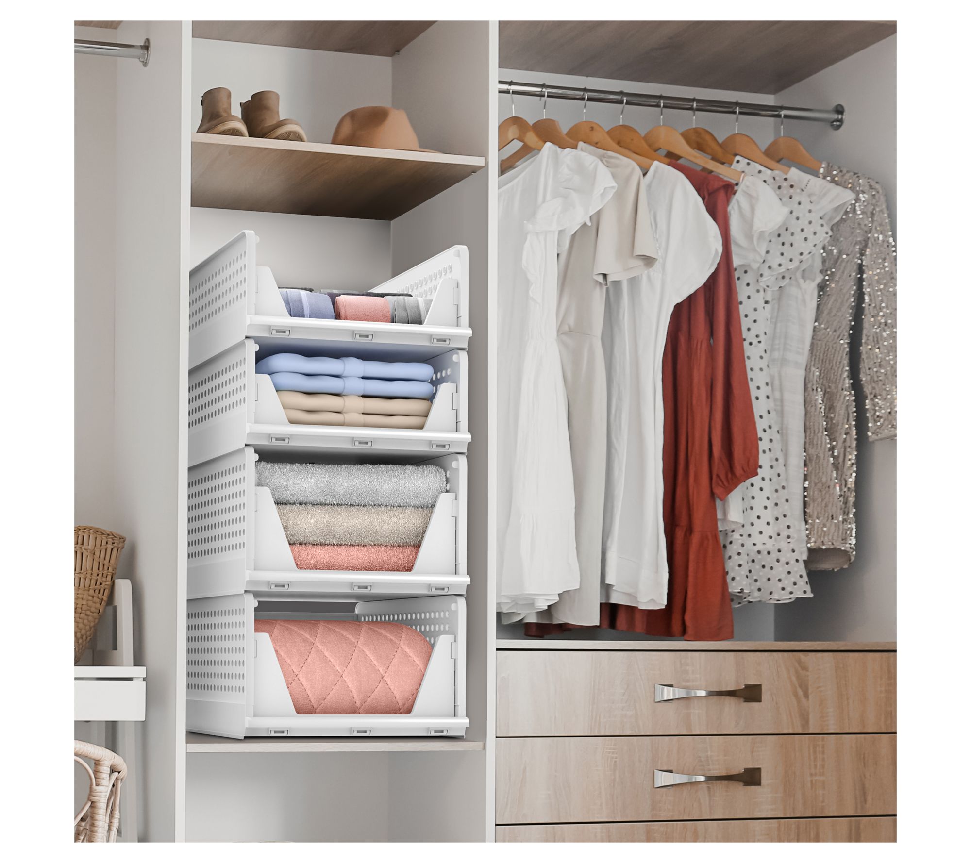Upgrade your space with the Sorbus Closet Shelf Organizer. This set of four stackable baskets is perfect for maximizing vertical space in closets, bedrooms, bathrooms, or pantries. Whether you're organizing clothes, linens, toys, or office supplies, these versatile containers can handle it. From Sorbus.