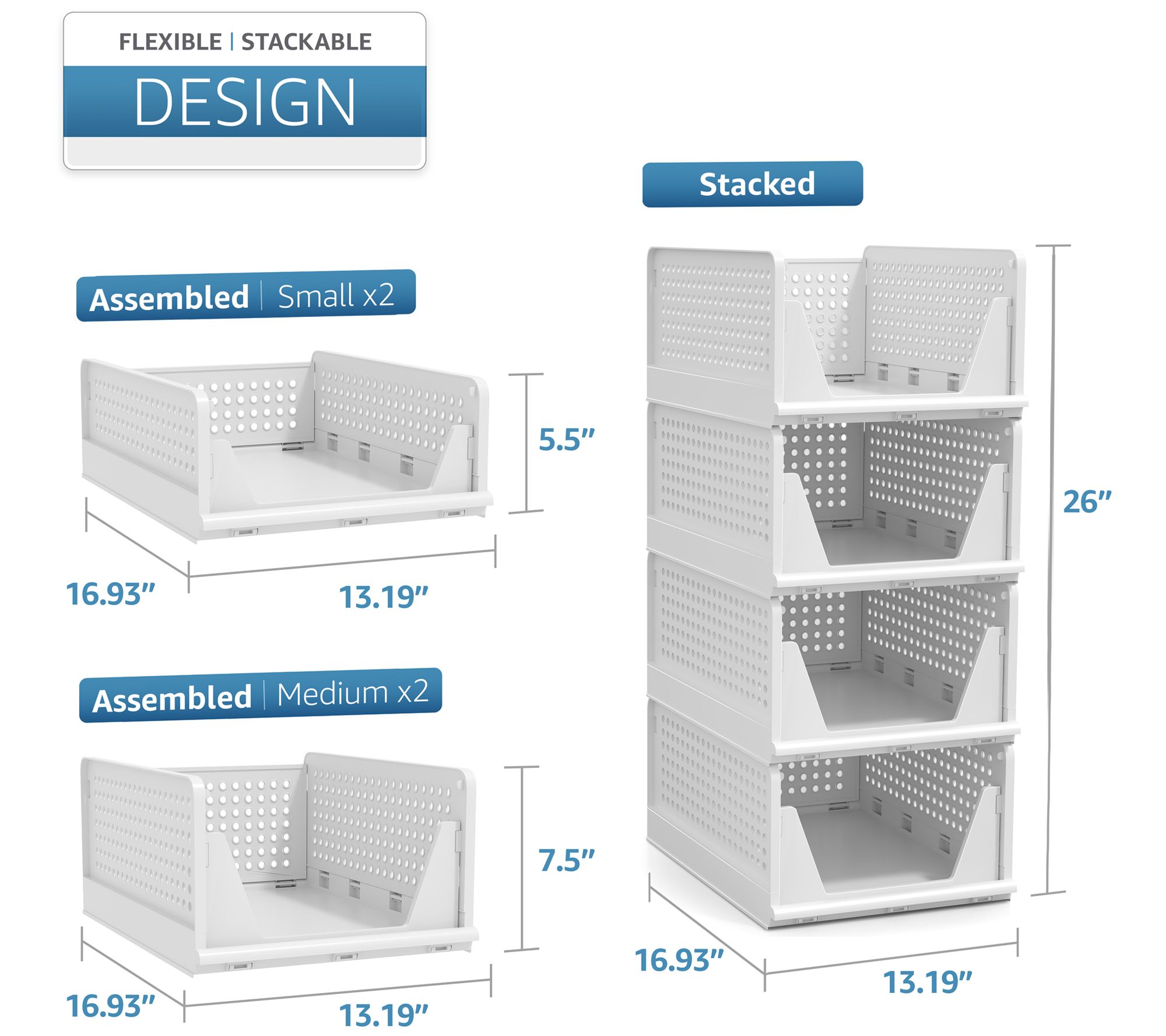 • Stackable baskets ideal for neatly organizing clothes, linens, toys