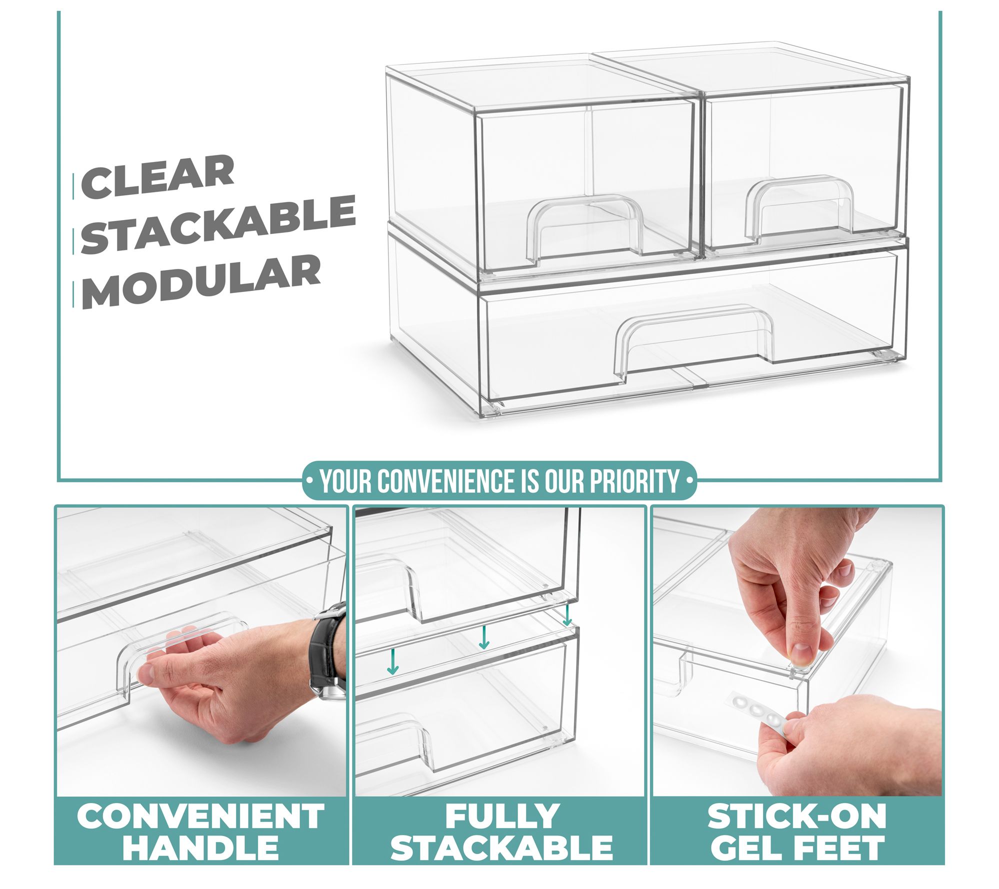 he Sorbus Clear Organizer Drawers offer a versatile, stackable design to maximize storage and customize your space. Perfect for organizing countertops, cabinets, or under-sink areas, this acrylic system is ideal for makeup, pantry items, office supplies, and more. With smooth-gliding pull-out drawers and built-in handles, accessing essentials is effortless.These durable and stylish organizers blend seamlessly with any decor and are easy to clean with soap and warm water. From Sorbus.