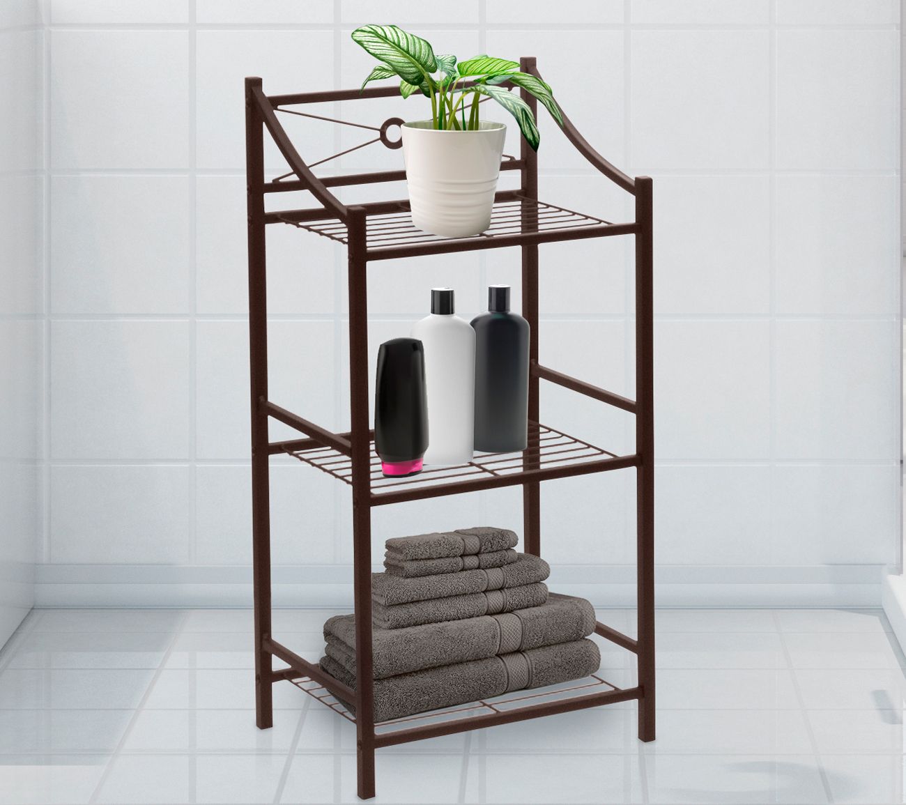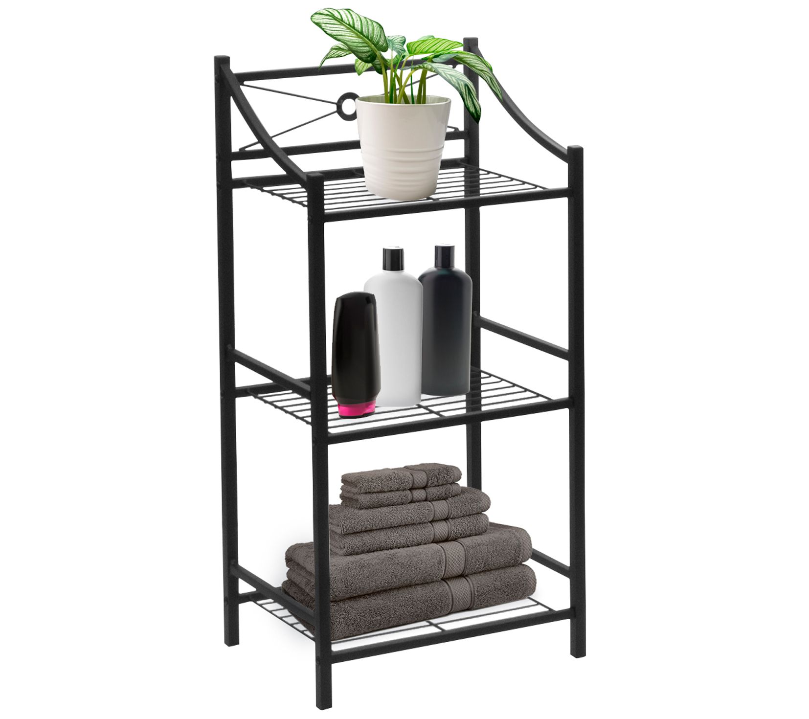 Open shelving puts a contemporary spin on your decor and keeps everyday items within reach. Use this three-tier bathroom storage shelf for vanity essentials, or welcome guests with luxury items and folded, plush towels to pamper themselves while they stay. From Sorbus.
