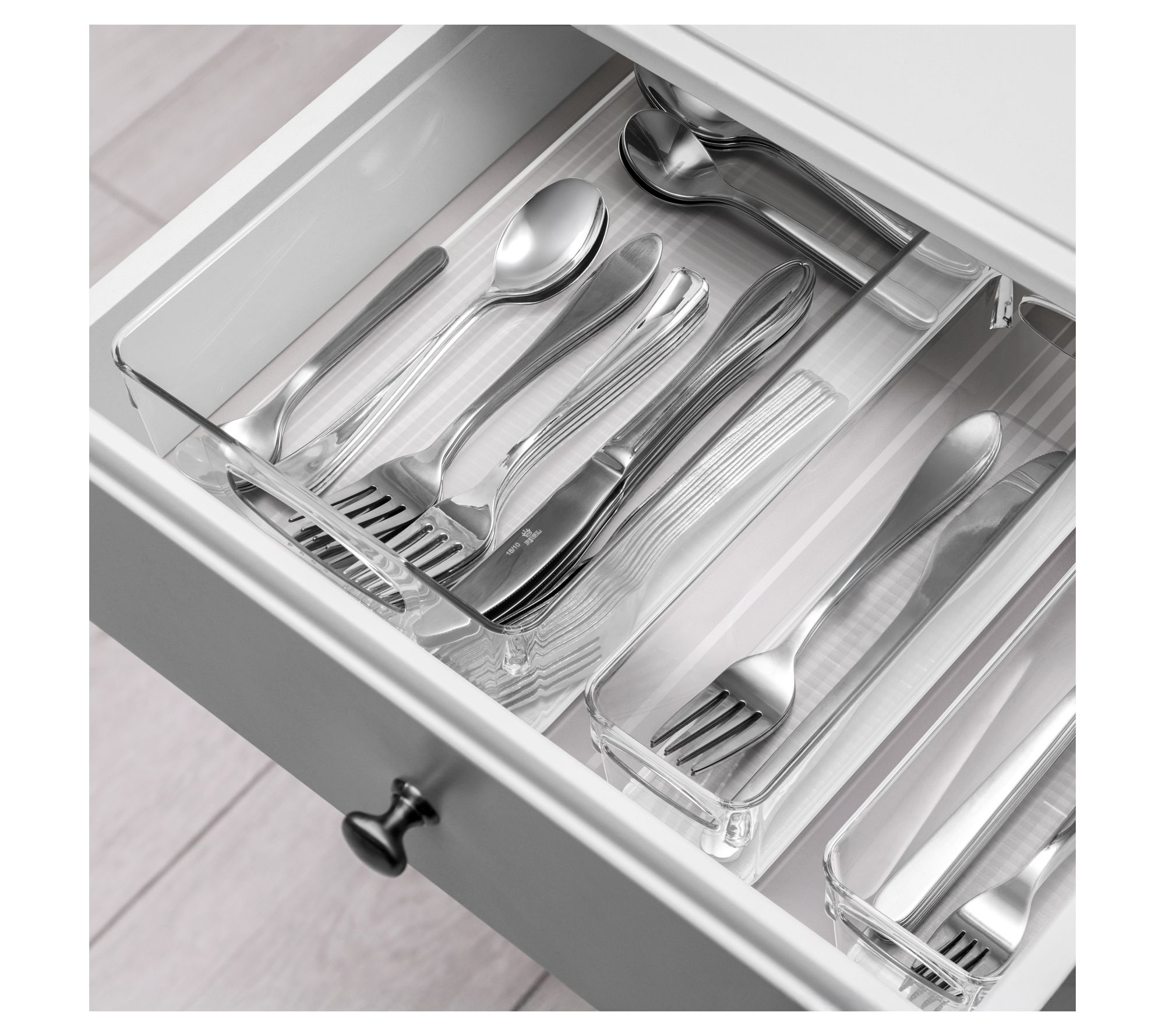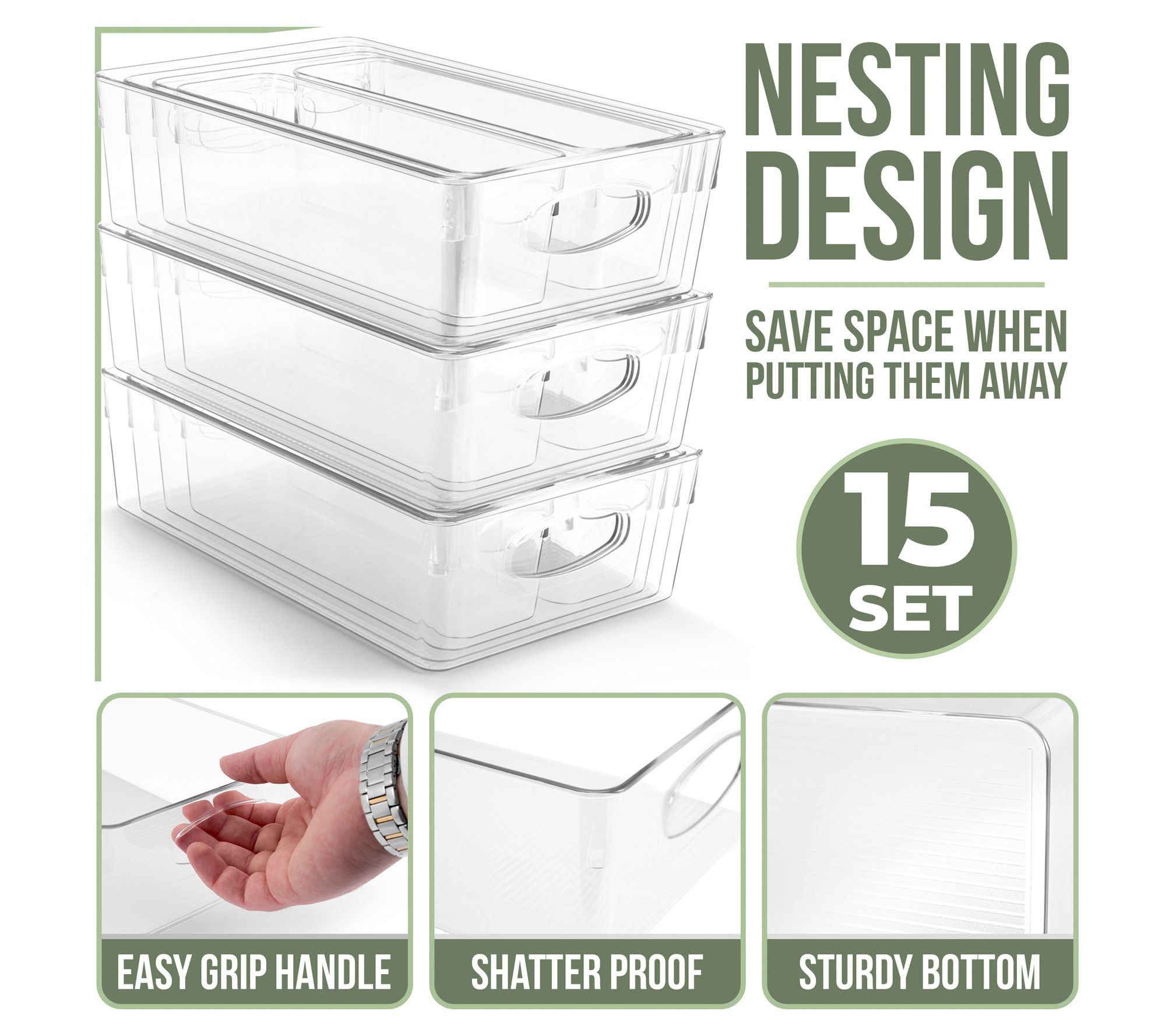 Includes 15 clear plastic storage bins: six small, three medium, three large, and three x-large