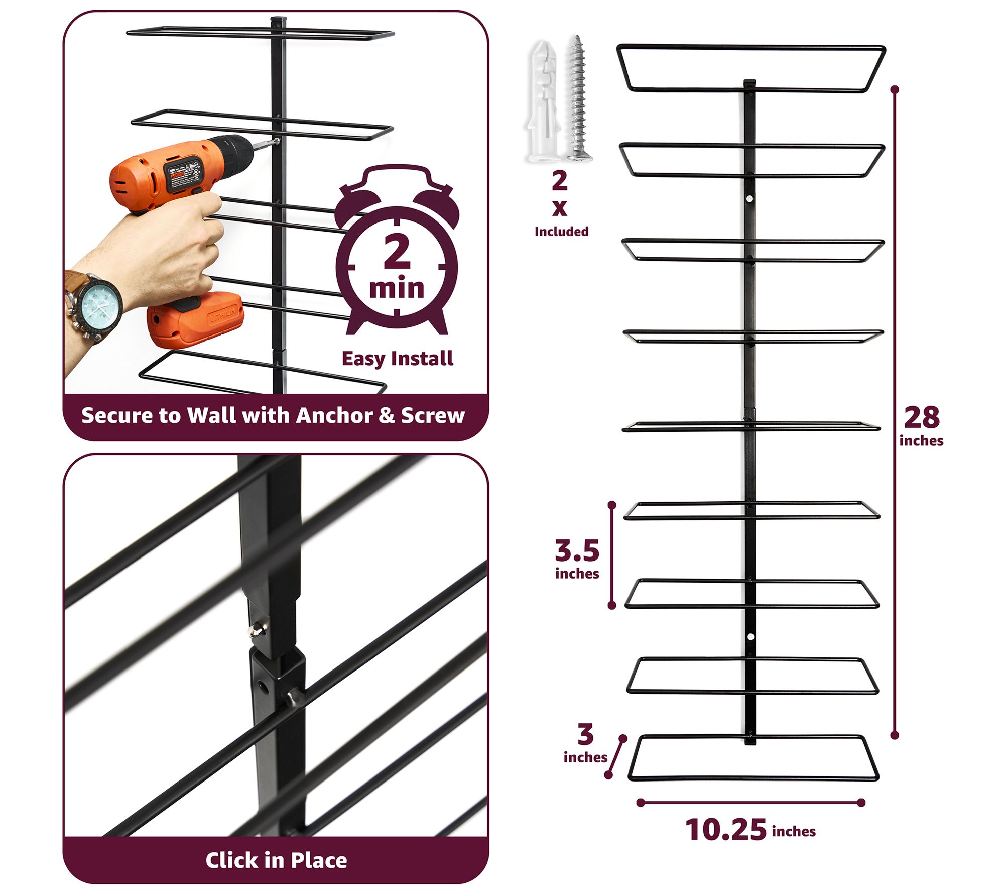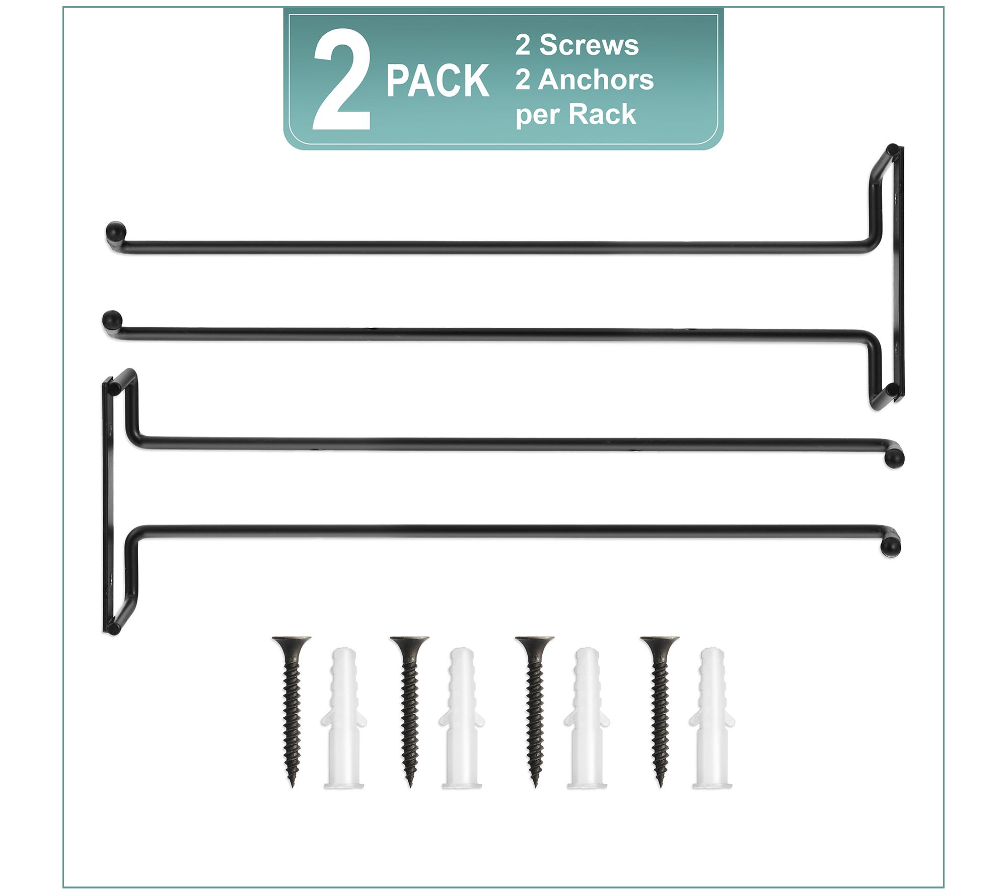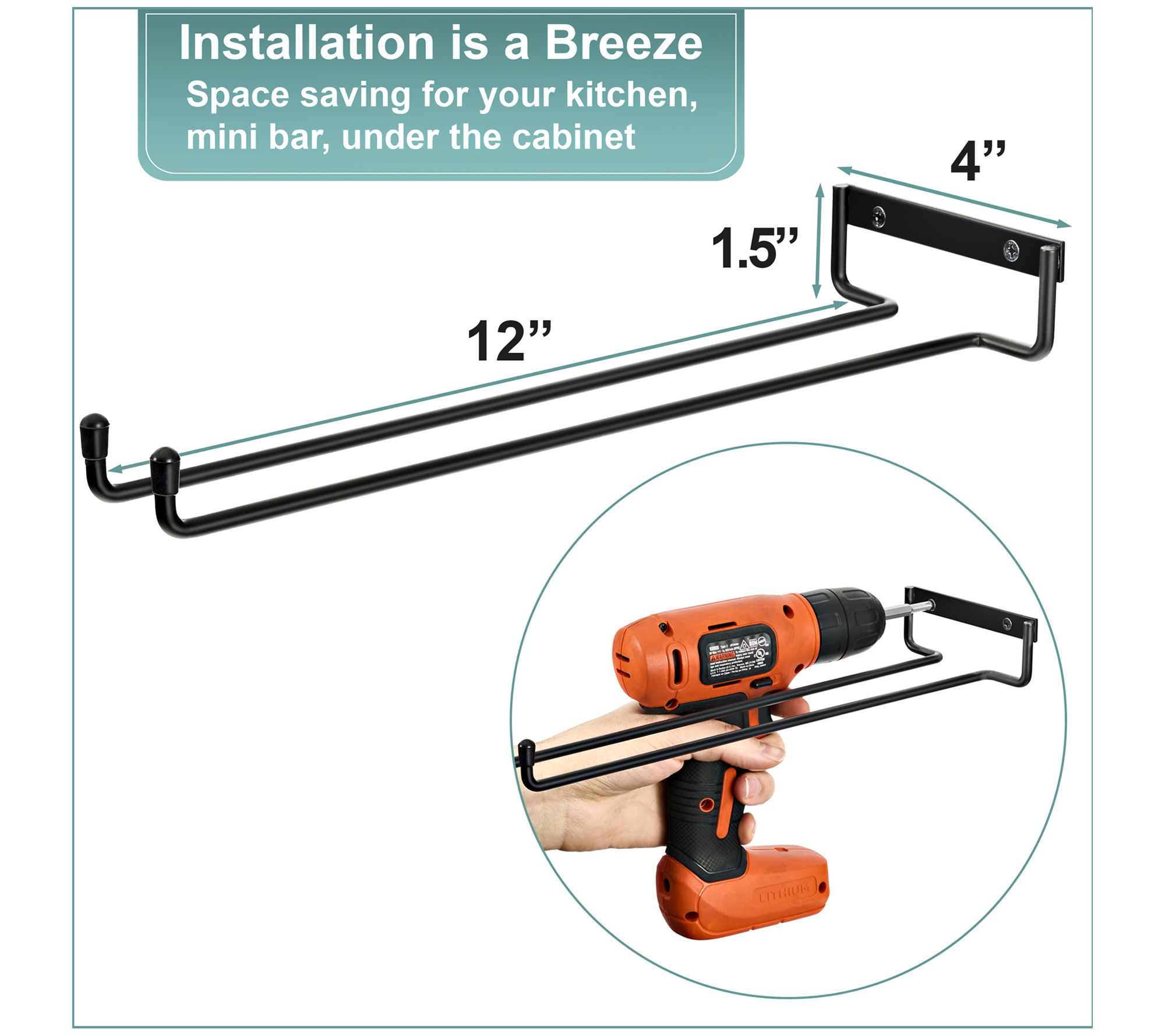 • Approximate measurements: Wall-hanging wine bottle holder 3"D x 10.25"W x 28"H; Under-cabinet wine glass hanger 12"L x 4"W x 1.5"H