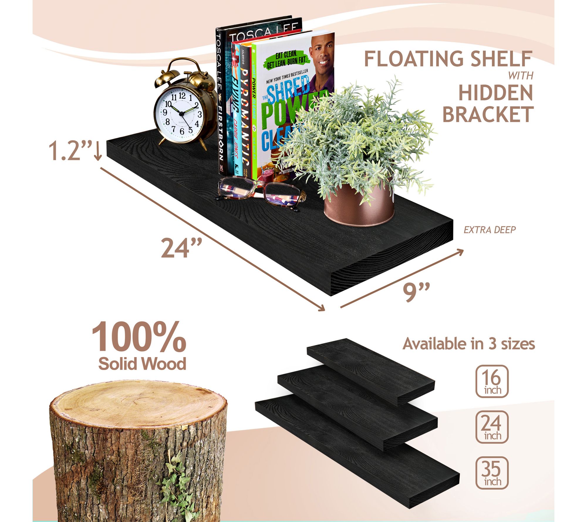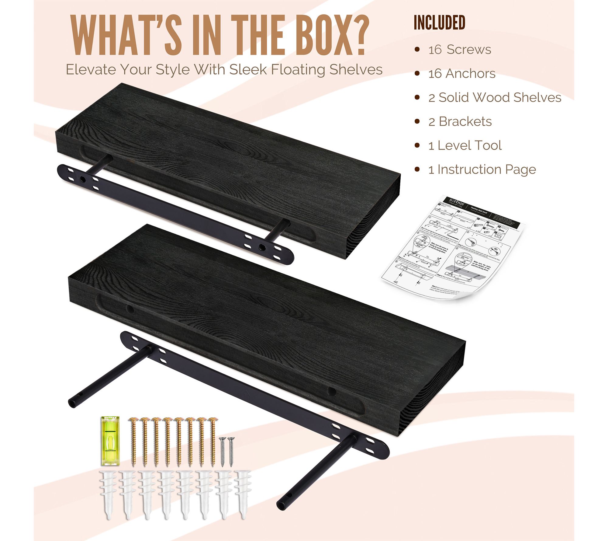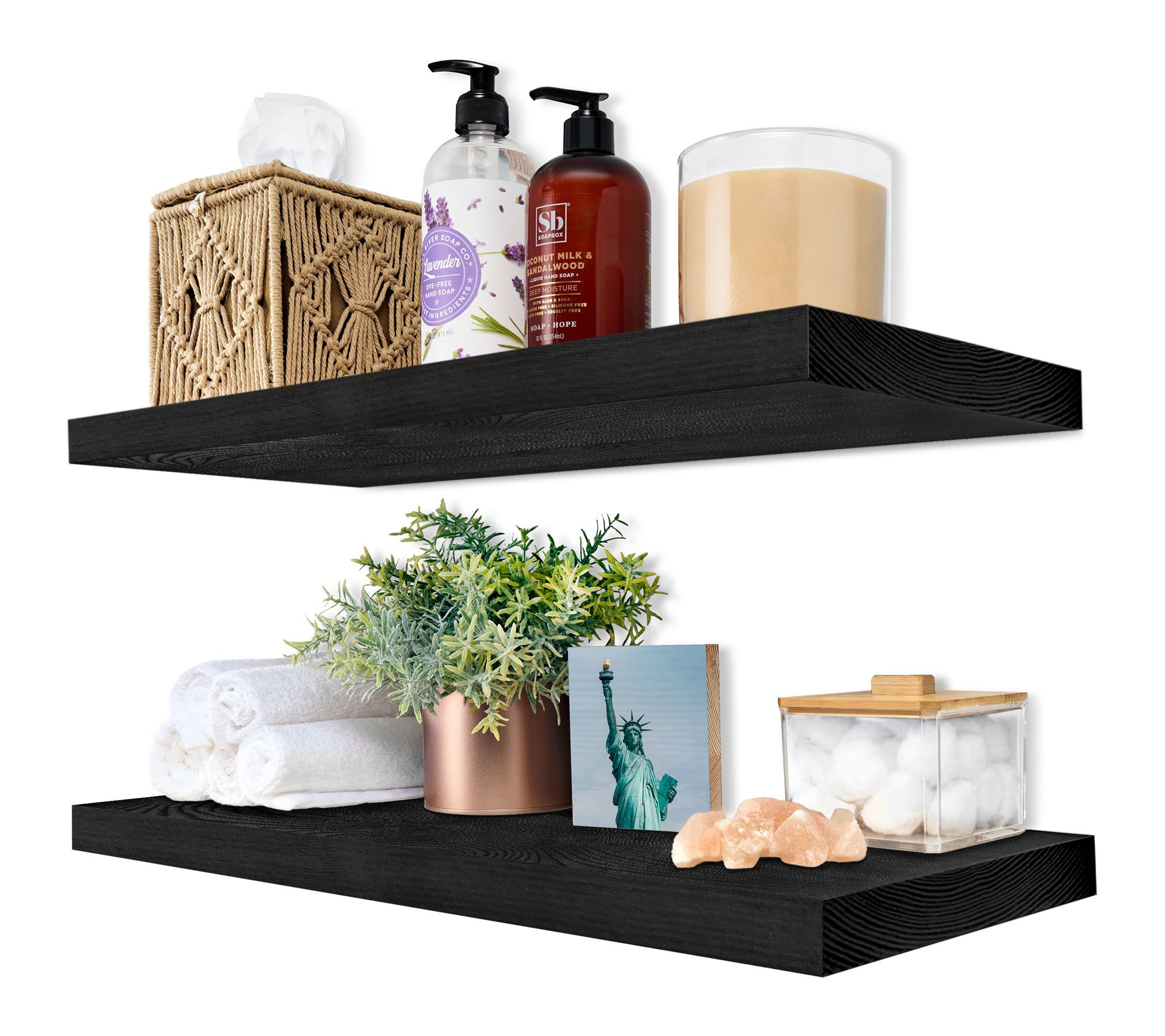 • Includes two solid wood floating shelves