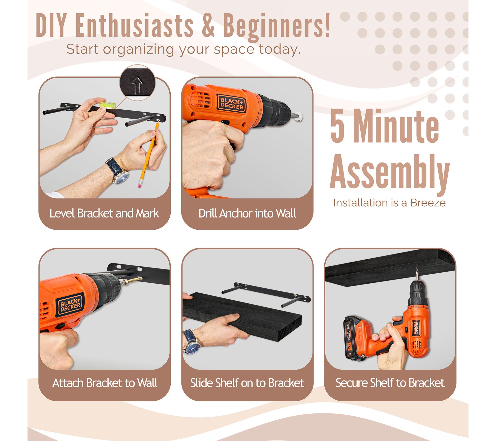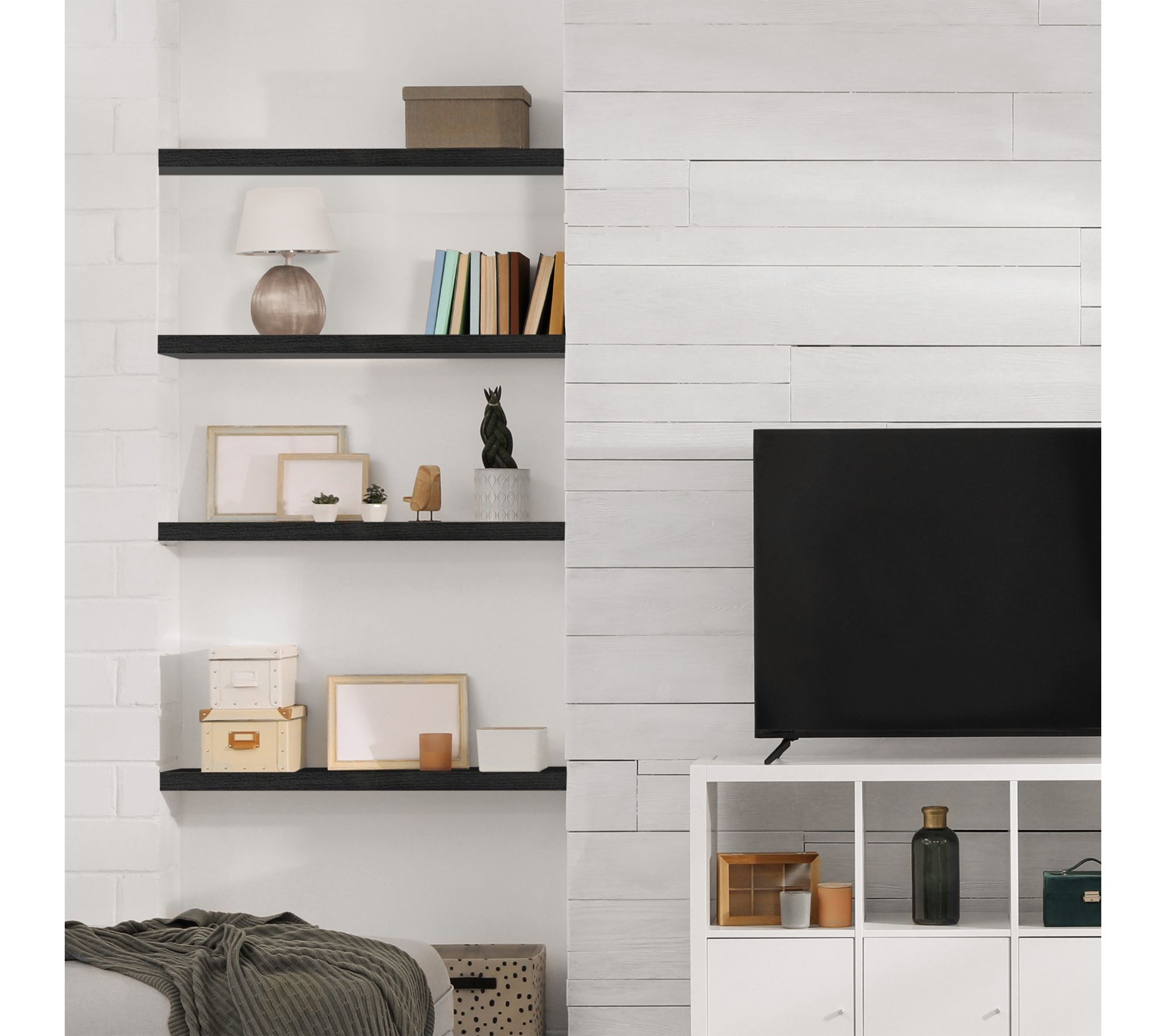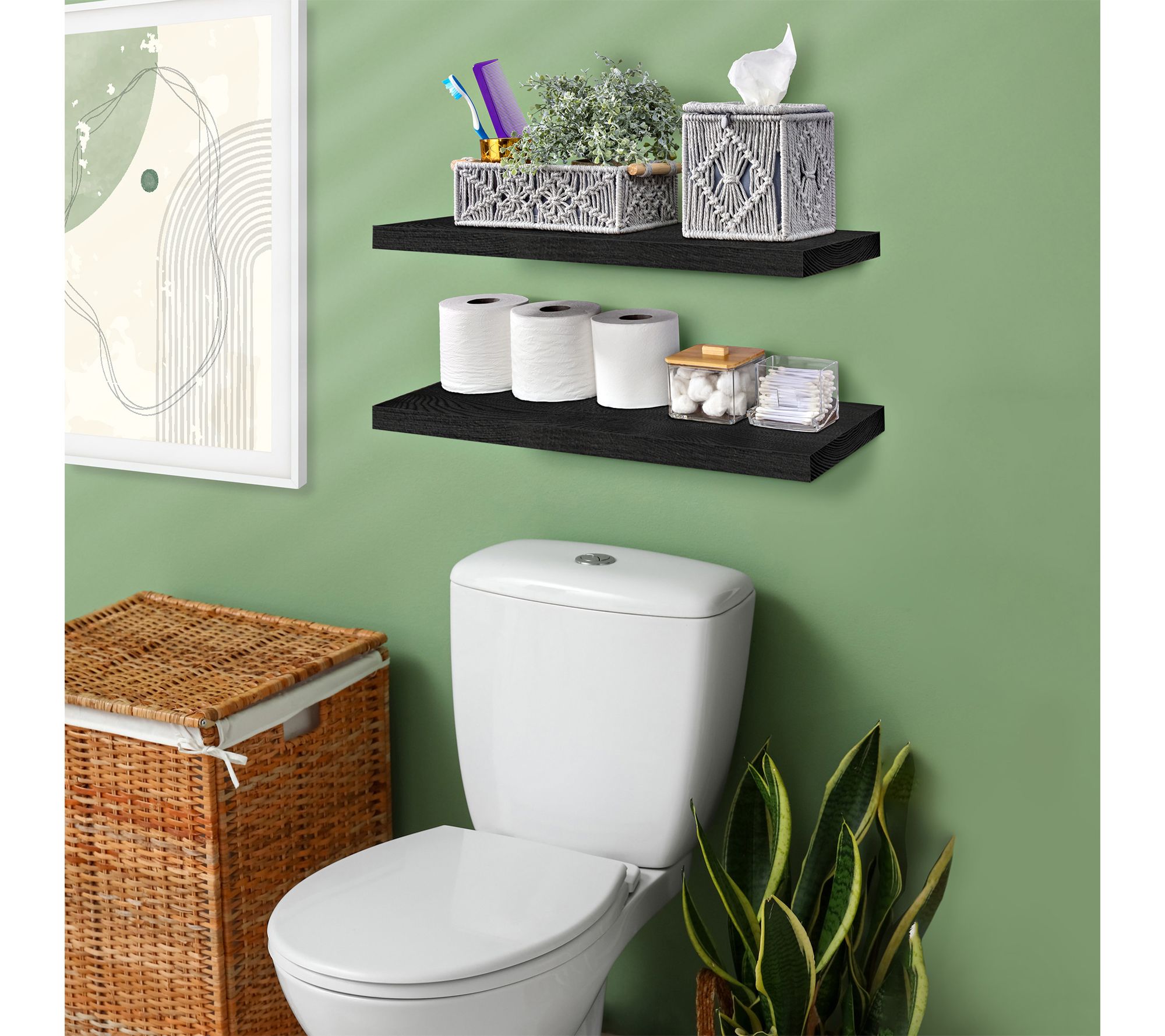 • Includes two solid wood floating shelves
