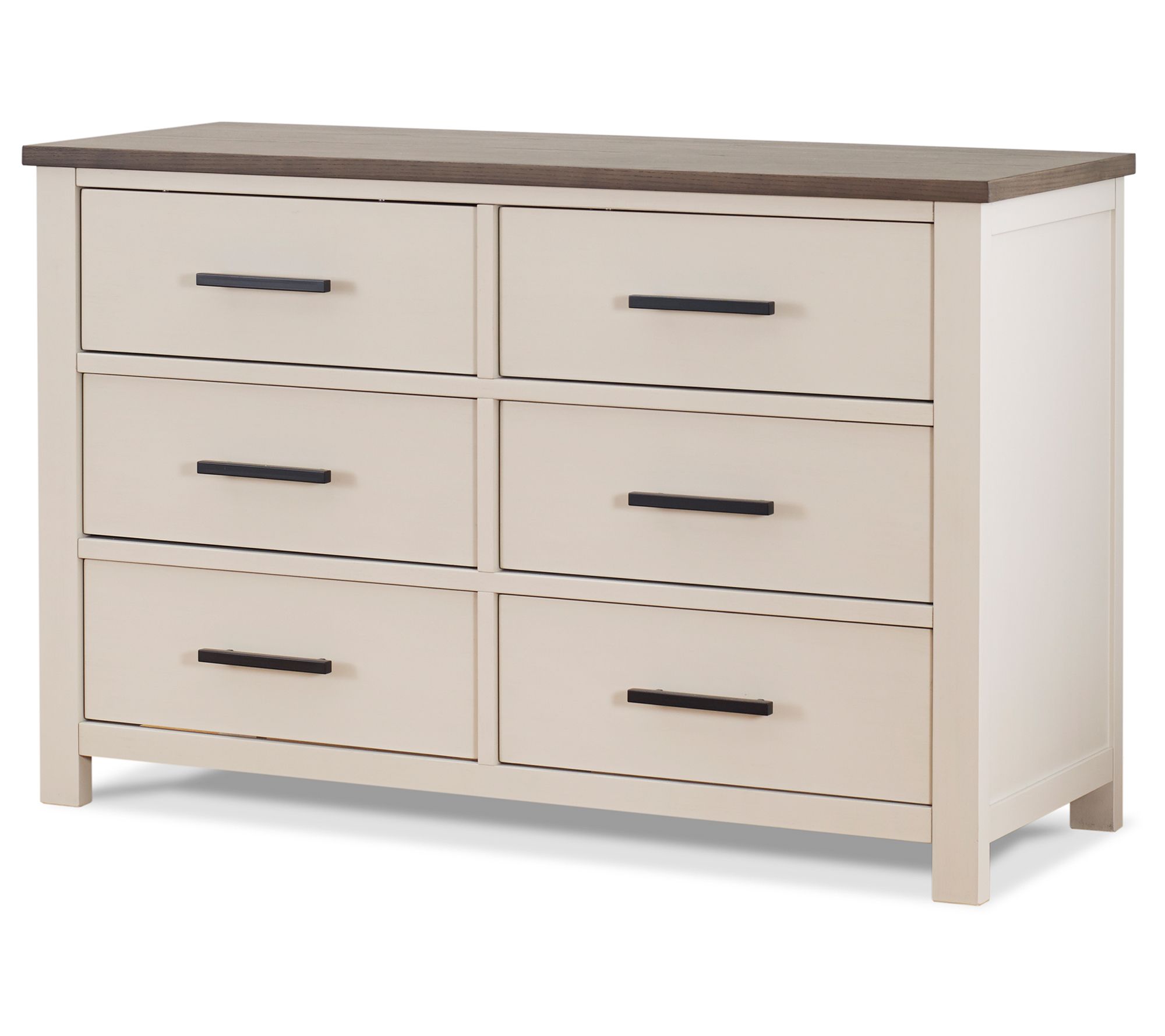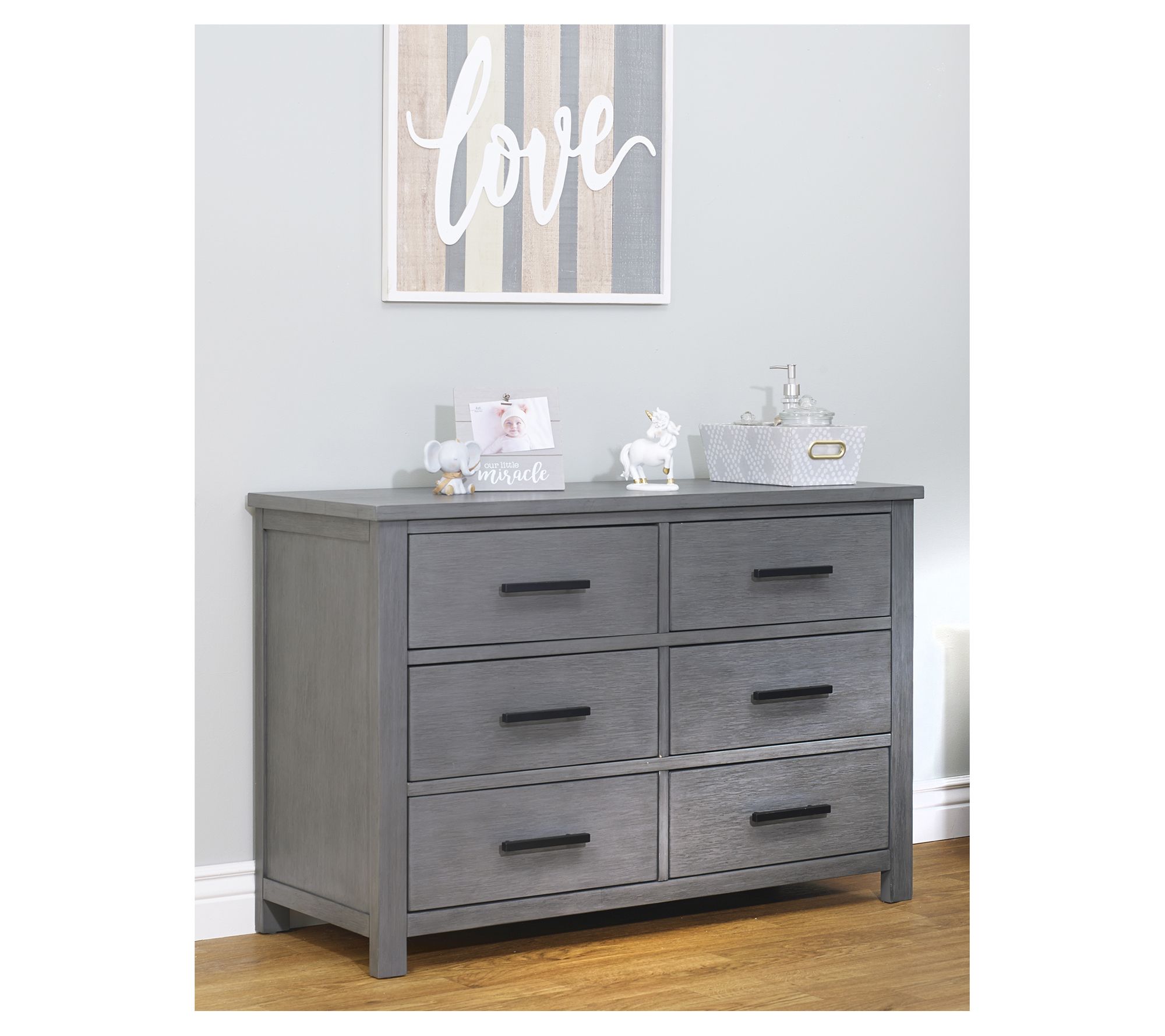 Give your nursery a contemporary look with the clean lines of this Westley double dresser. It boasts six roomy drawers for clothing -- plus gorgeous accents and side-mounted runners for opening and closing. From Sorelle.