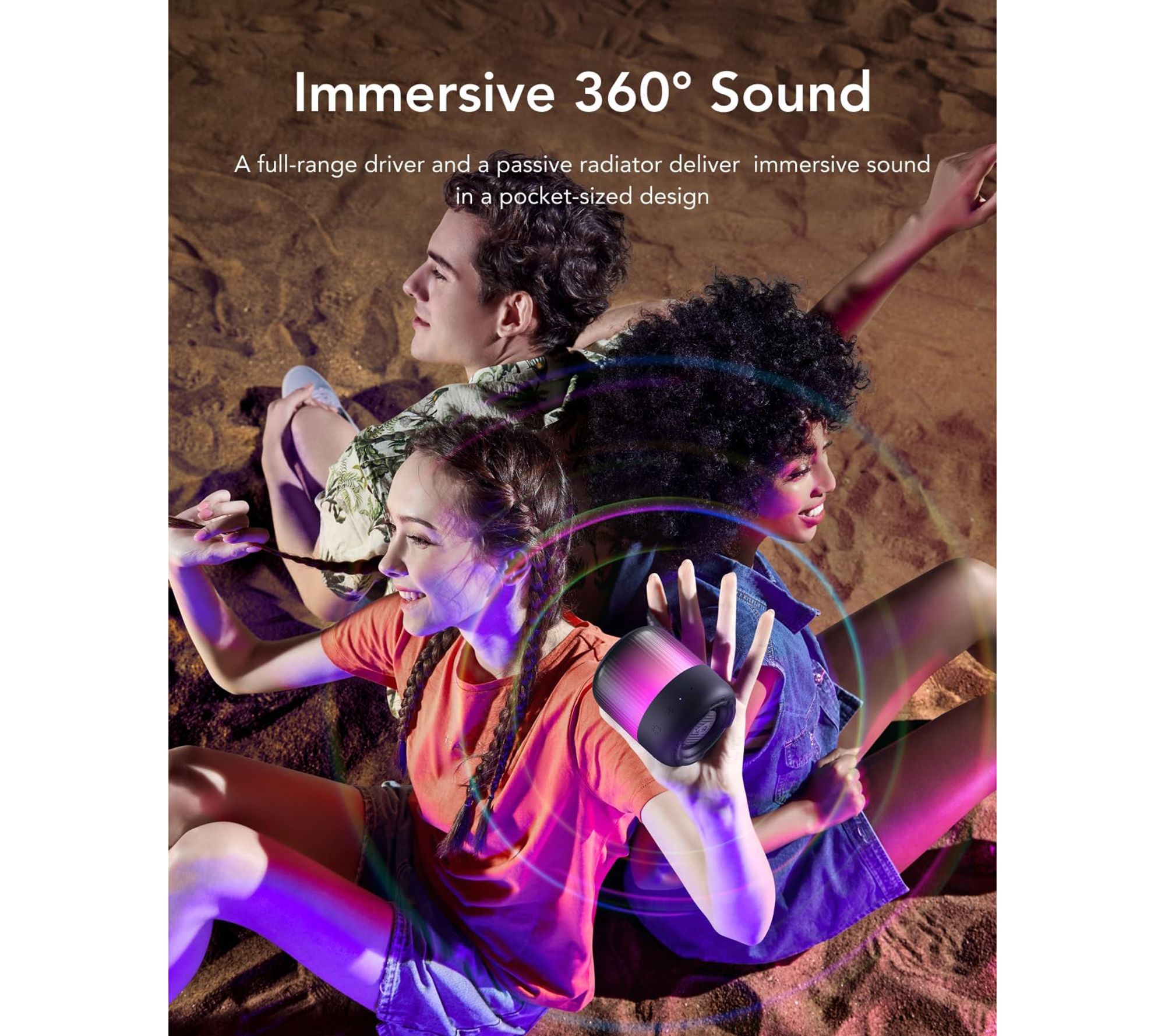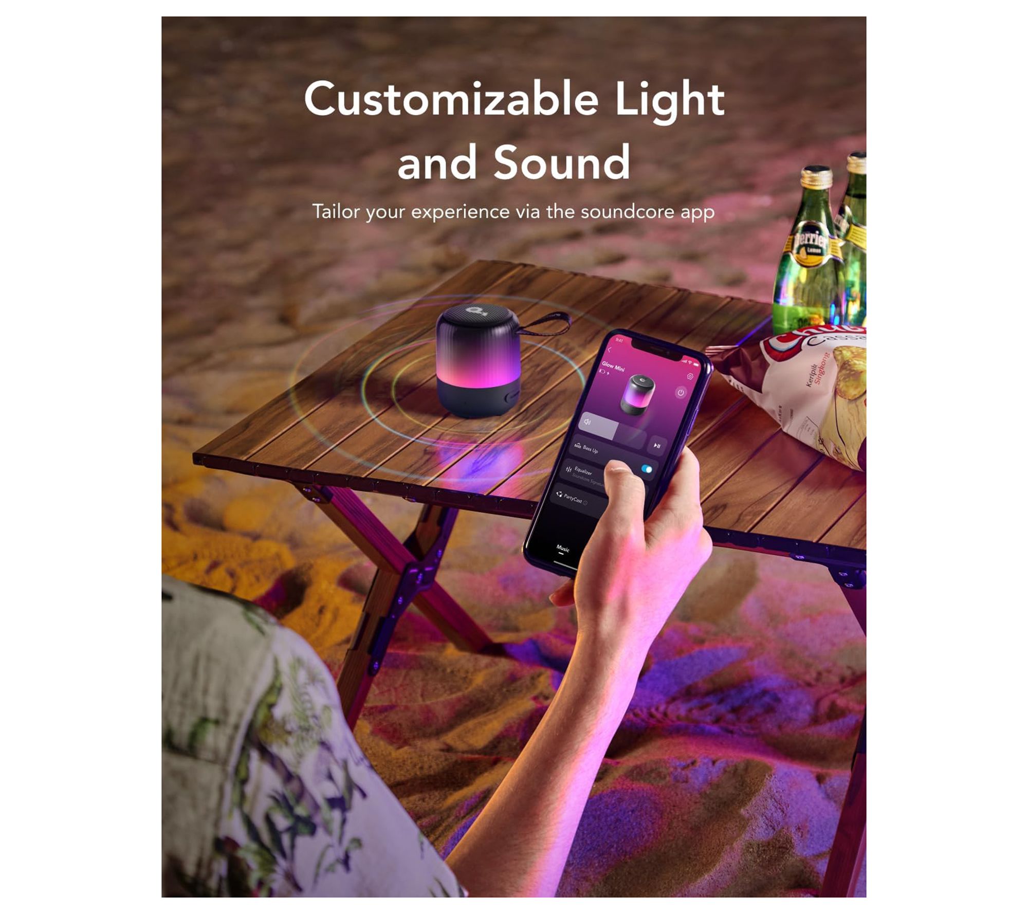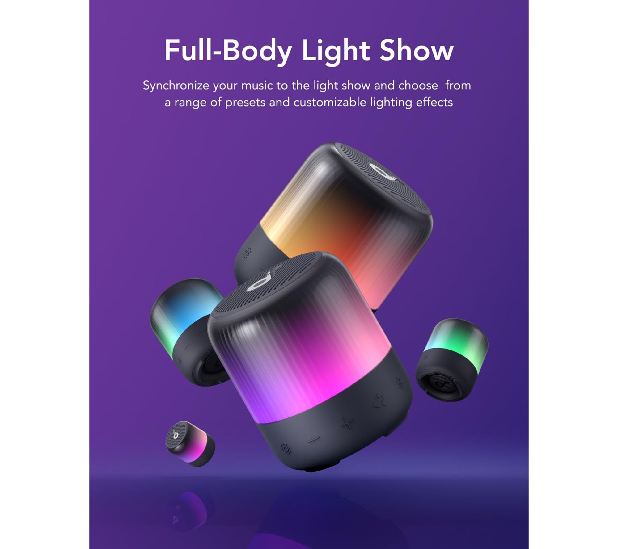 Elevate your music experience with the Anker Glow Mini portable speaker. Featuring dynamic 360-degree sound and a captivating full-body light show, this compact powerhouse is perfect for any gathering. With its waterproof and dustproof IP67 protection, you're ready for poolside jams or beach adventures. From Anker.