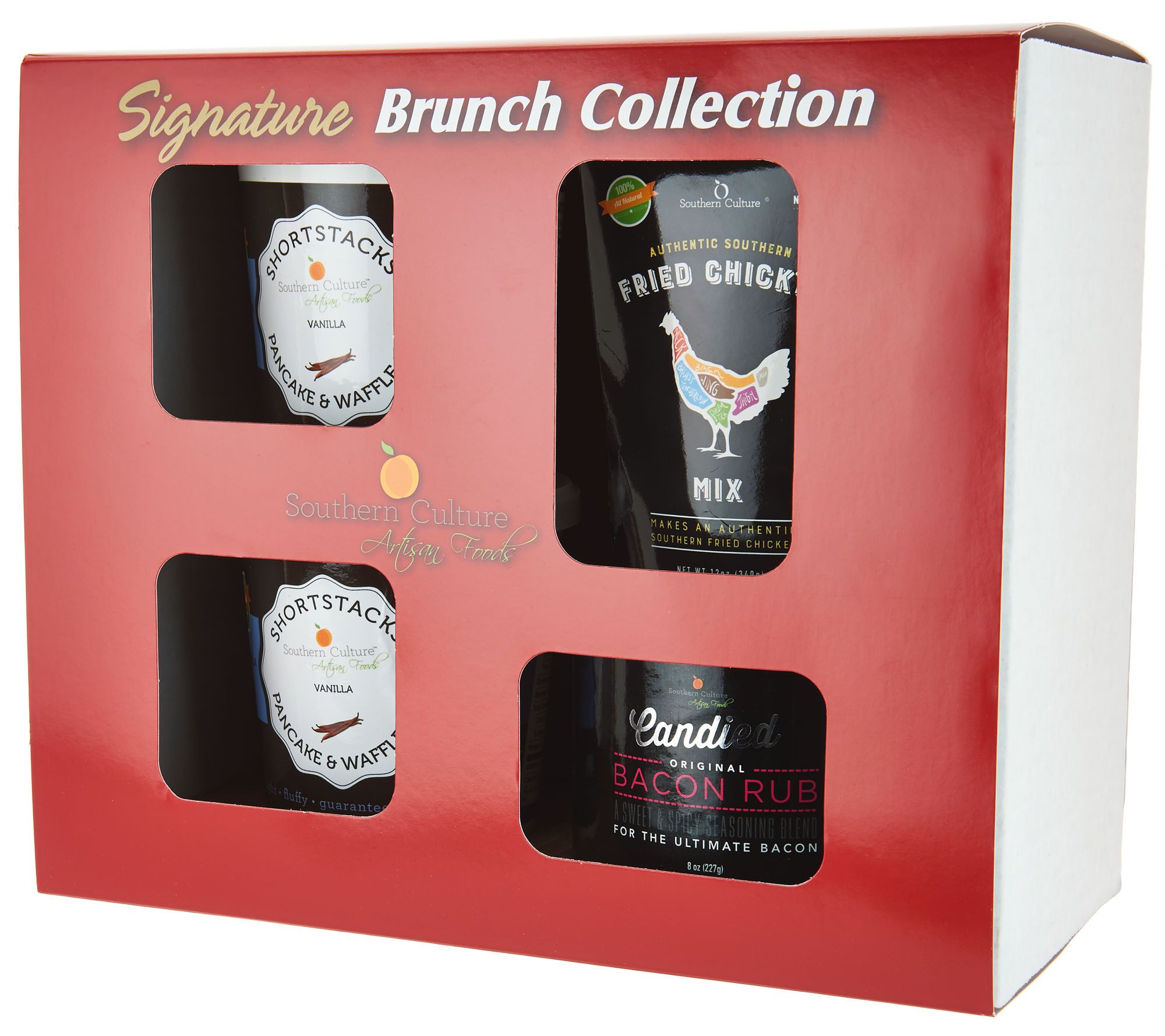 • Includes two 10-oz vanilla pancake/waffle mix, one 12-oz fried chicken waffle mix, and 8-oz bacon rub