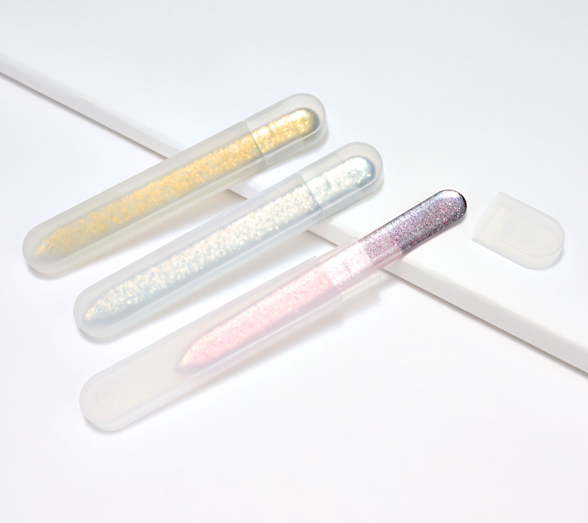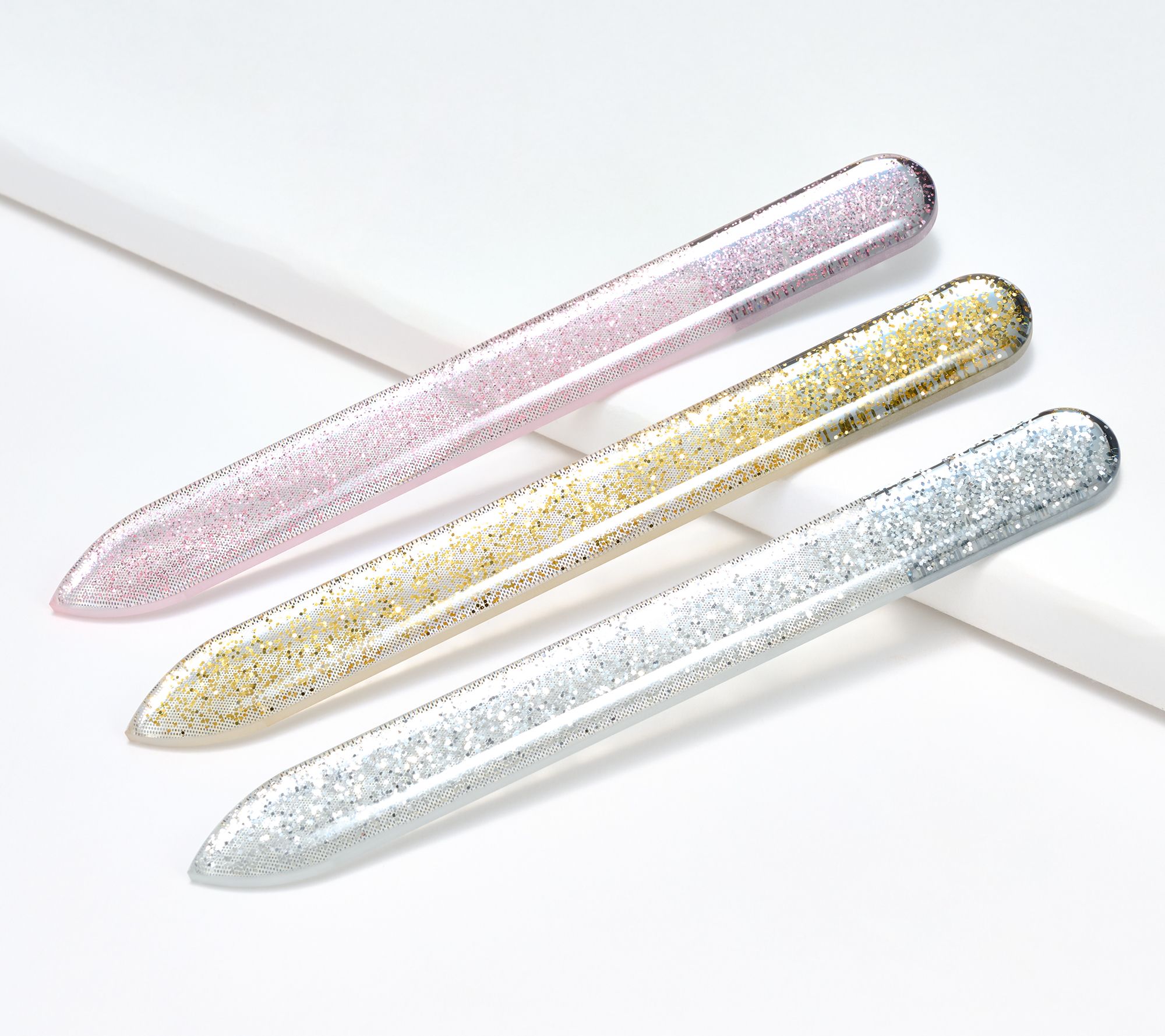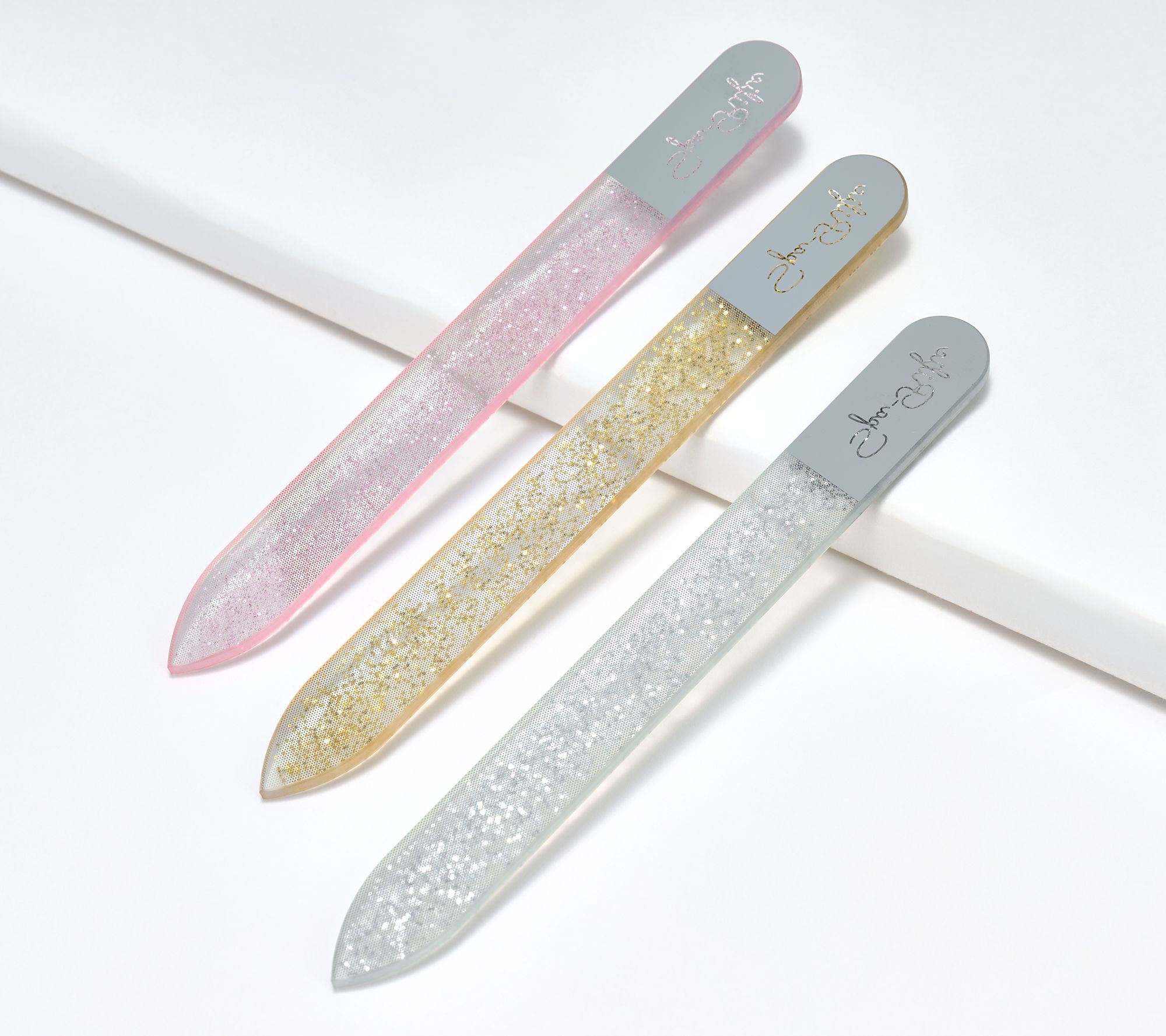 • Three laser-etched manicure files in Gold Shimmer, Rose Shimmer, and Silver Shimmer