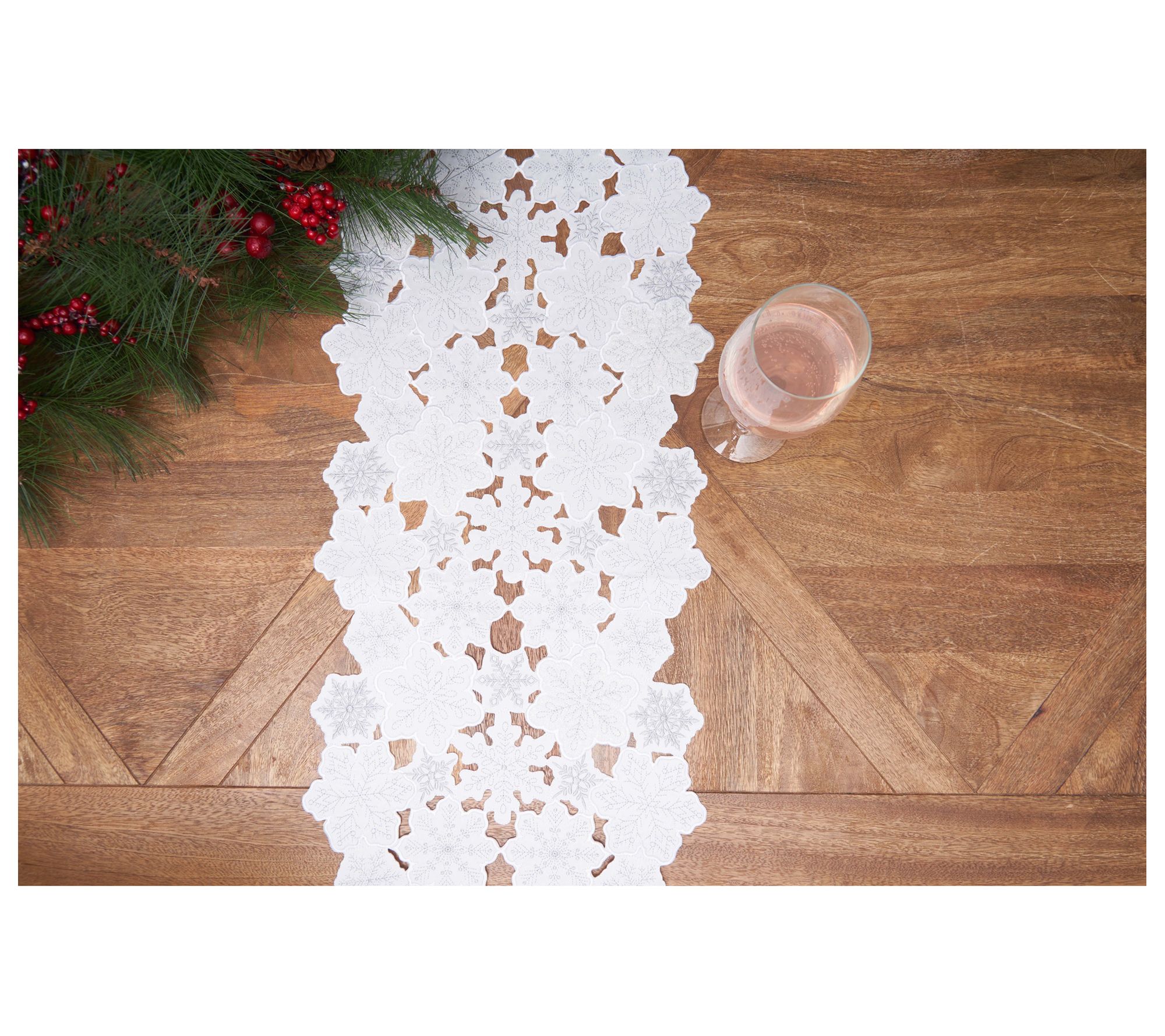 Picture your table adorned with a captivating blend of shimmering silvertone embroidery and delicate snowflake designs. This exquisite table runner radiates winter's charm, crafting a mesmerizing atmosphere ideal for festive gatherings or everyday decor. Allow its elegance to bring the splendor of a winter wonderland to your dining space, creating memorable moments with loved ones while celebrating the season's beauty indoors. From the Valerie Parr Hill Collection.