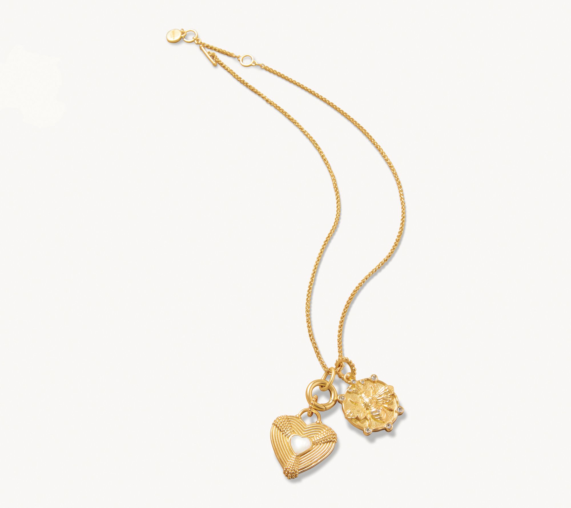 • Foxtail toggle charm necklace with two charms -- Beloved (animal-inspired) and Always (heart); bezel-set round simulated crystals; charms can be worn together, removed, or personalized with more charms; matte finish