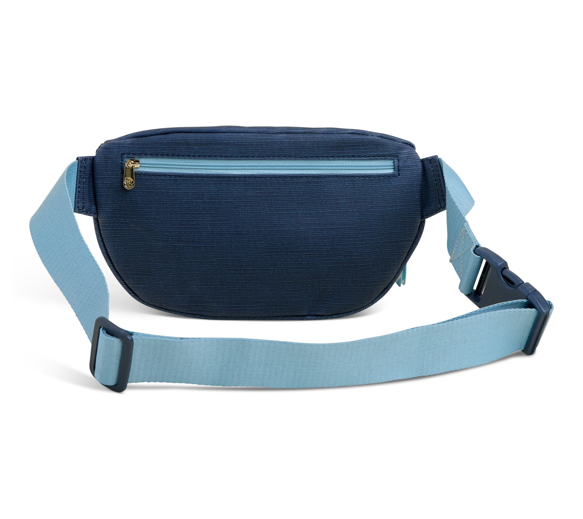 A day of errands or travel comes with ease when you wear this belt bag. The navy blue stripe design adds a playful pop to your outfit, while the adjustable strap lets you carry essentials comfortably across your waist or chest. Enjoy secure organization with multiple pockets and card slots. From Spartina 449.