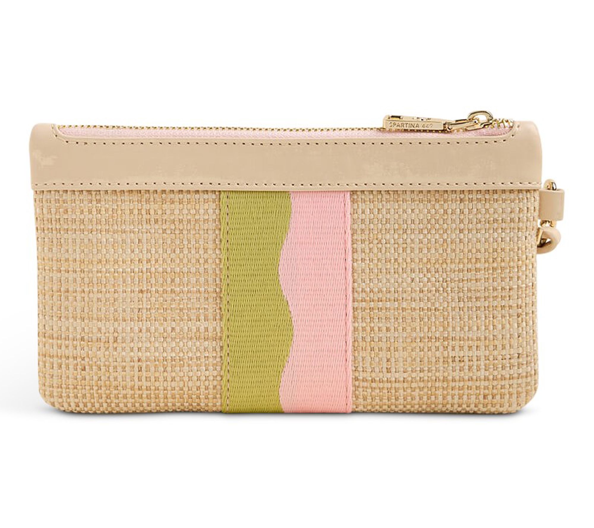 Sunny days, quick errands, or dinner with friends -- this wristlet adds effortless style to every adventure. Made from fashion-forward faux straw and finished with a playful green and pink stripe plus a gleaming goldtone palm, it zips open to reveal easy-access card slots and a spot for essentials. From Spartina 449.