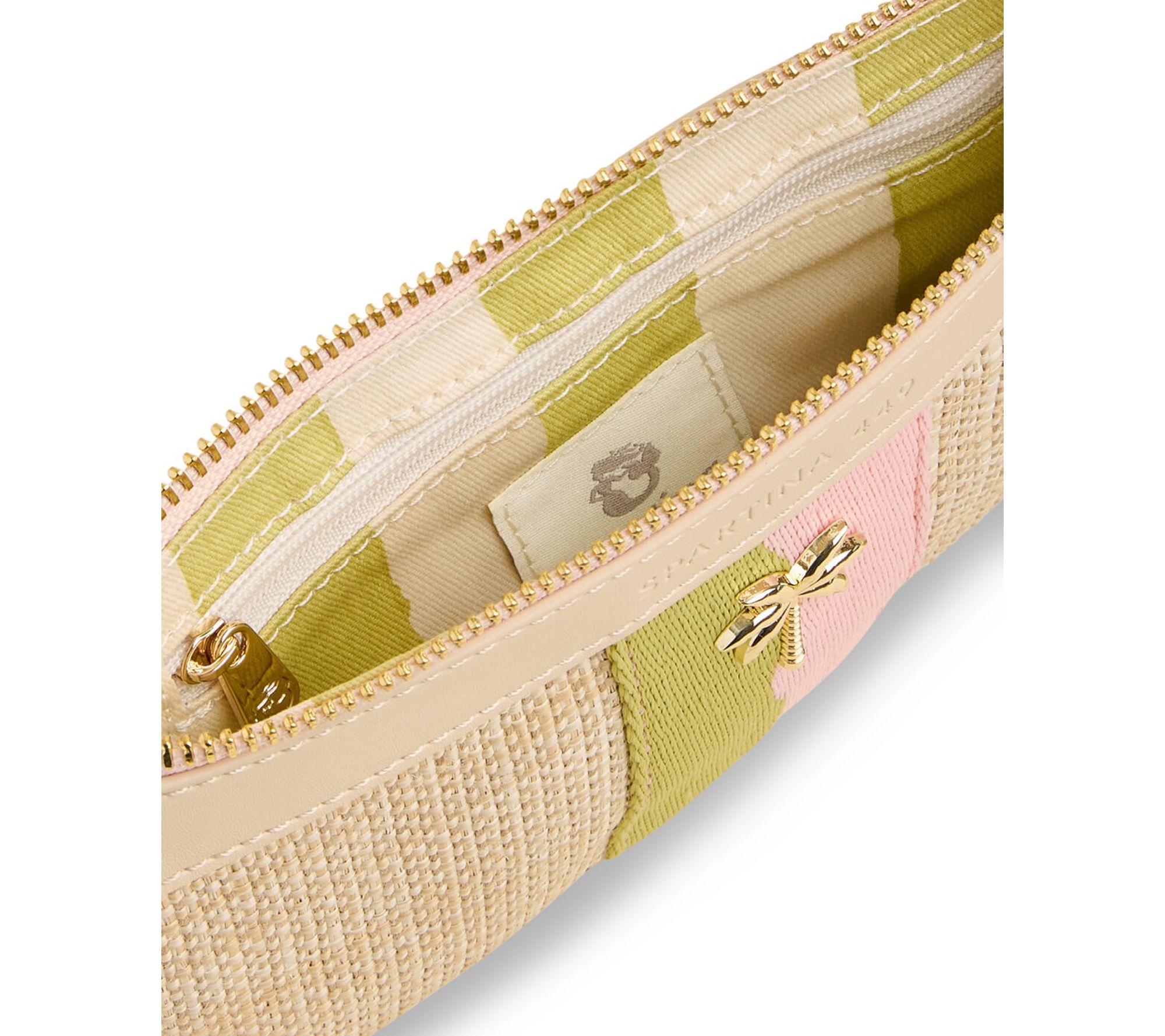• Zip top closure, wrist strap, green and pink center stripe, goldtone palm icon