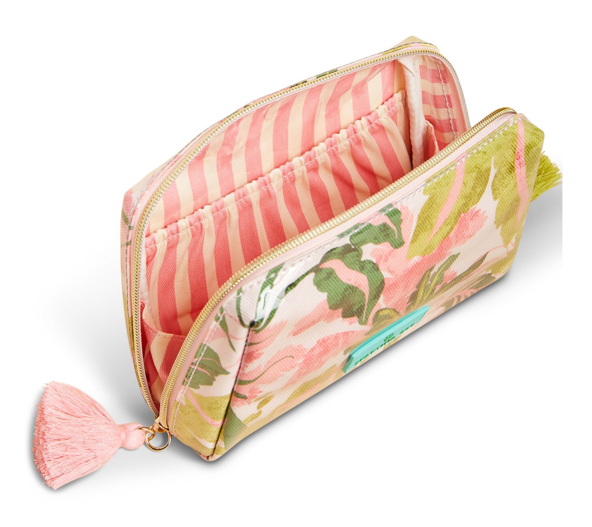 • Wipe-clean exterior, palm tree pattern, double tassel zipper pull