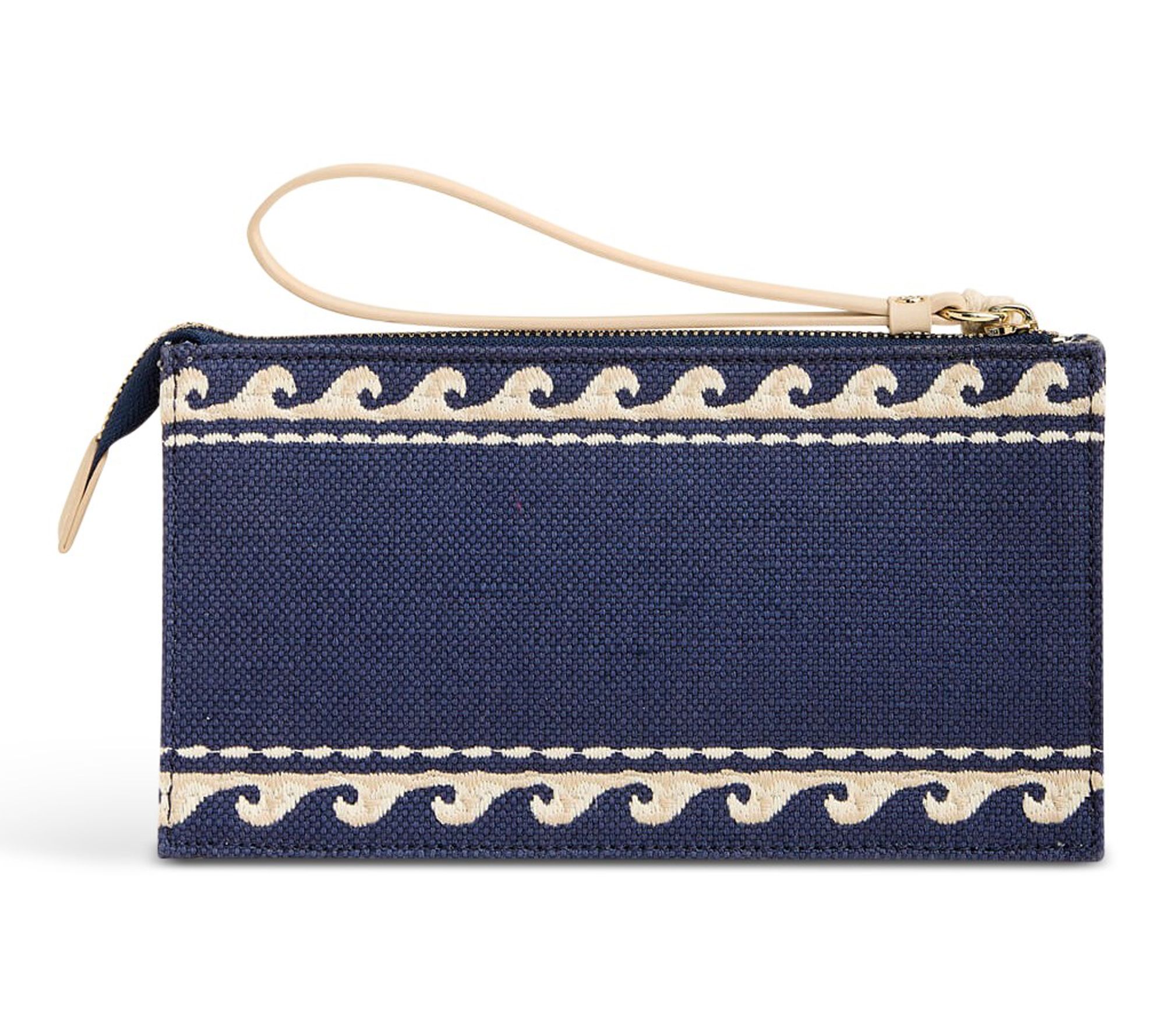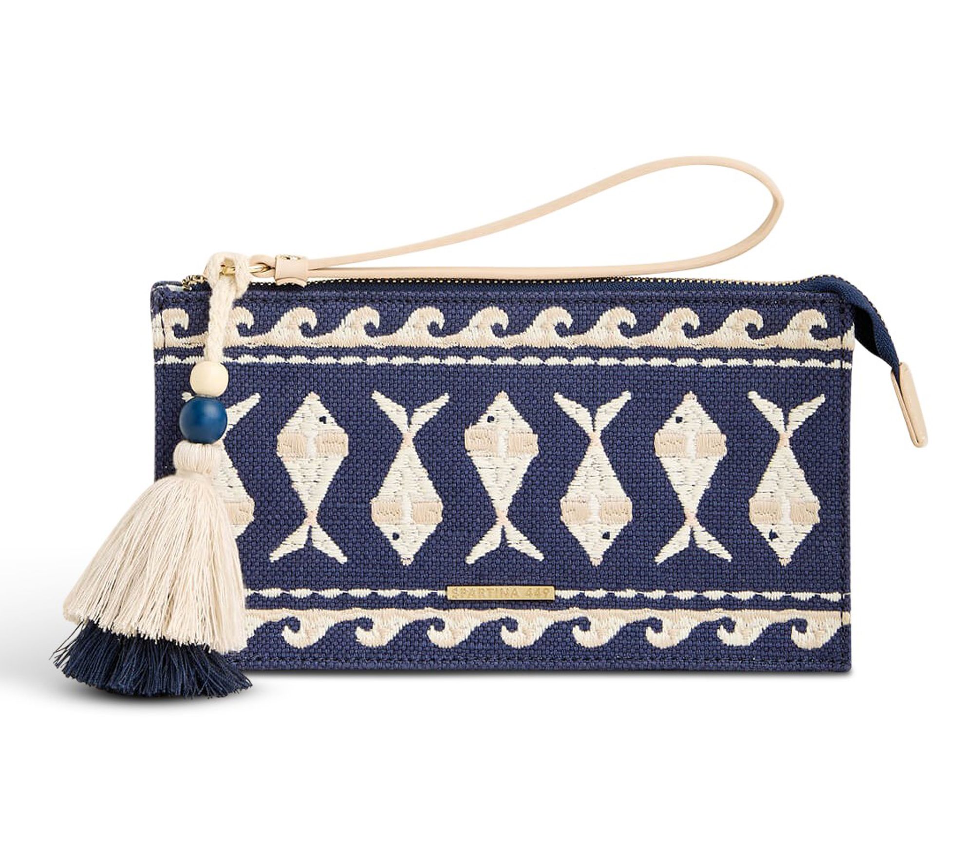 • Zip top closure, embroidered fish pattern, cream and blue beaded cotton tassel fob, goldtone hardware, wrist strap