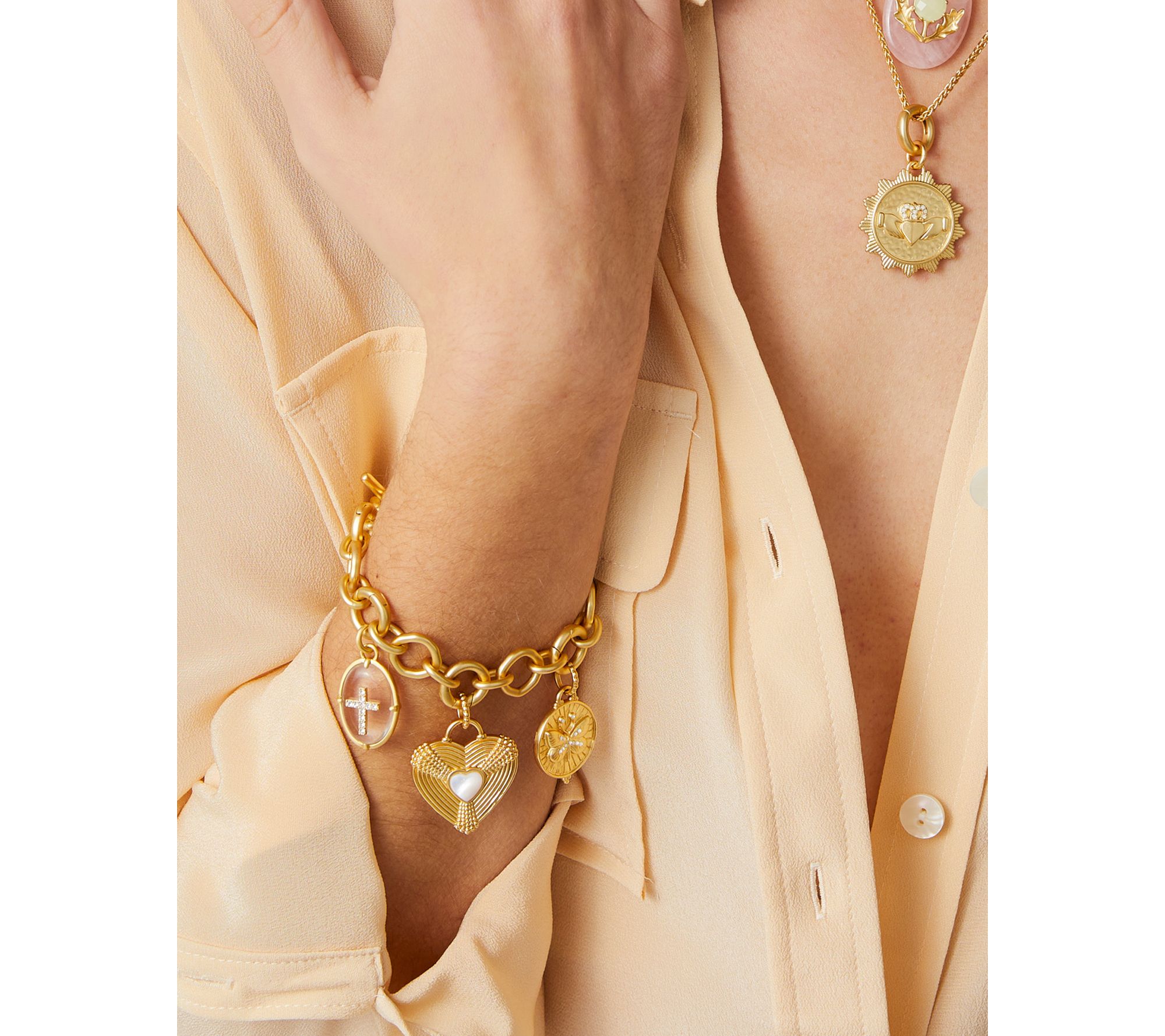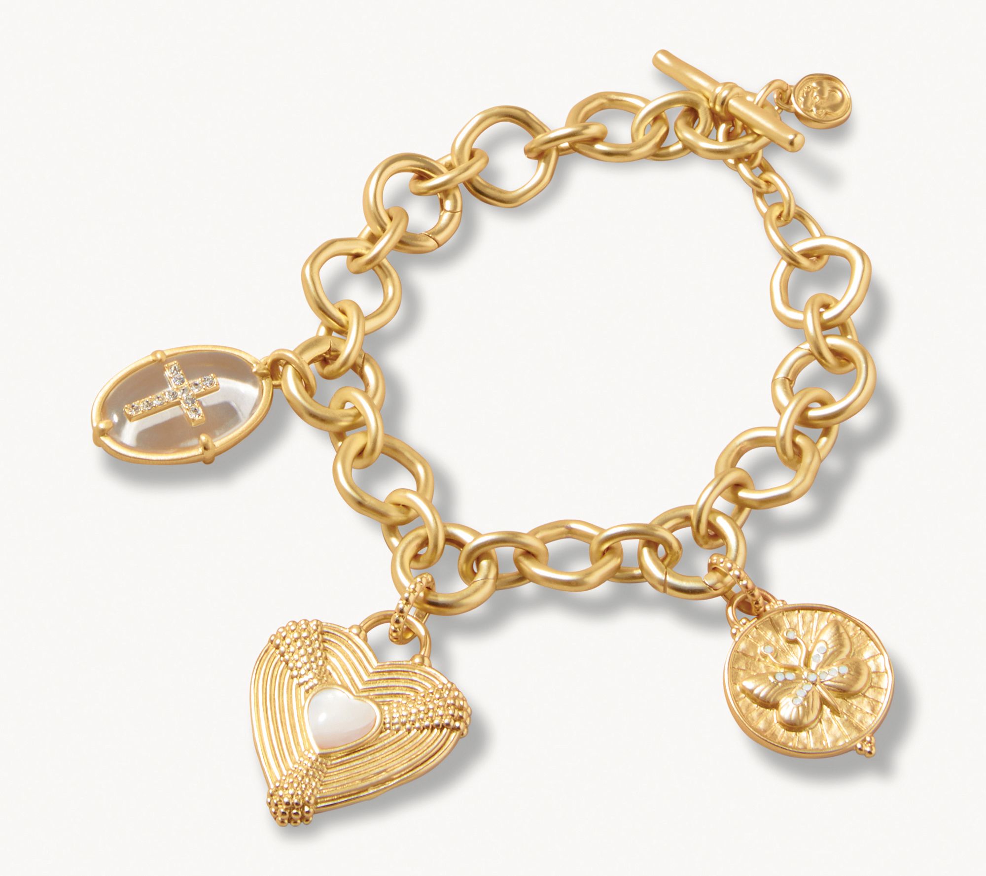 Carry reminders of faith, hope, and love wherever you go with this charming bracelet, adorned with sparkling simulated crystals and three meaningful charms. Whether you wear it solo or add more charms for a personalized touch, this versatile piece gently complements any outfit, inspiring positivity and style every day. From Spartina 449.