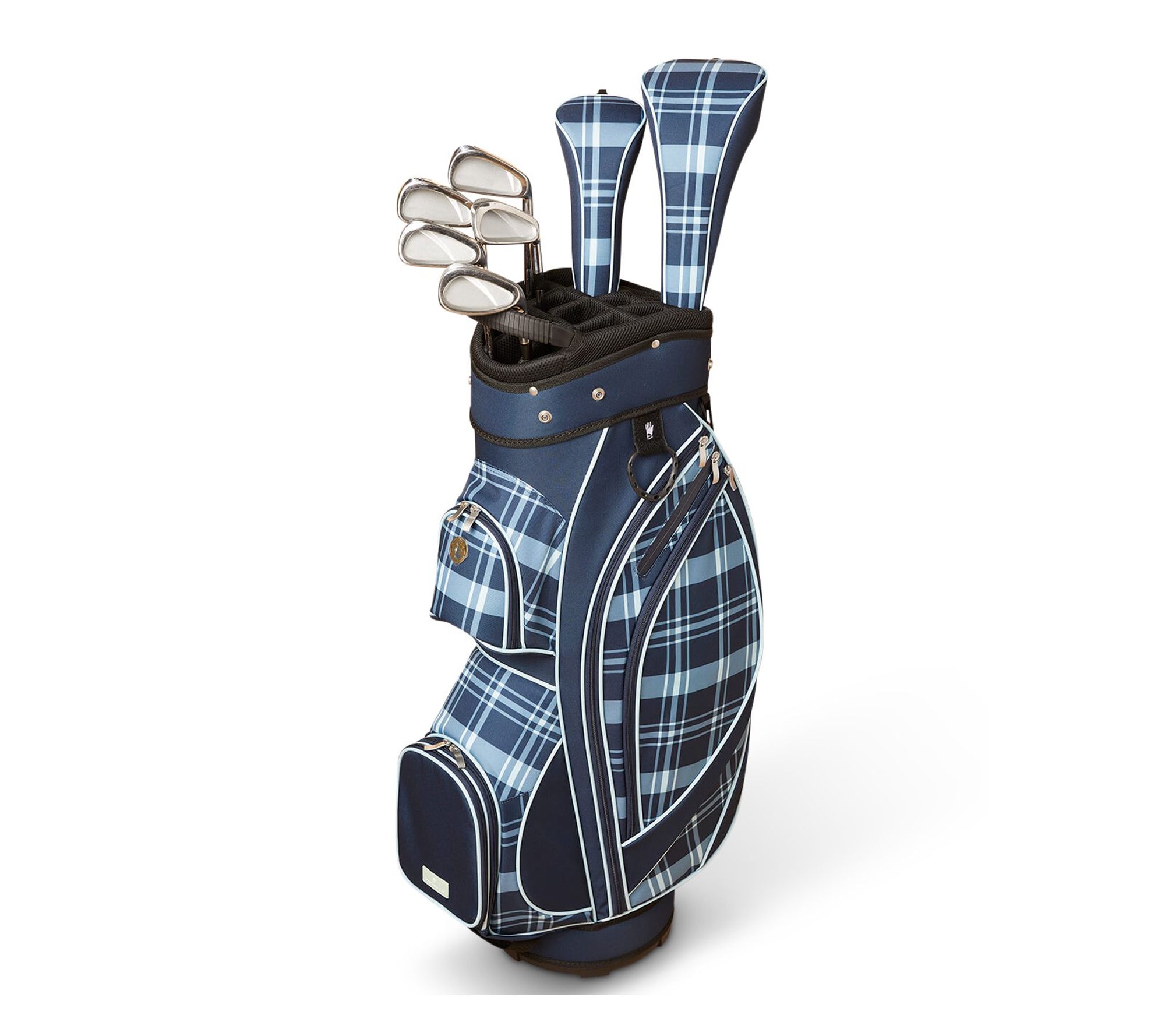 Tee off in style and keep your game organized with this golf cart bag, designed to make every round more enjoyable. Lightweight printed nylon, 14-way top divider, and ample zipper pockets ensure your clubs and essentials are always right where you need them. From Spartina 449.