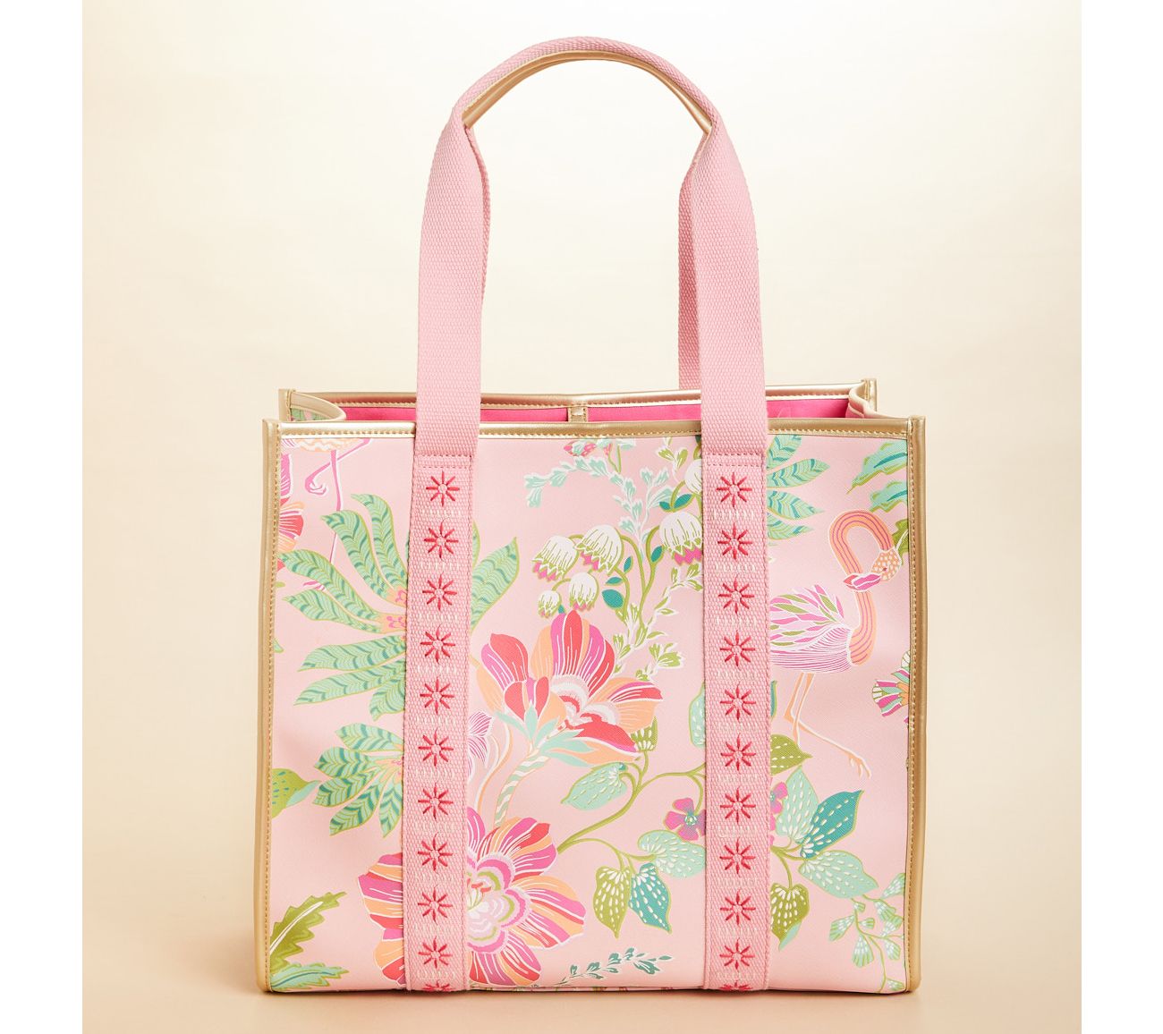 • Double handles, goldtone hardware, woven straps with faux leather details