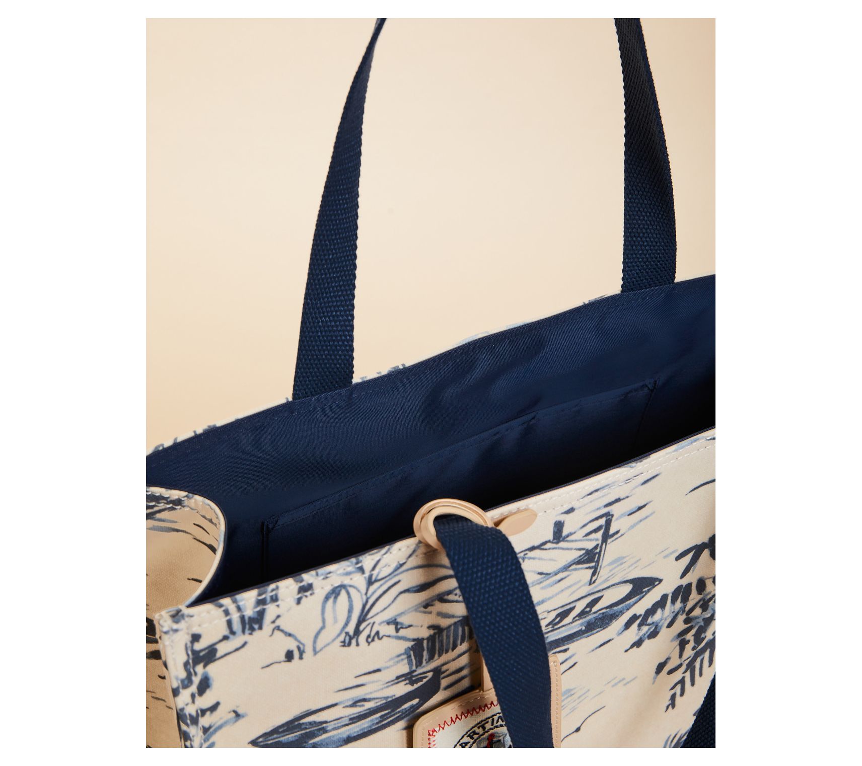 • Double handles, no closure, goldtone hardware