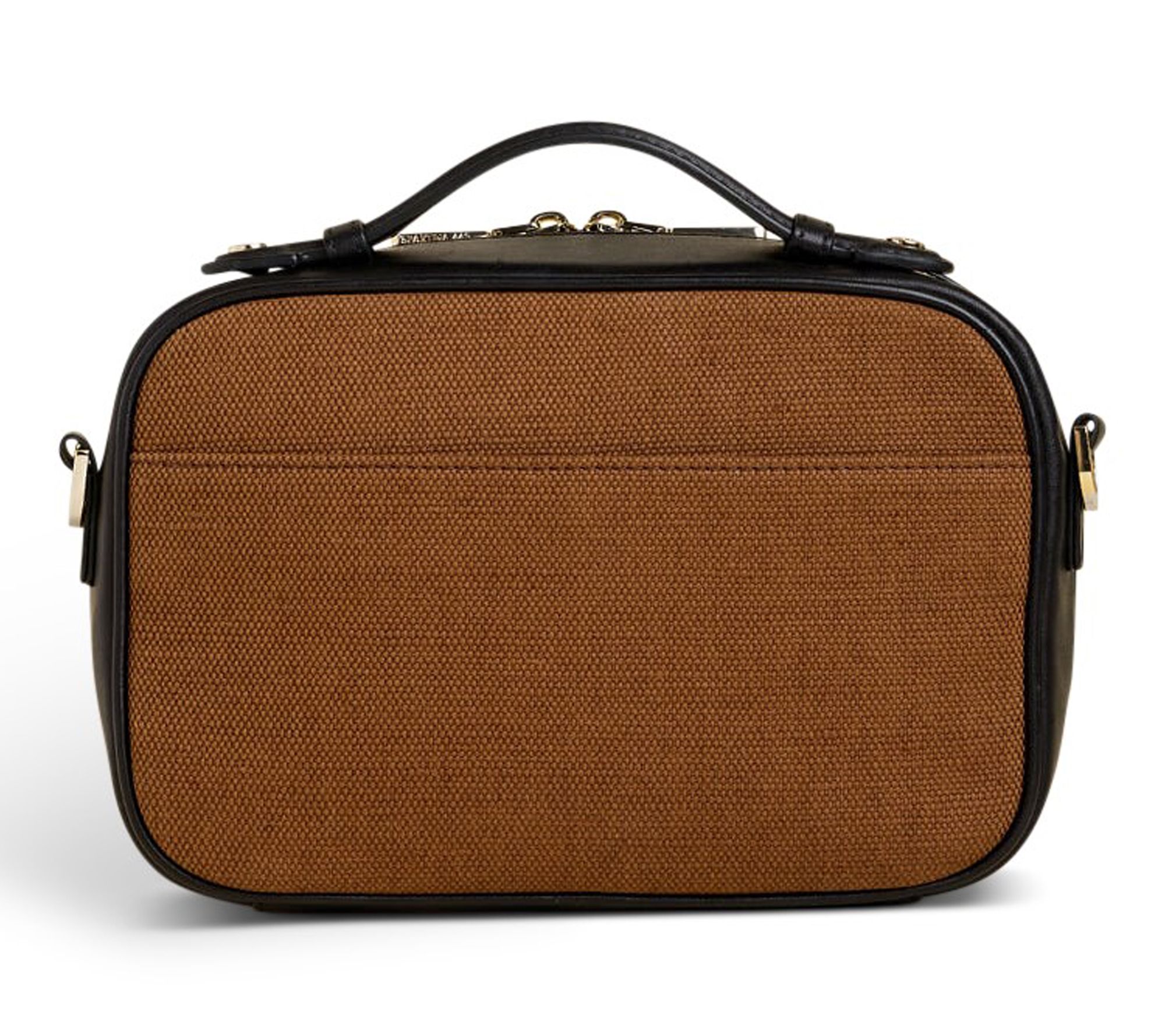 • Zip top closure; single top handle; detachable, adjustable strap; front zipper pocket; back slip pocket with button closure