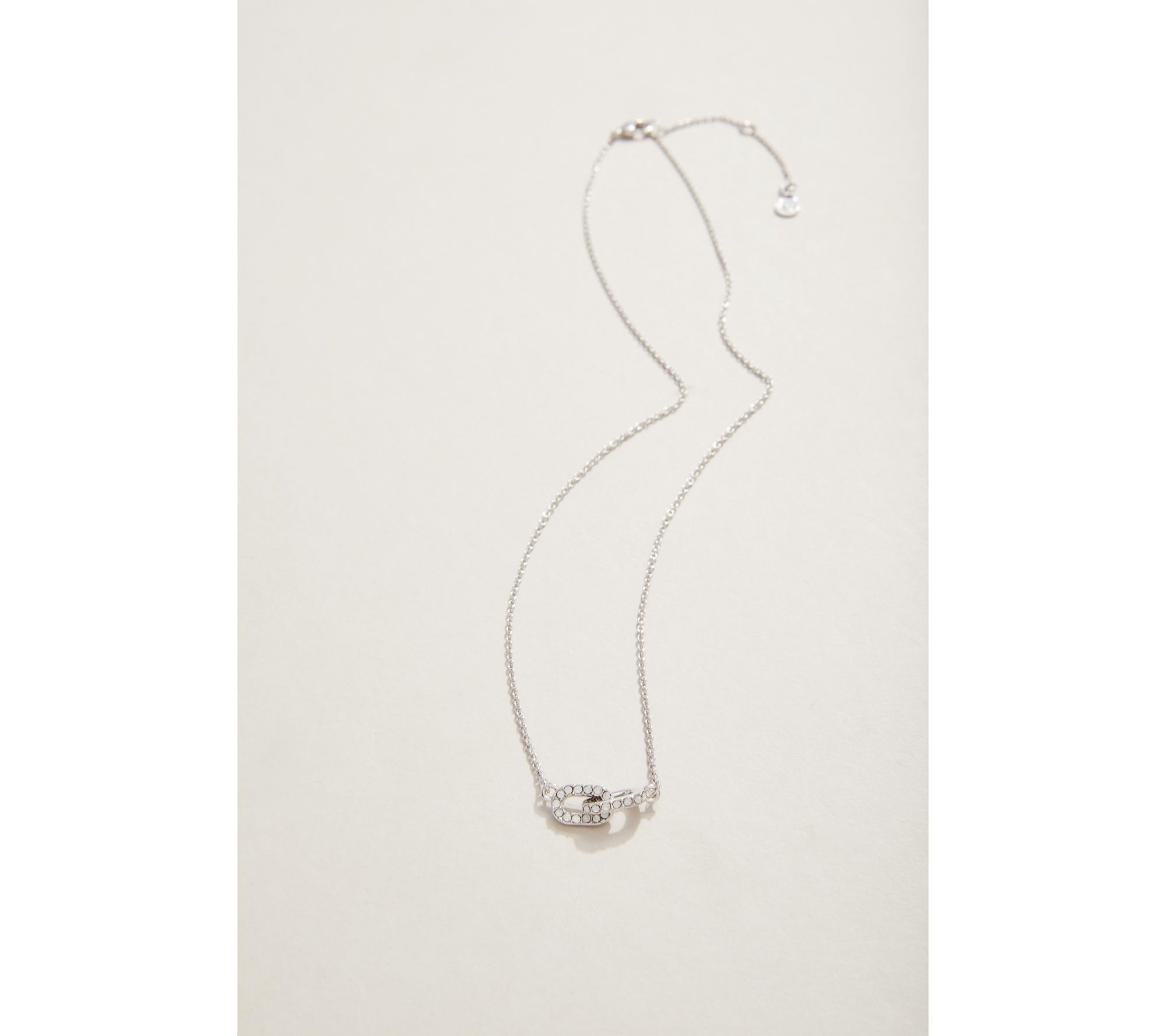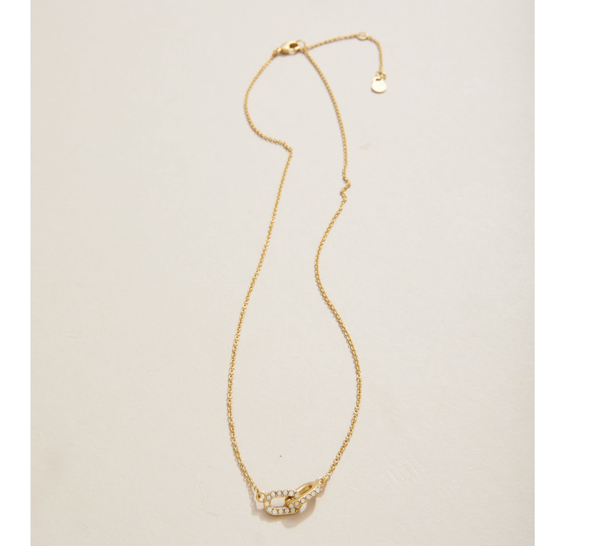 • Round simulated crystals bezel-set on link charm; cable link chain