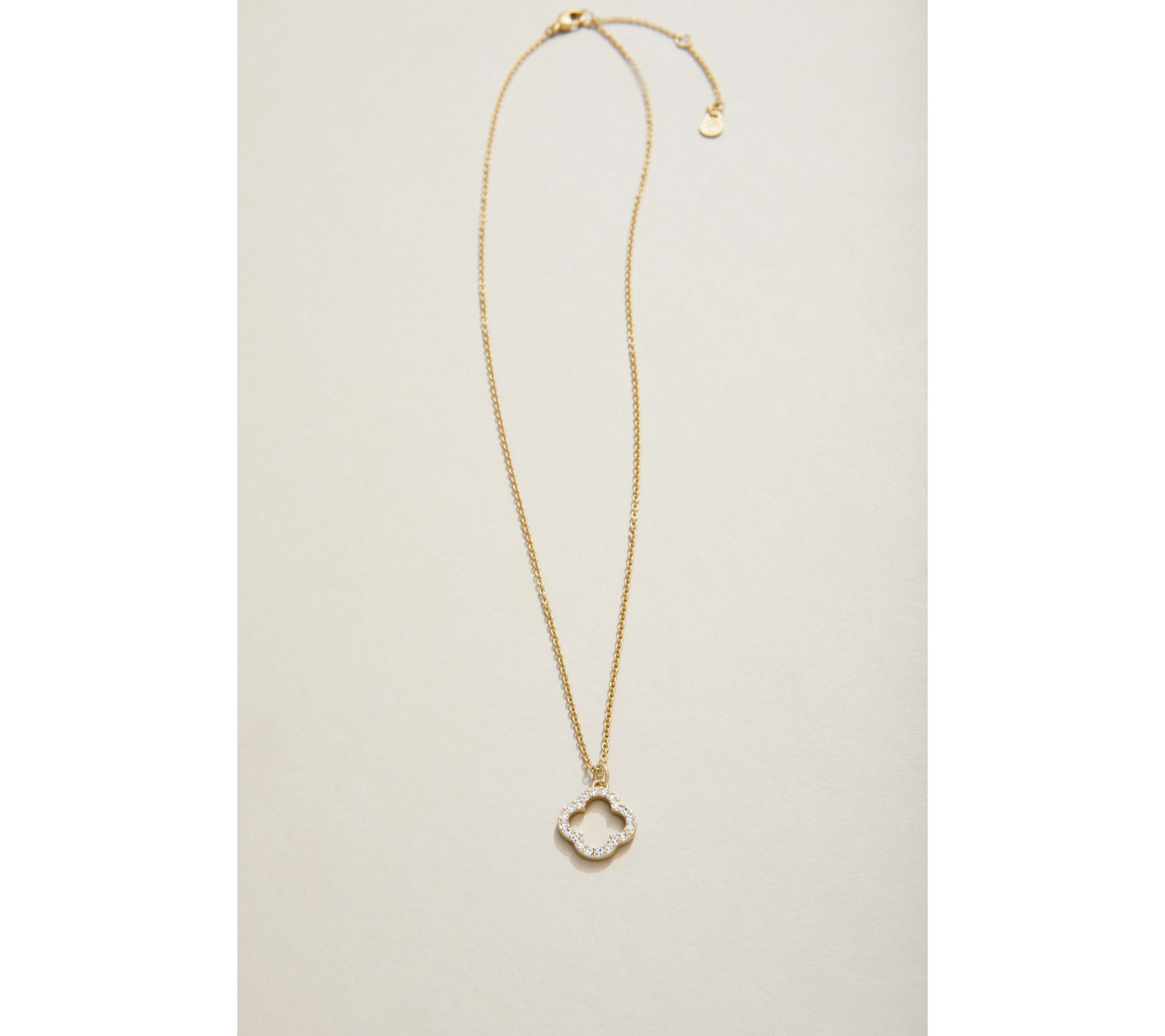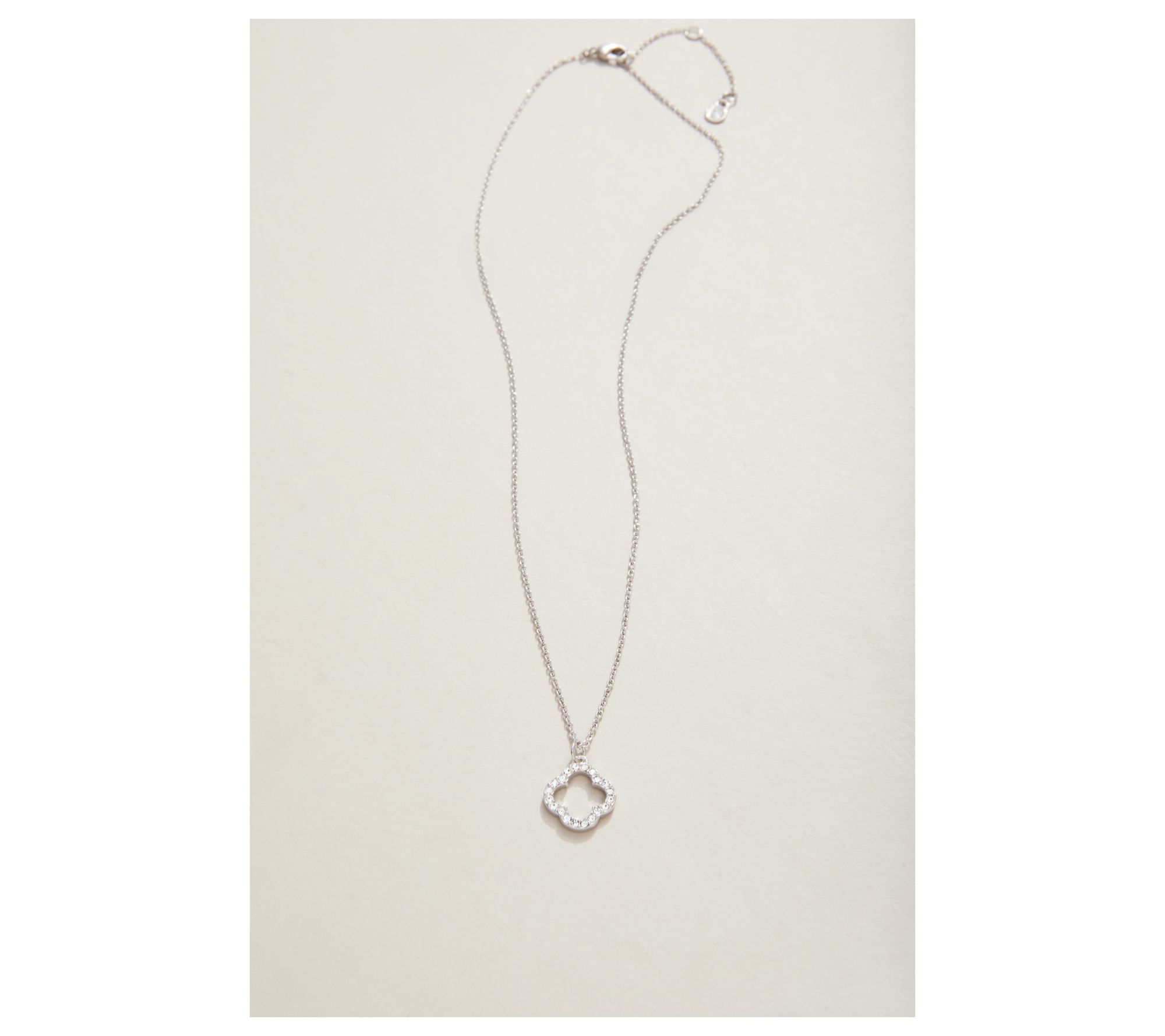• Quatrefoil charm design adorned with white/off-white simulated crystals; cable chain; simulated crystals are round cut and bezel set