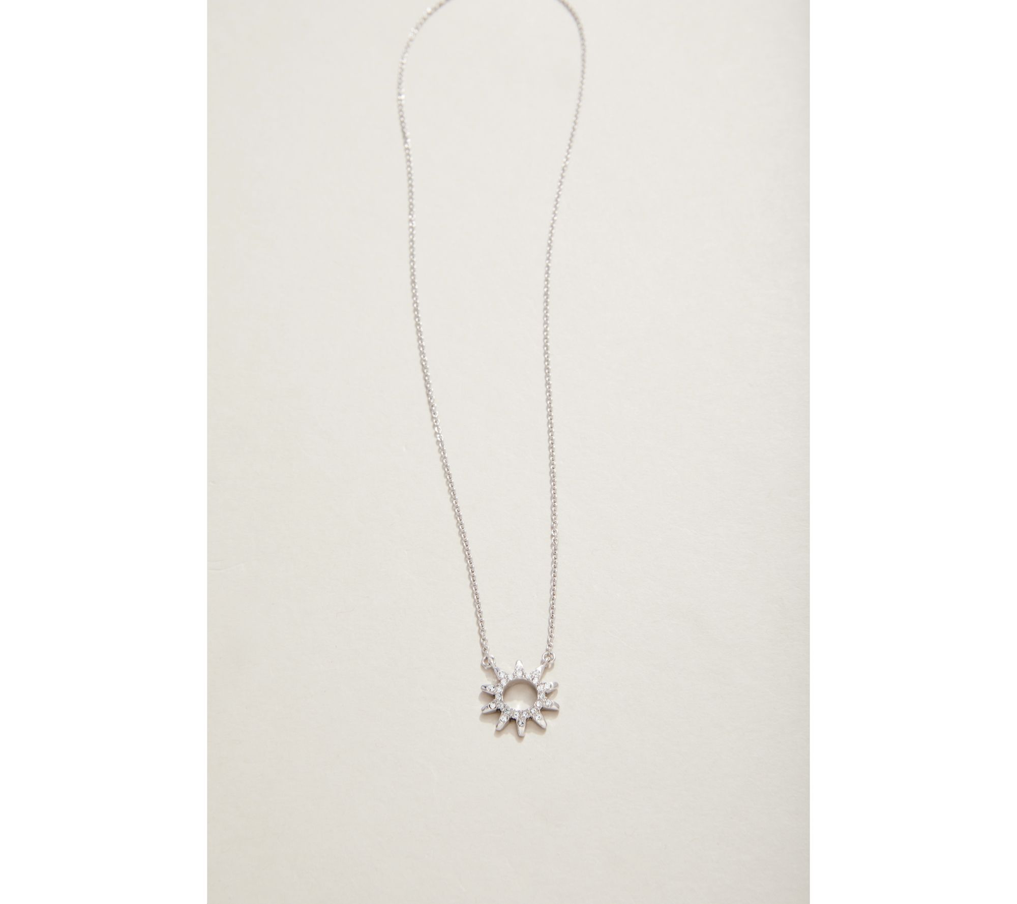 • Features round-cut simulated crystal; bezel-set in a sun-shaped charm; cable link chain