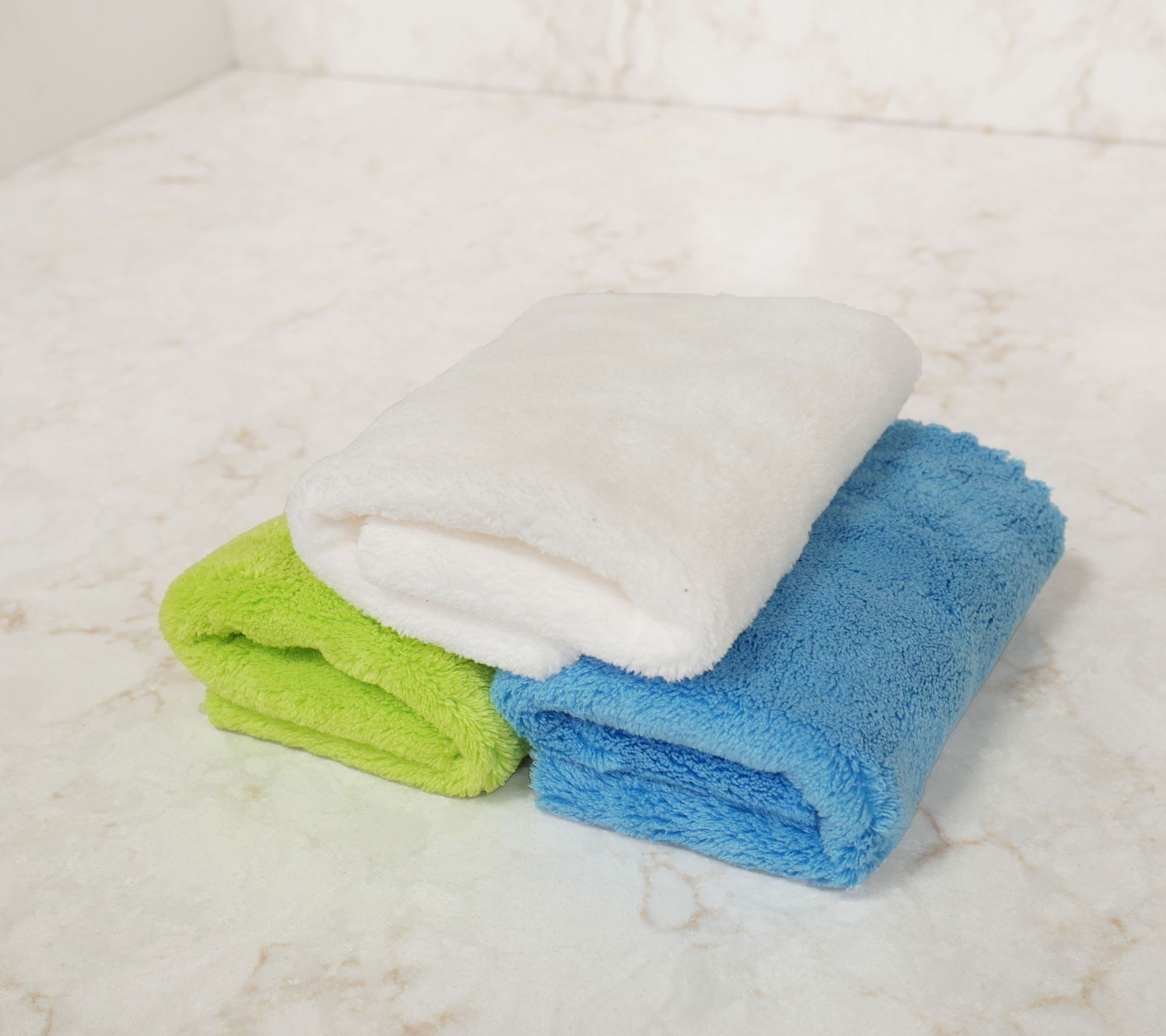 • Includes three microfiber towels and six sponges: two each of green tree, white reindeer, and blue snowflake