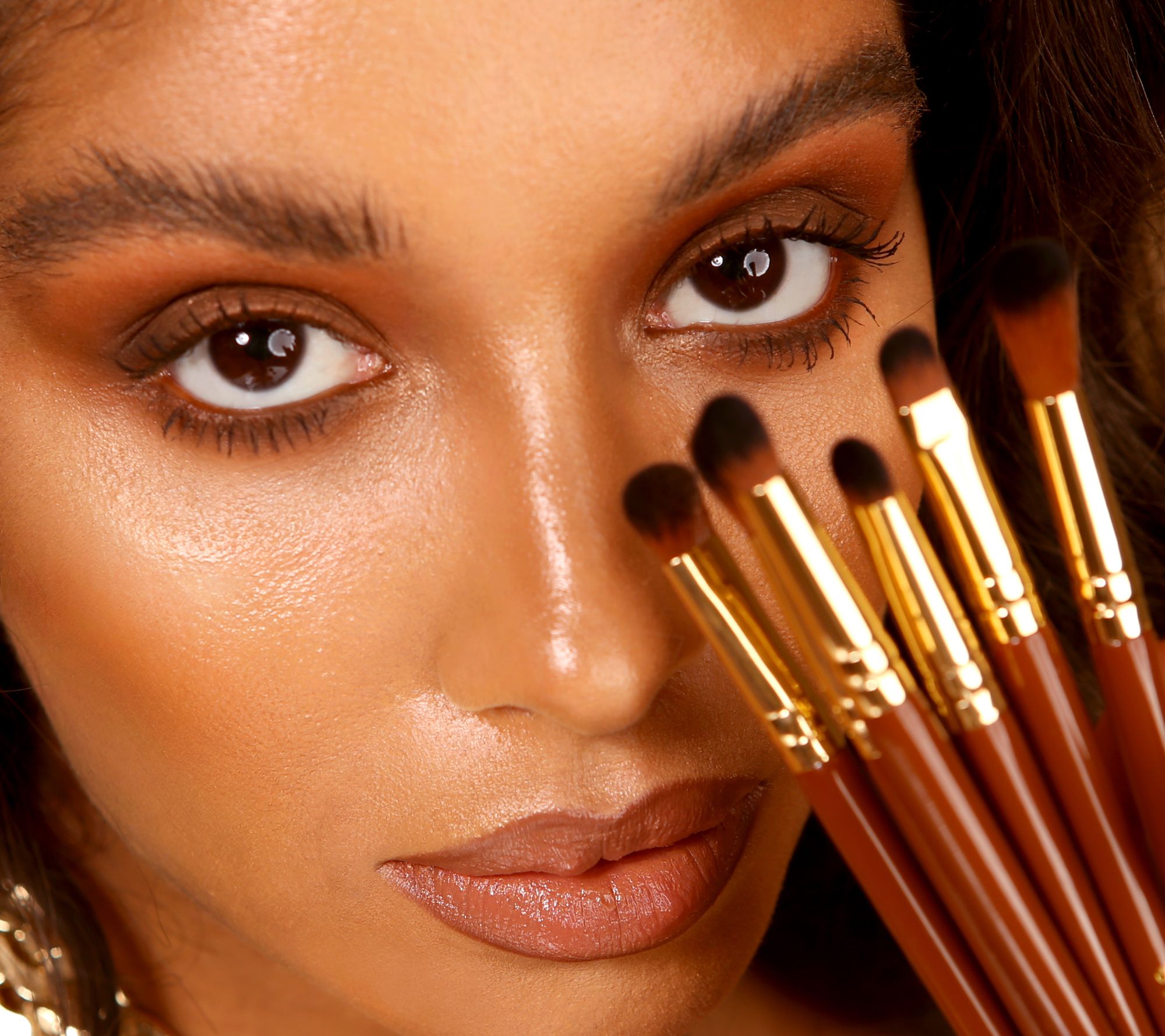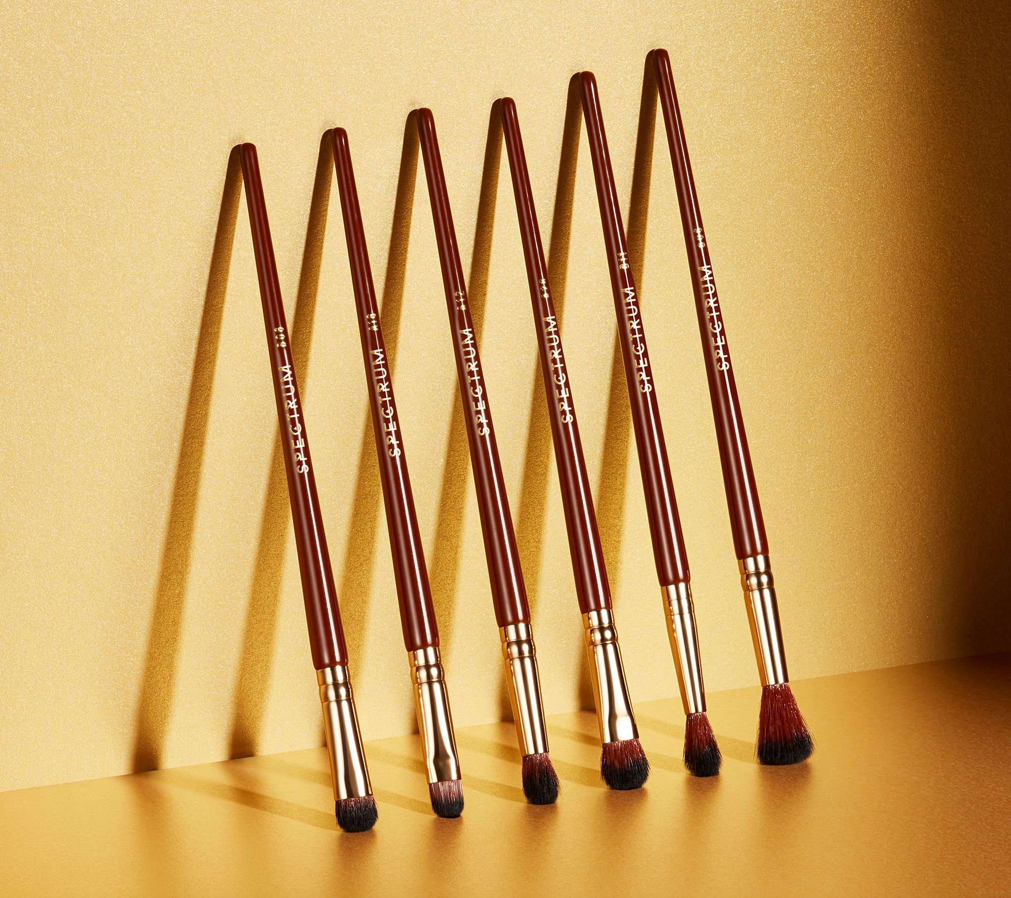 Create purr-fectly blended eye looks with this six-piece Pantherine eye brush set. This set includes two essential fluffy blenders for seamless transitions, a fluffy and a firm flat shader for precise color application, and two fluffy detail brushes to smoke out the crease and the lower lash line. The glossy caramel-toned handles are elegantly tapered and finished with shiny goldtone ferrules and logo detailing and come packaged in a re-usable EVA pouch. This brush set is made from synthetic hair. The bristles are velvety soft and oh-so gentle on the most sensitive skin. From Spectrum.