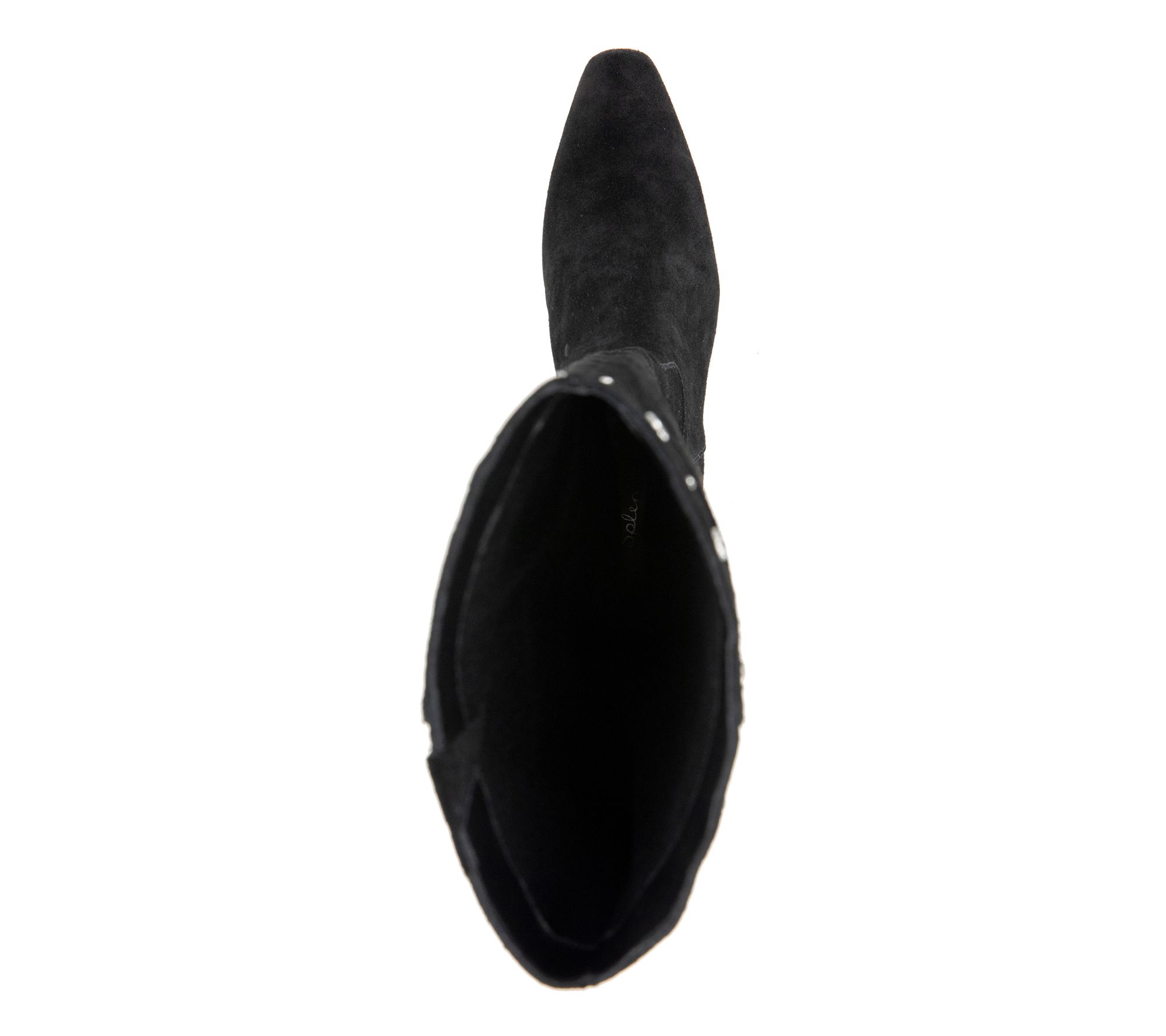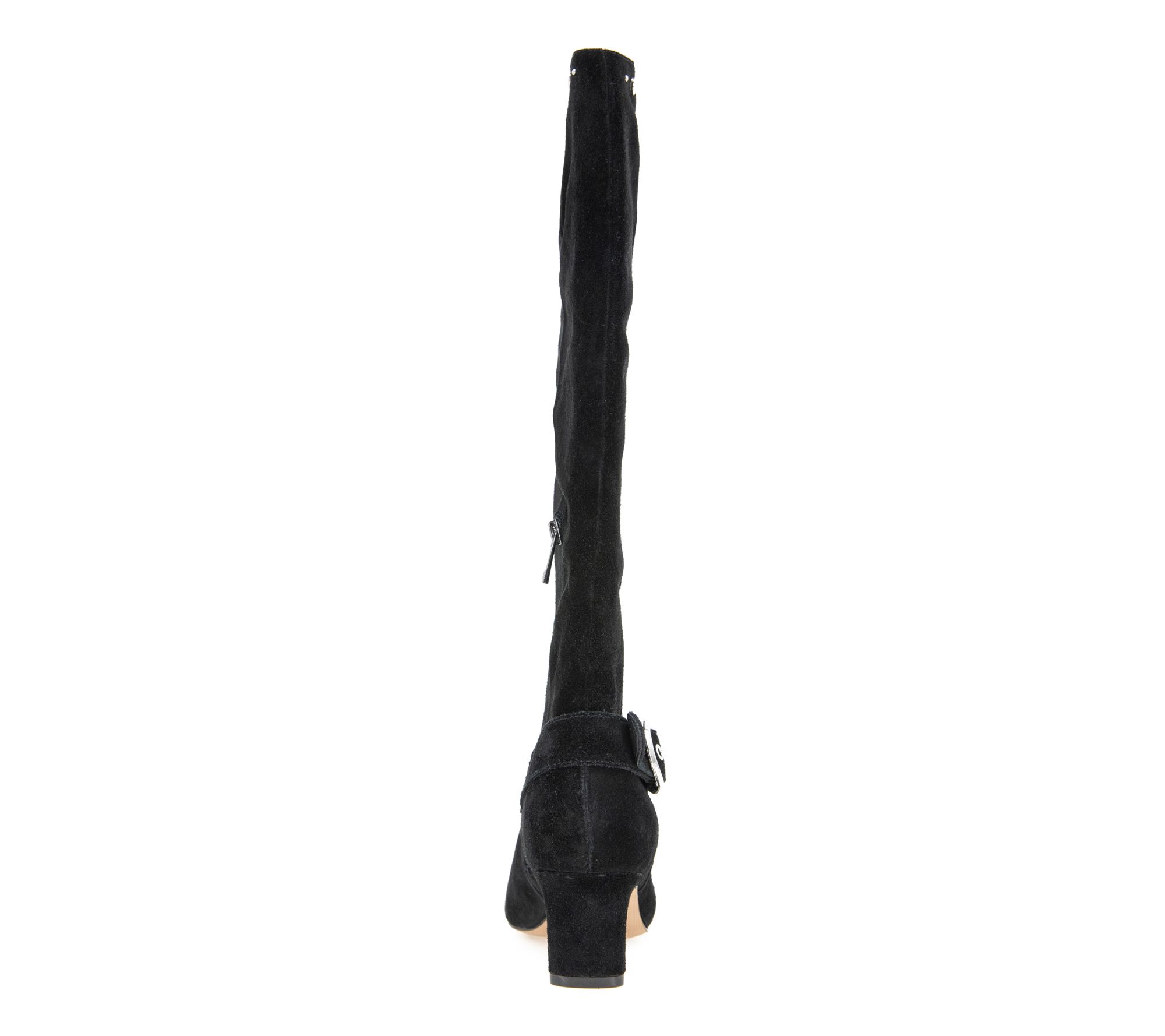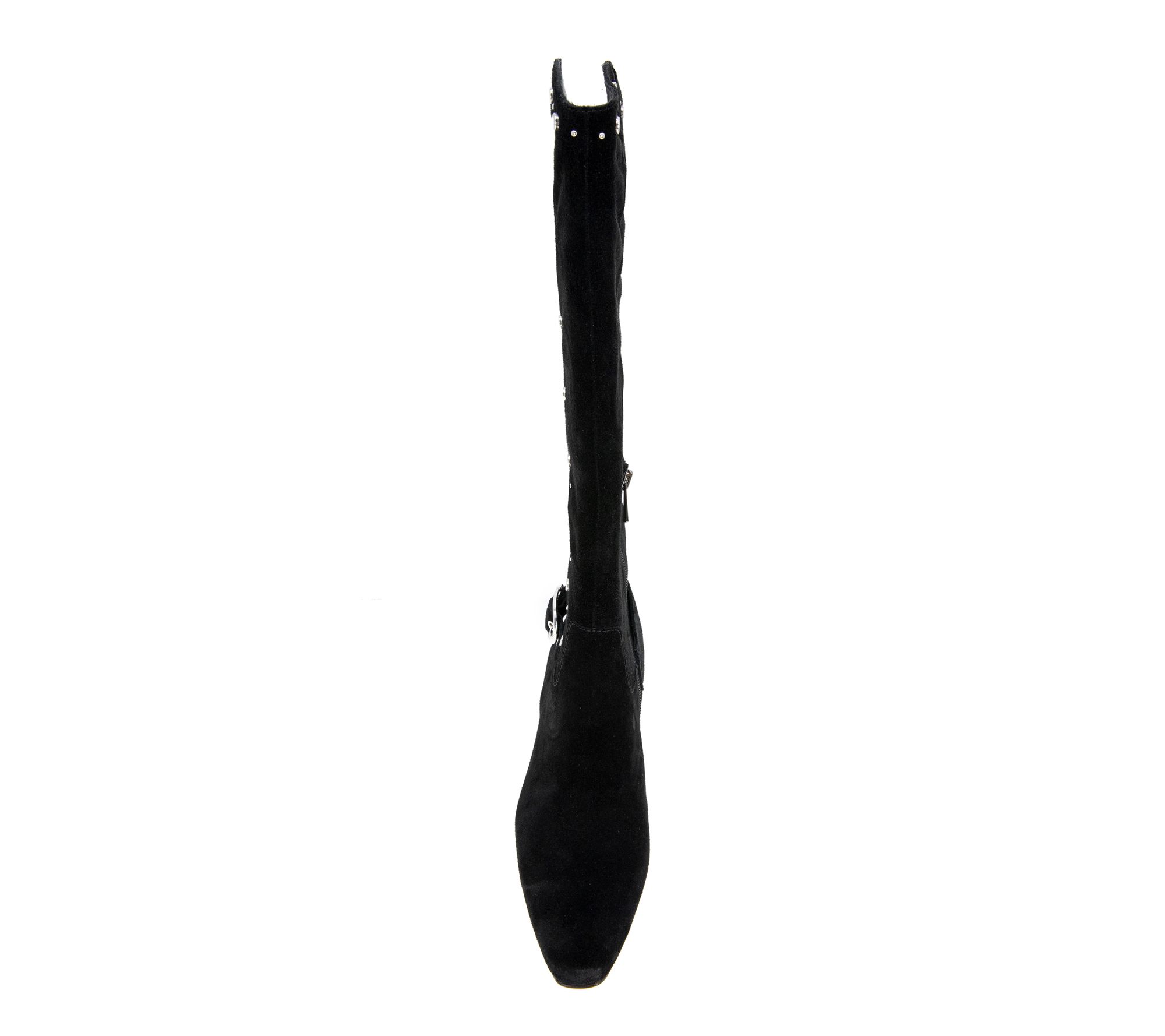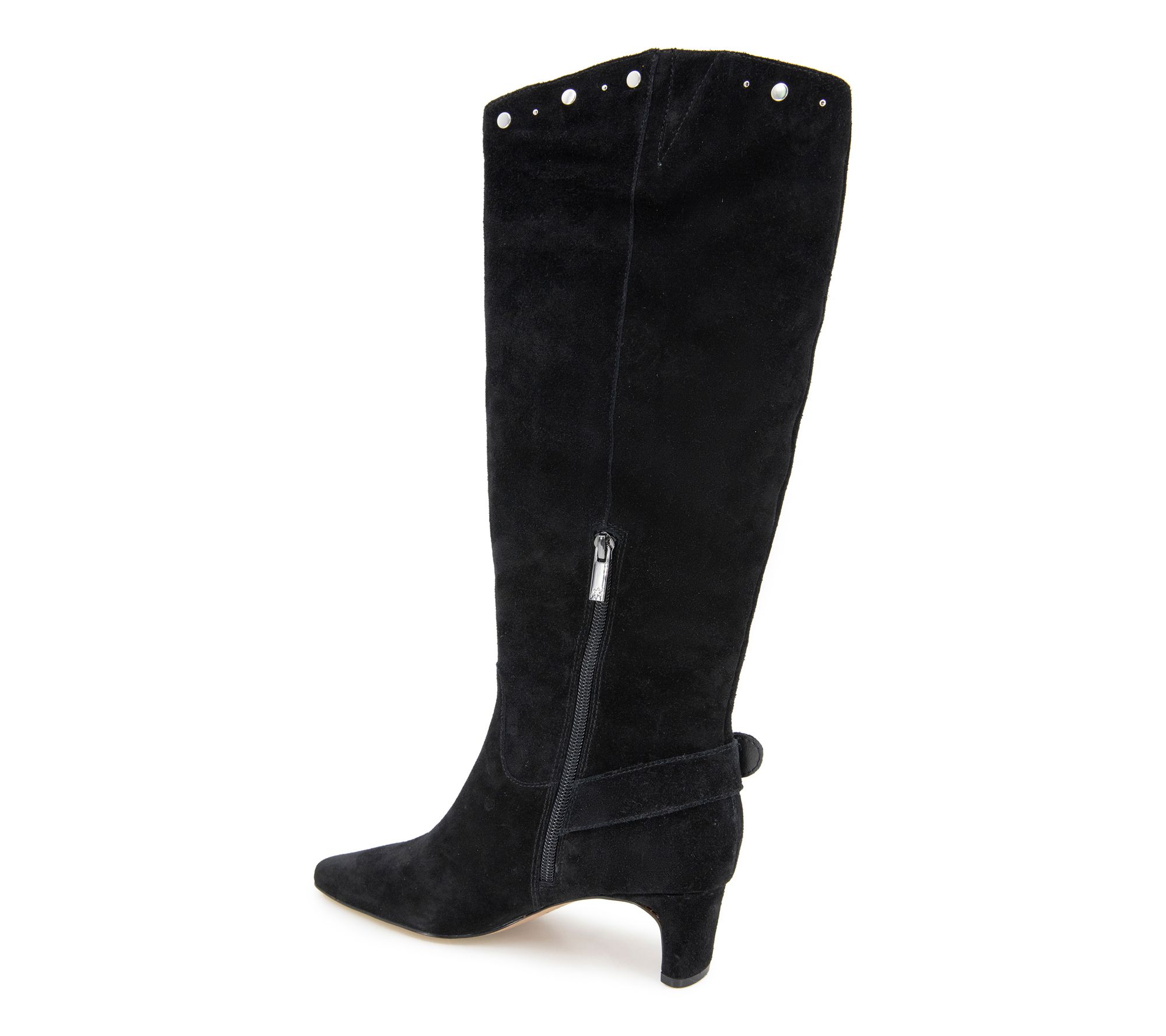 Suede upper, side zip entry, snip toe, stud detail, polished side buckle, knee high