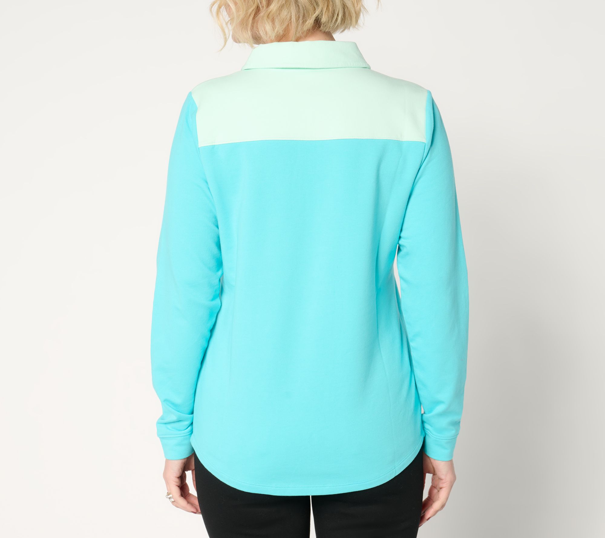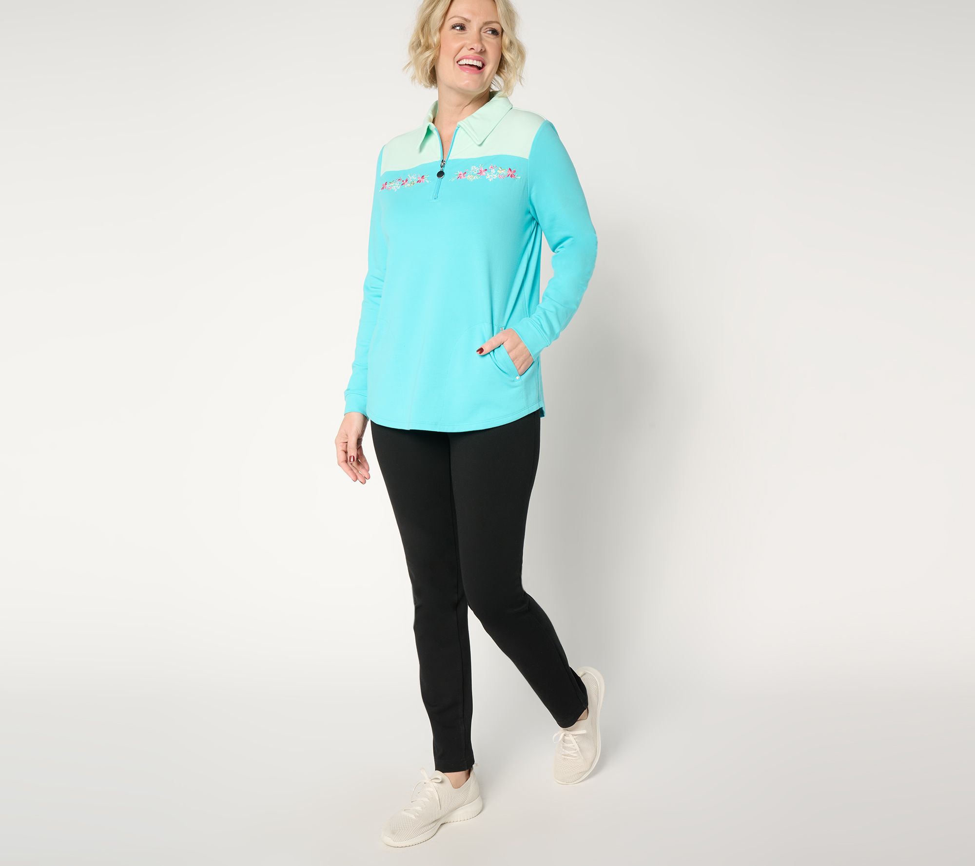 A delightful blend of style and comfort awaits with this Sport Savvy color blocked french terry pullover. Embellished with floral embroidery along the front yoke and featuring a practical 3/4-zip design, it strikes the perfect balance between elegance and ease. With handy pockets and a semi-fitted silhouette, this pullover will quickly become a staple in your wardrobe. From Sport Savvy.