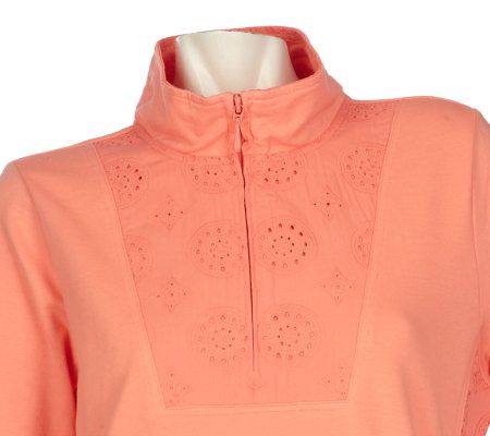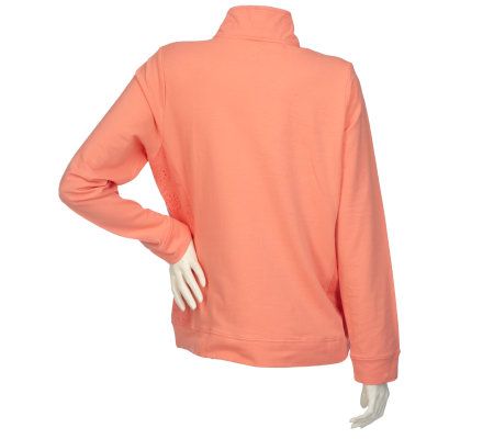 Comfy enough for lounging, fashionable enough to sport all day long. With an updated mandarin collar and woven eyelet trim, this pullover is a perfect seasonal staple. From Sport Savvy(R) Activewear.
