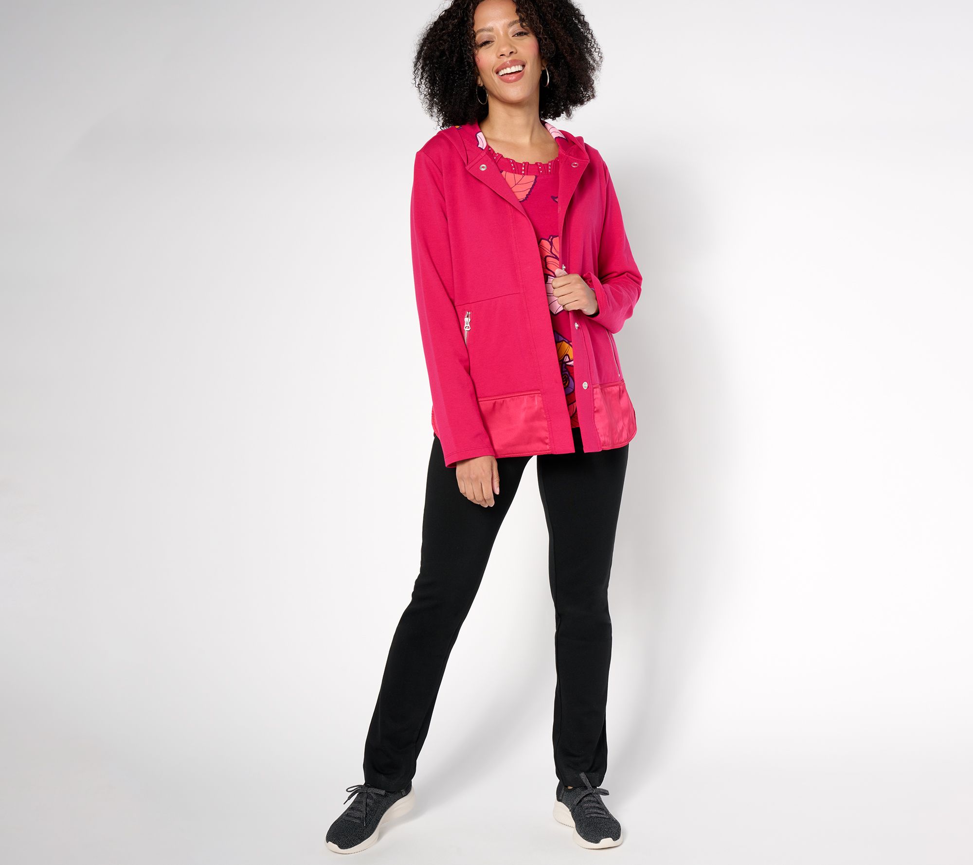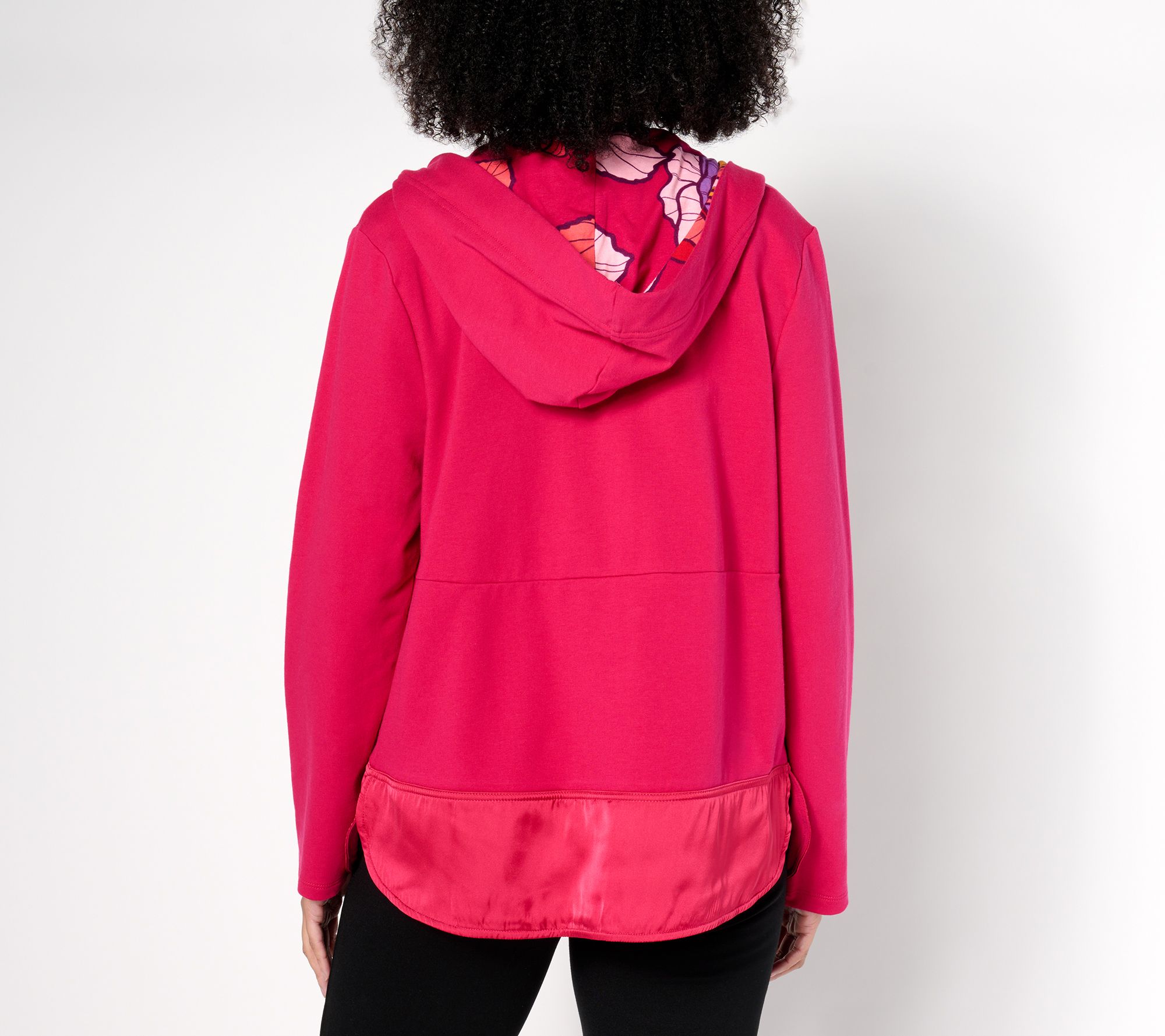 Casual days call for the effortless charm of this French terry and satin hooded jacket. Perfect for errands around town, afternoon strolls, or lounging at home, this semi-fitted piece blends comfort and style with its unique satin details and a printed hood lining. From Sport Savvy.