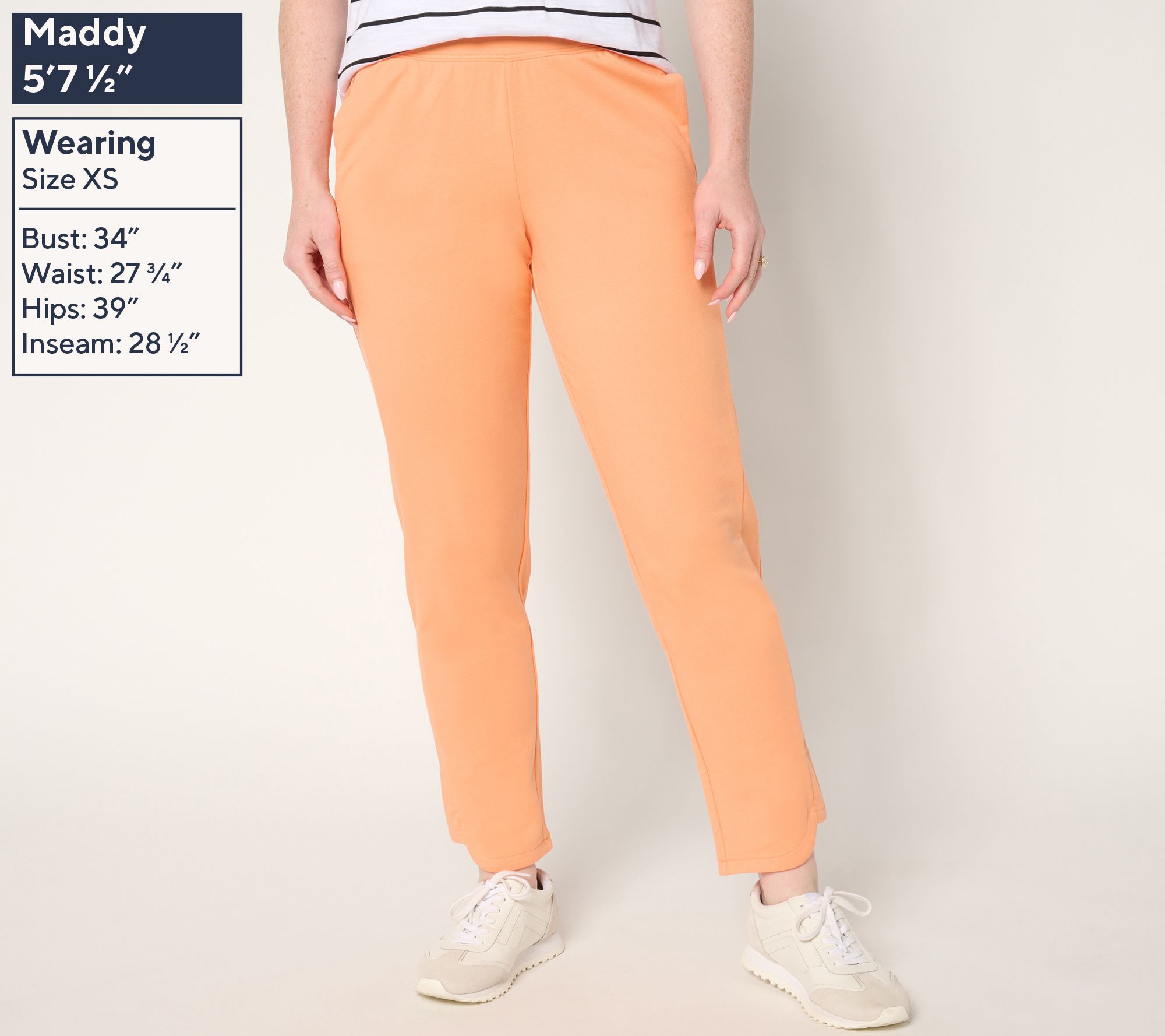 Features: French terry, full-length pants with dolphin hem, slightly shorter side panel detail, side pockets, elasticated waistband