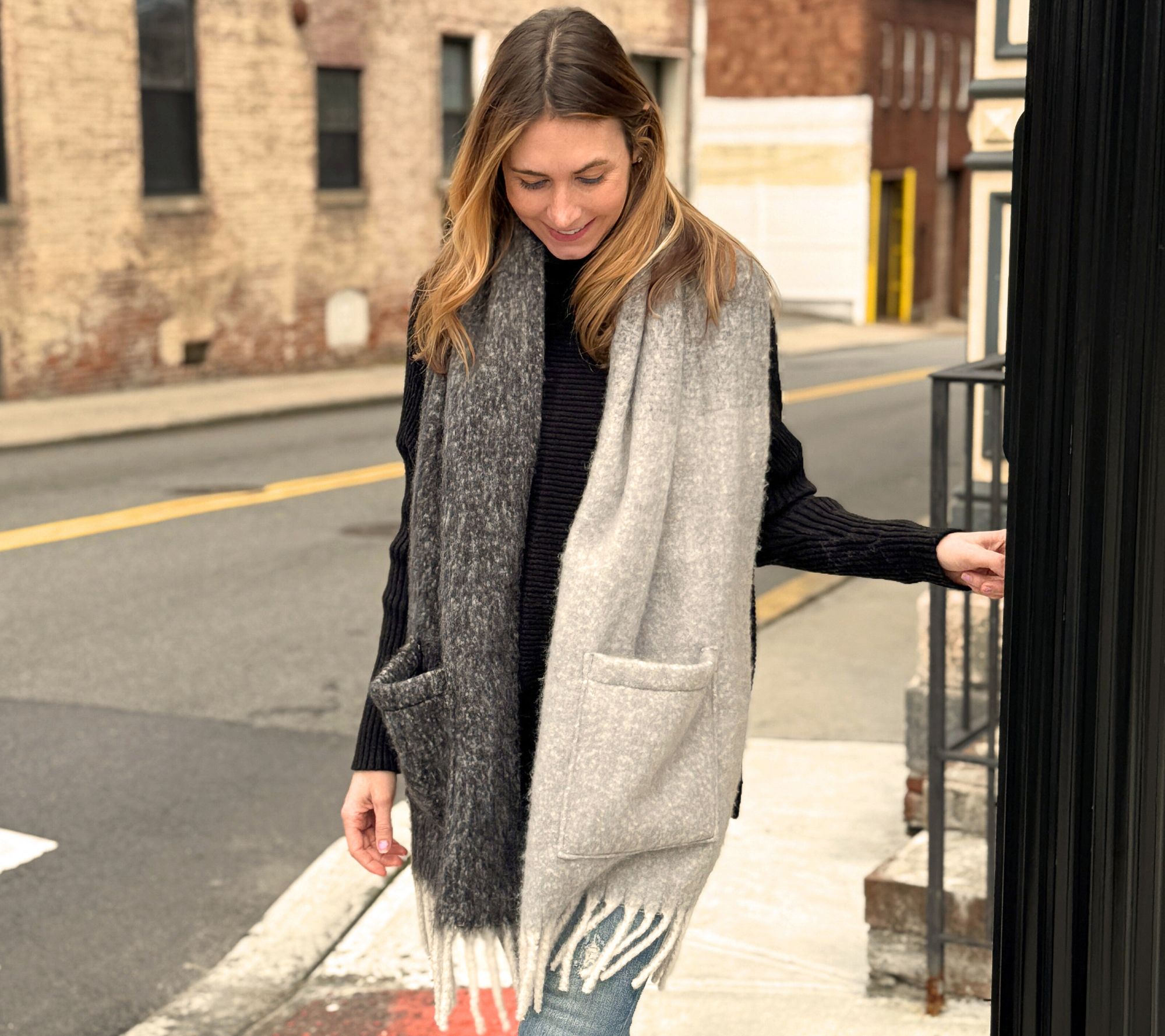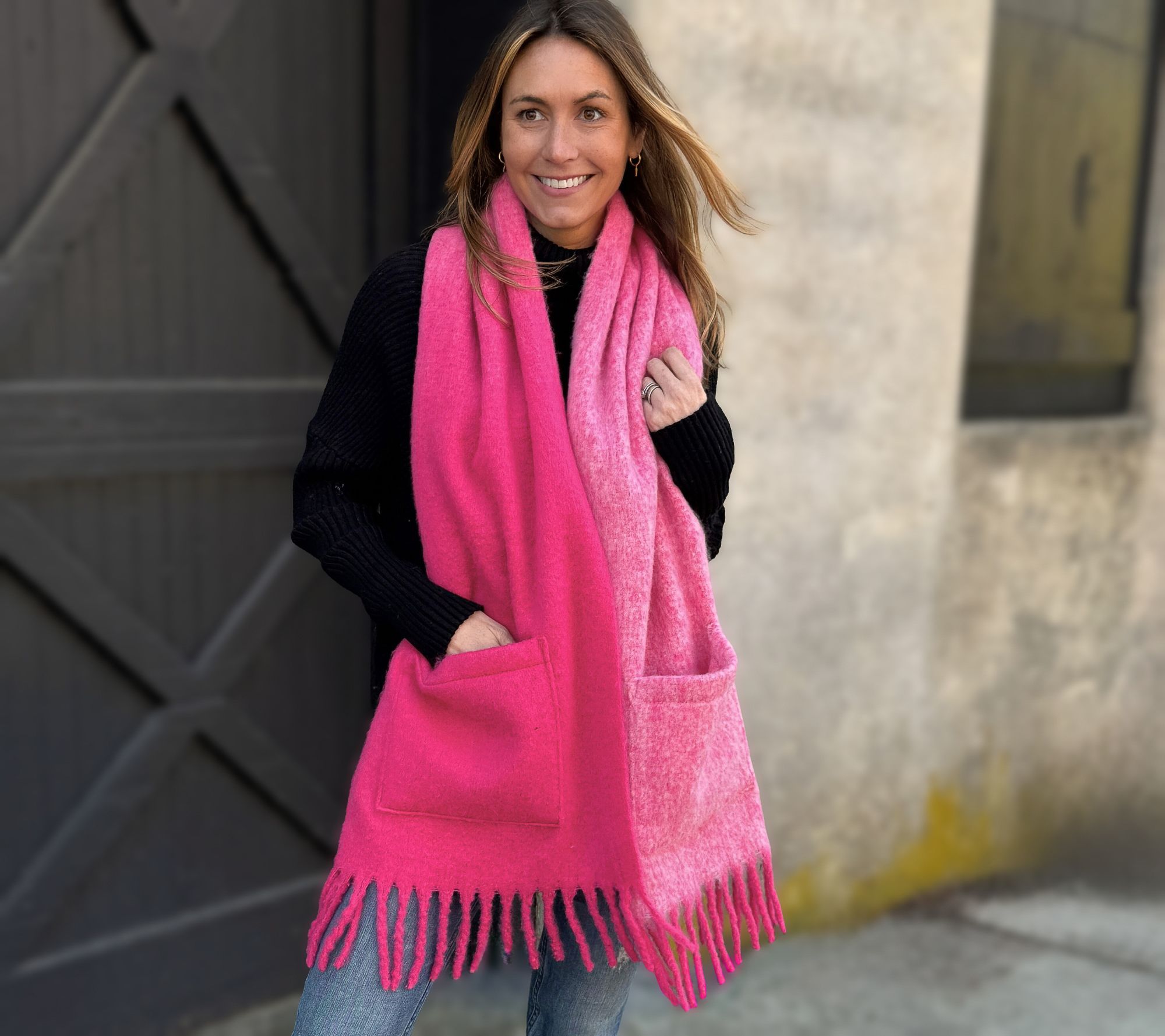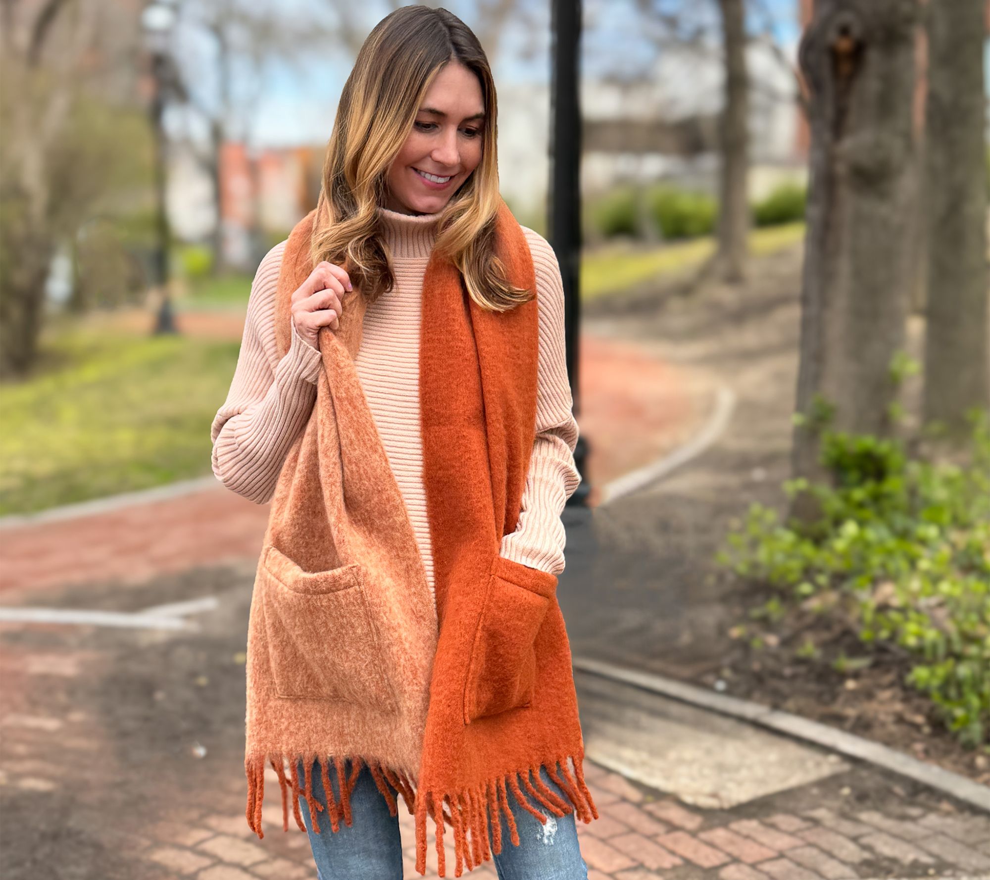 Leave the purse behind. Go hands-free on your next stroll or errand-run with this pocket scarf. The ombre design and fringe accents add chic style while the handy patch pockets let you stash your essentials. Don't you just love a double-duty accessory? From Sprigs.