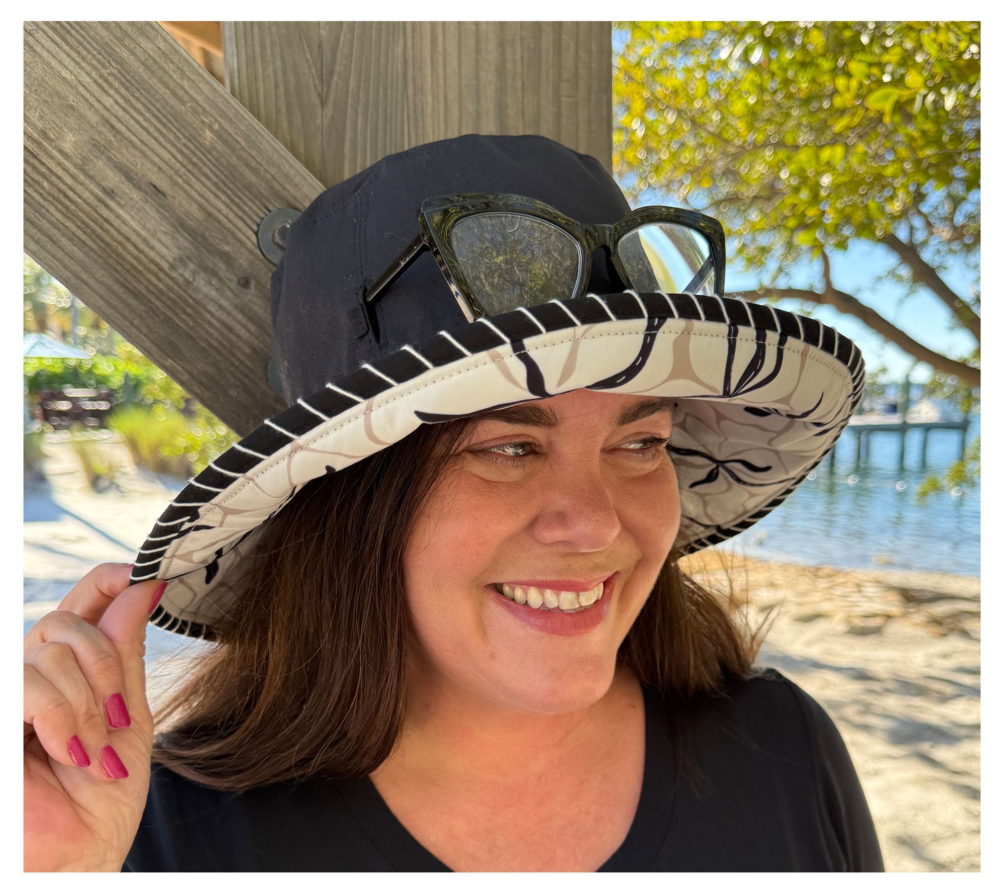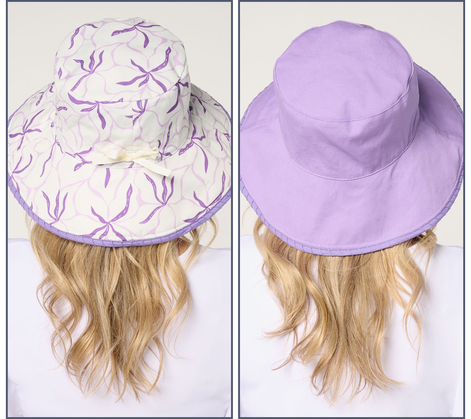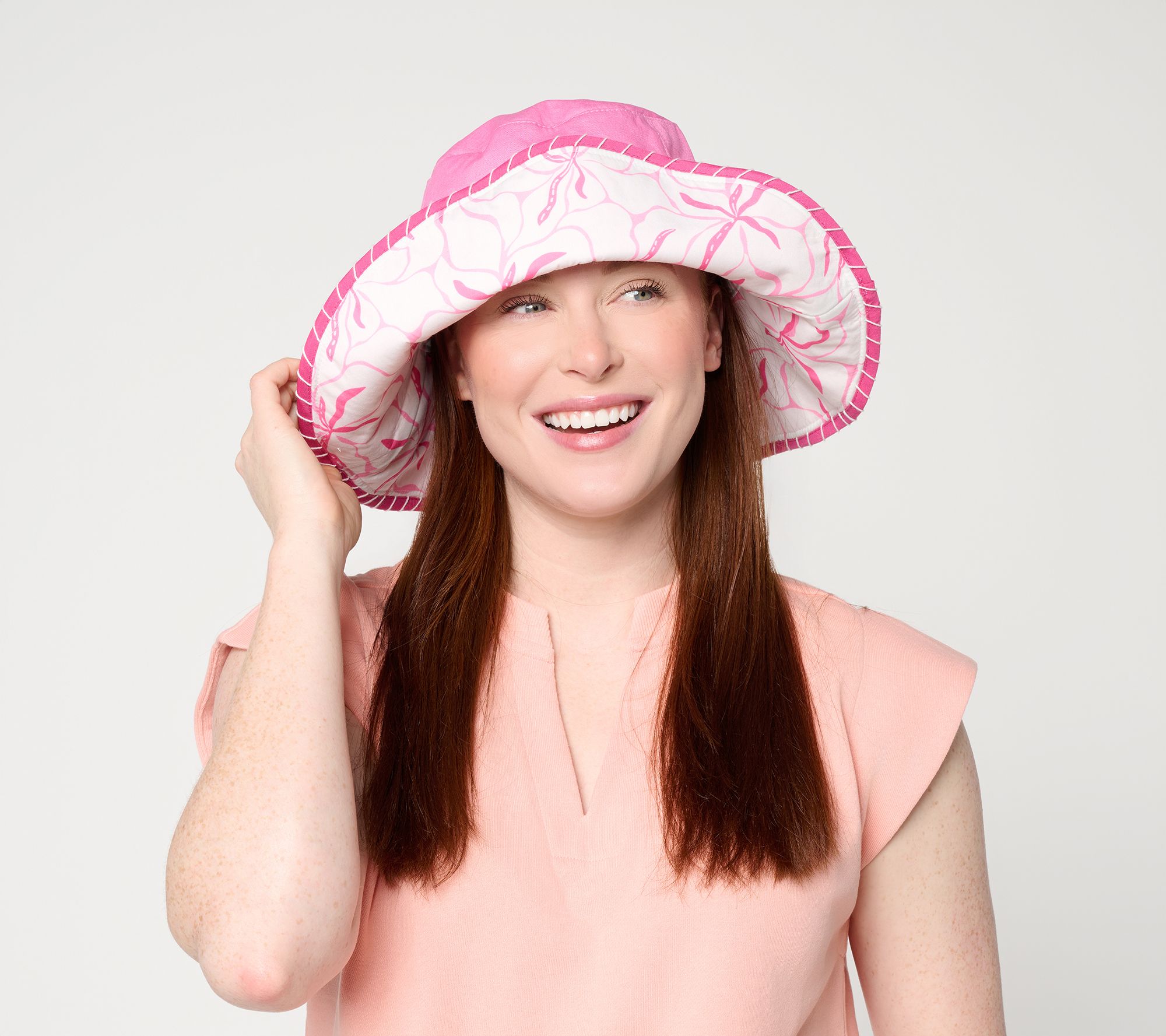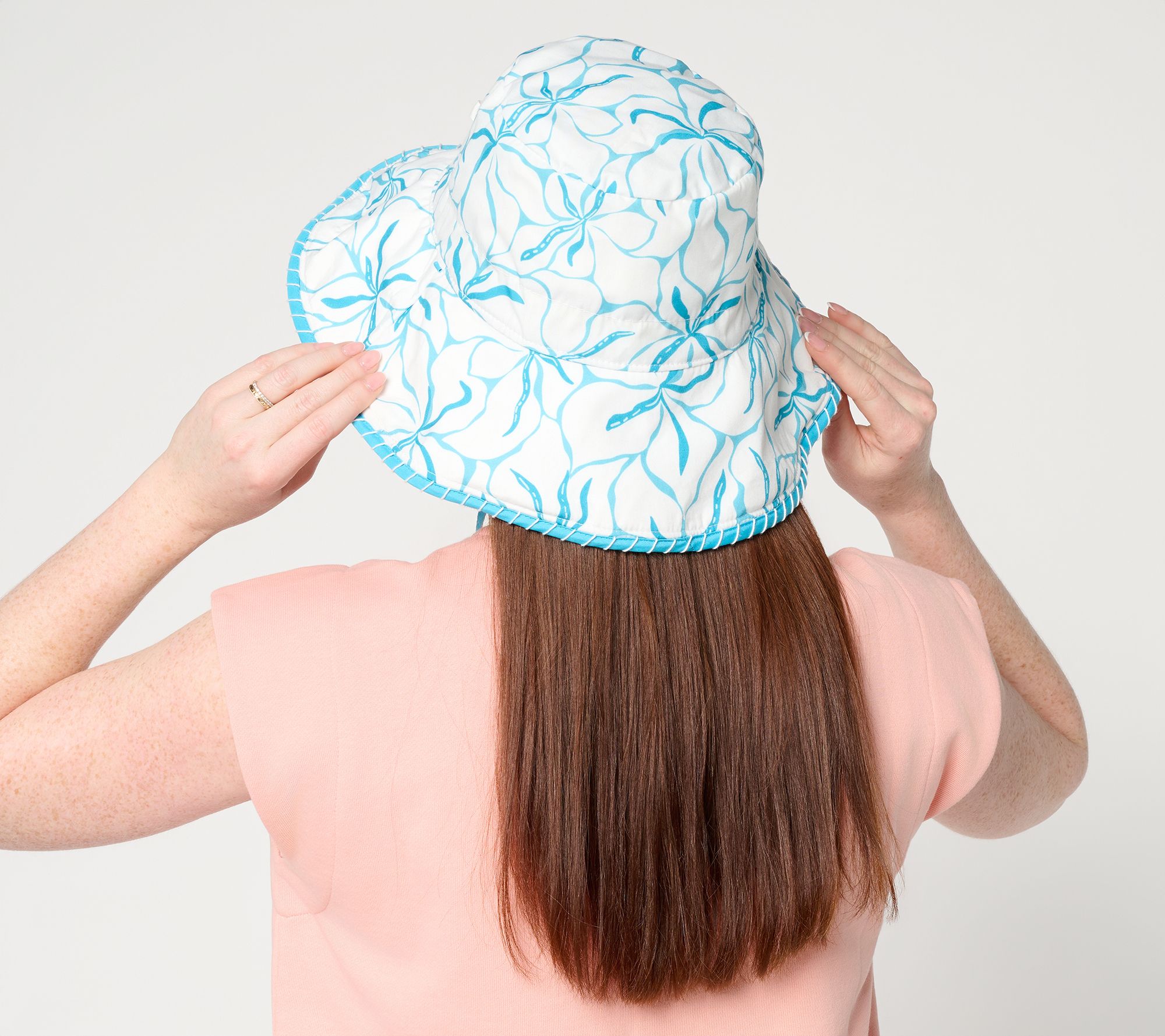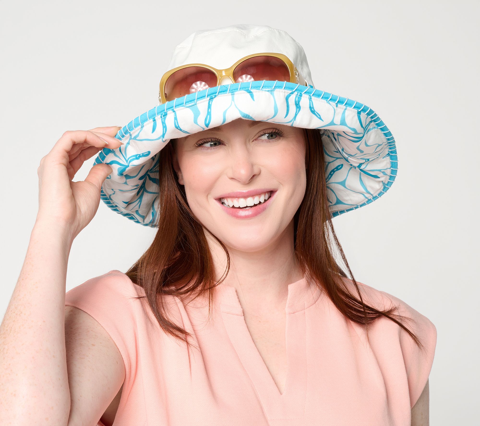 Cute and comfy, this reversible sun hat celebrates the warmer weather in fab fashion. Whether you're stepping outside in the solid color or switching to the playful pattern for an afternoon stroll, the delightful design makes sure you stay shady (and the adjustable pull tie gives you a customized fit). Whipstitch detailing and sunglass slits complete the laidback look. From Sprigs.