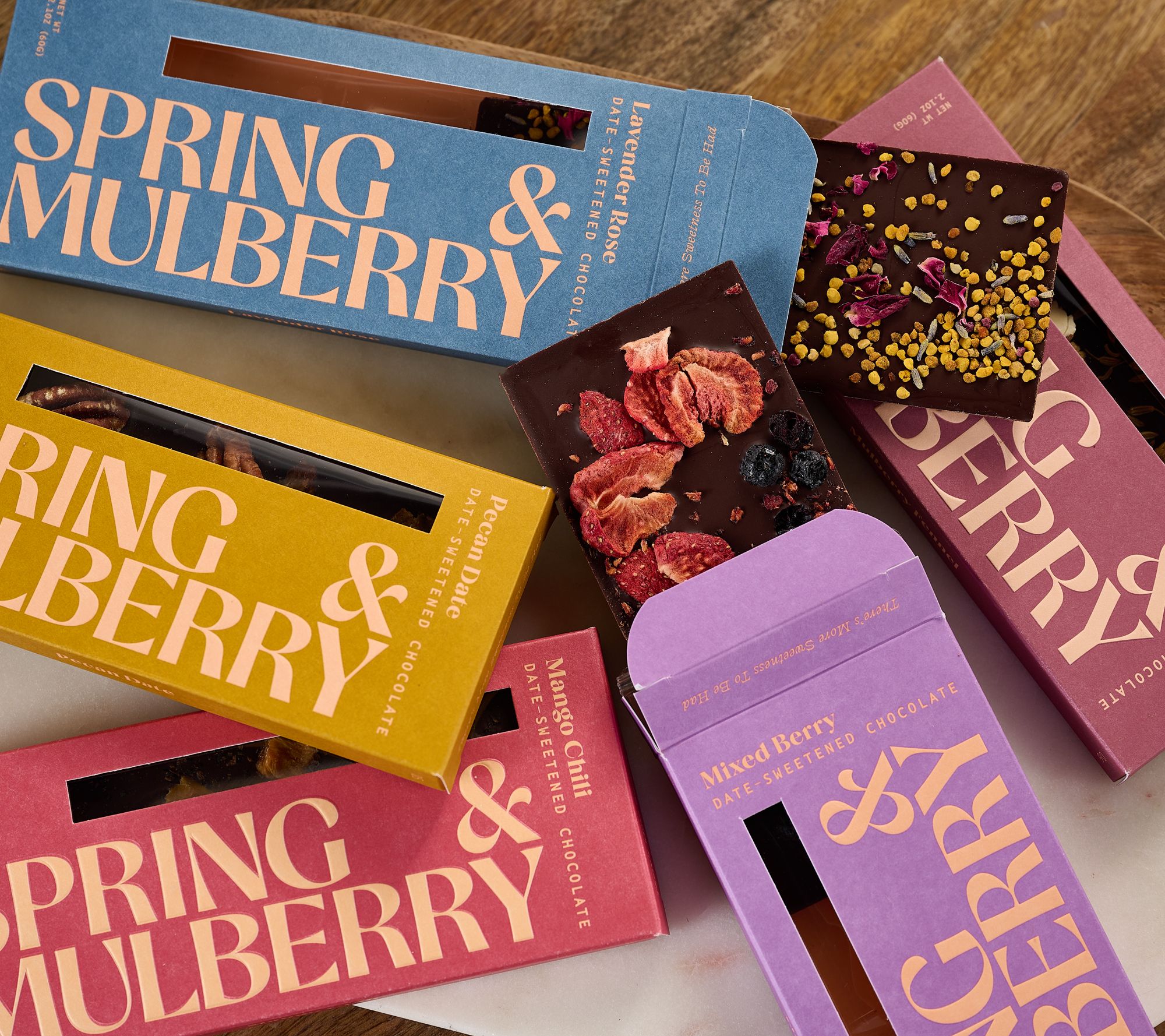 Delight your senses with the Spring & Mulberry dark chocolate bars, sweetened only with dates and adorned with fruits, nuts, florals, and spices. Perfect for gifting or indulging, these bars offer a unique and flavorful experience. From Spring & Mulberry.