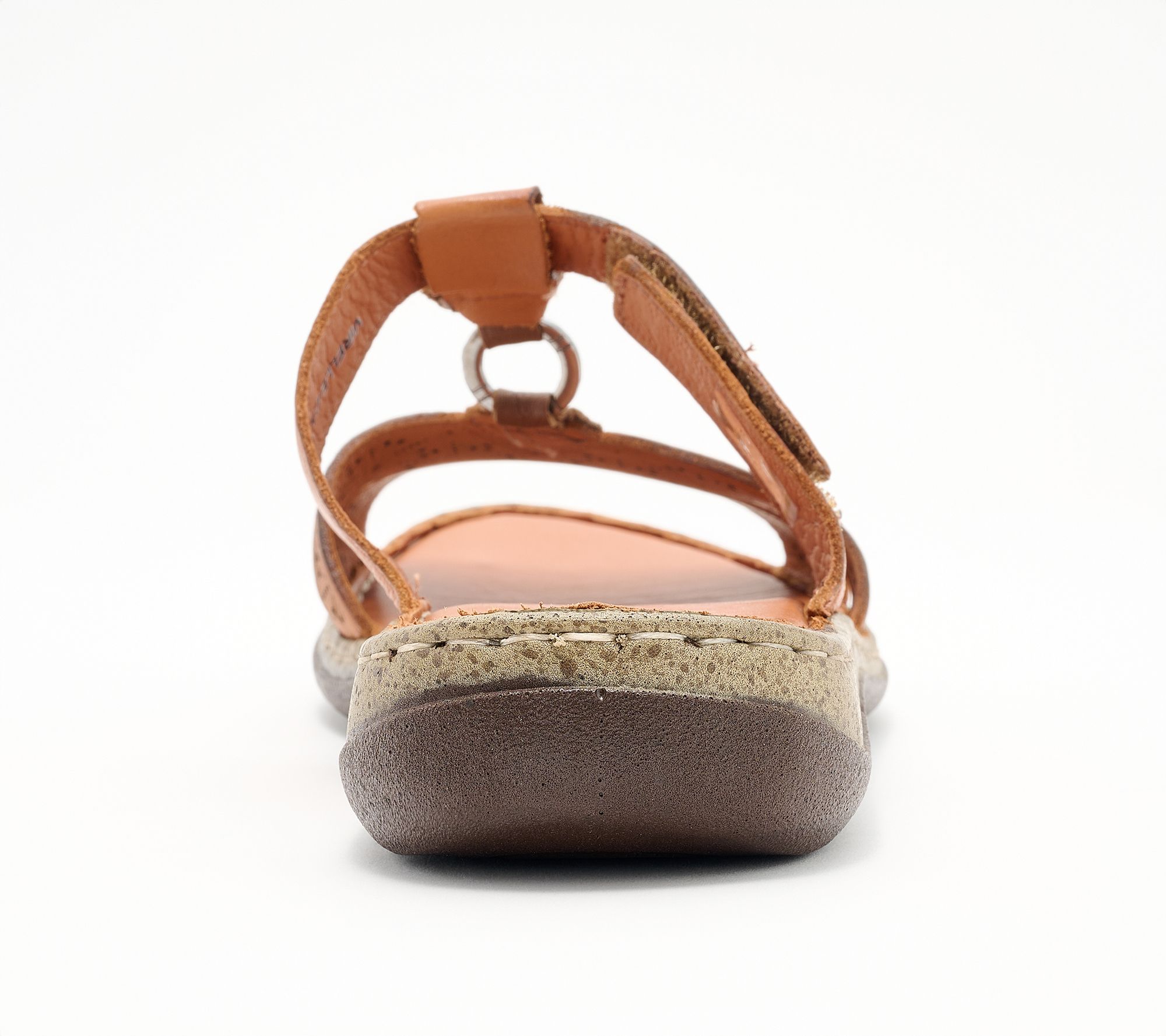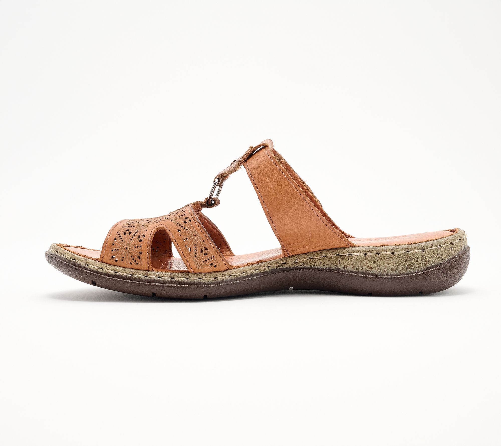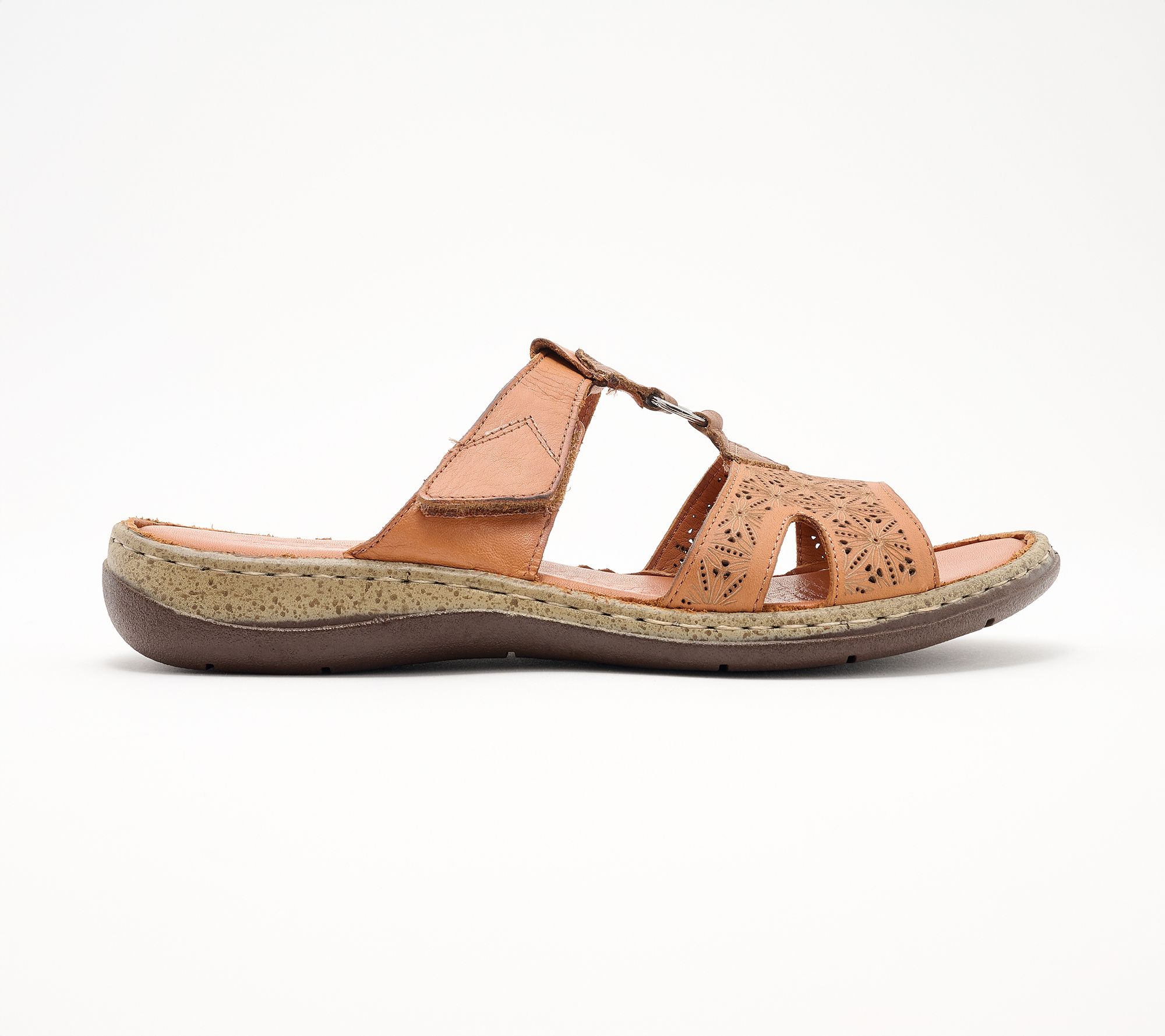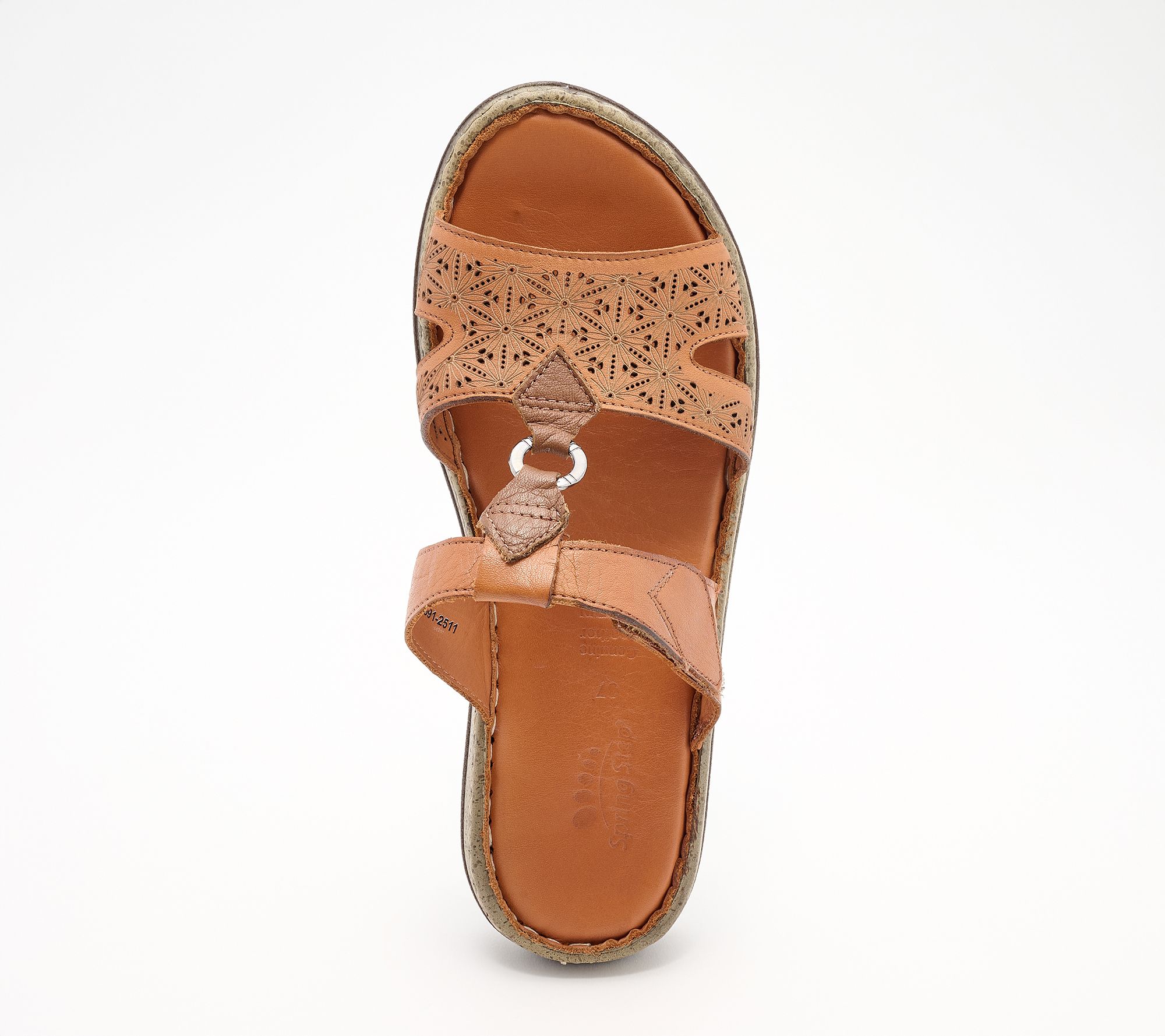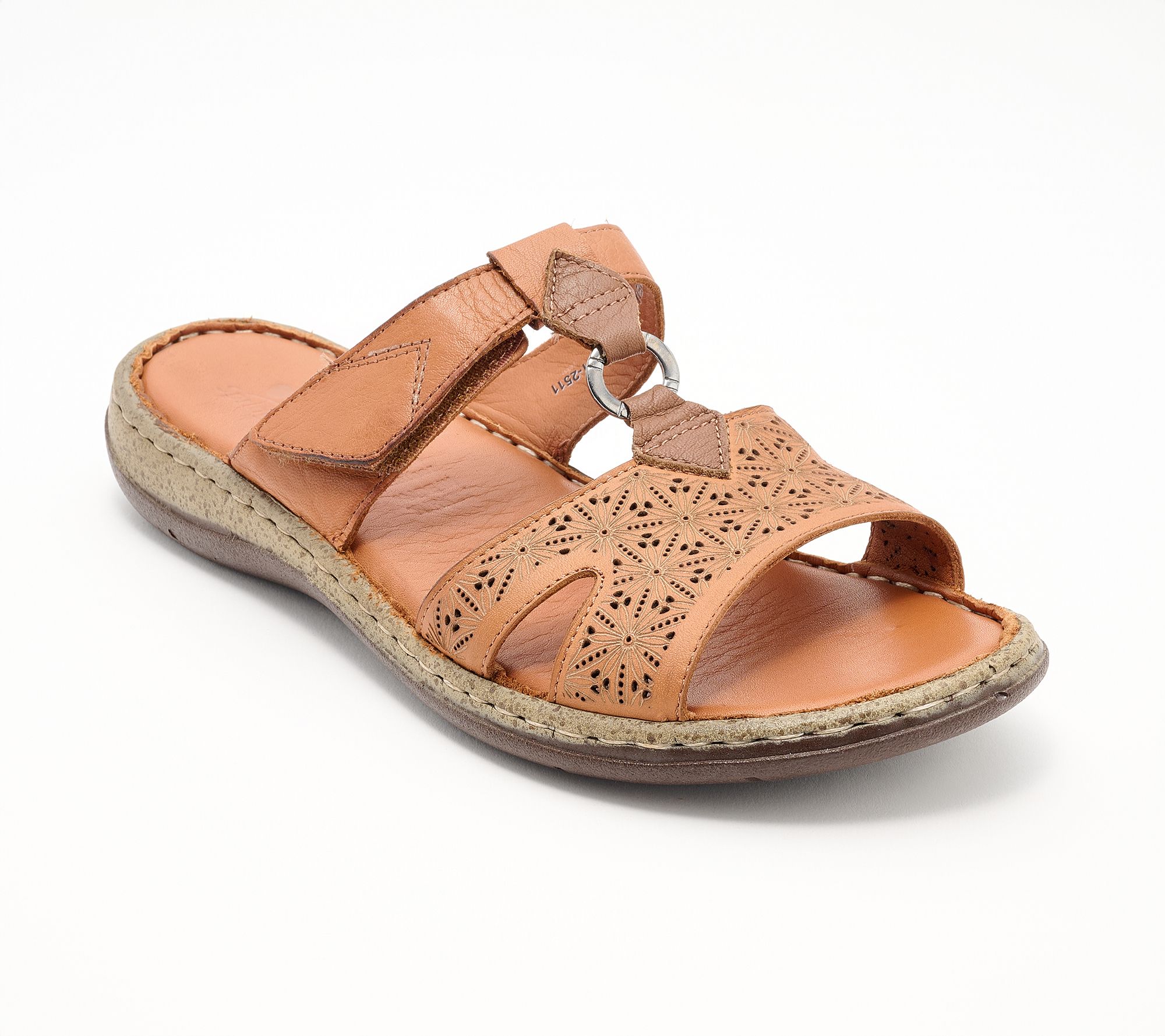 Spring Step Leather Slide Sandals - Virelle With a genuine leather upper featuring precise laser-cut patterns for breathability and understated style, this sandal has an adjustable hook and loop closure for ease and fit, a padded leather insole, and flexible outsole. Heel Height: 1 1/4 in. Sole Thickness: 1/4 in. COO: Imported. Fits small, we recommend to size up. Content: Leather Upper, Polyurethane Outsole. Footbed not removable.