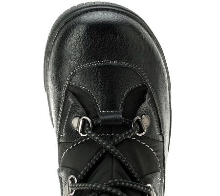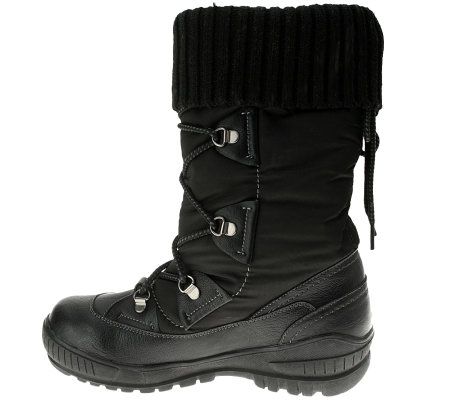 • Waterproof; external lacing grommets; sweater-like cuff on top of boot; stable boot with good traction for winter conditions